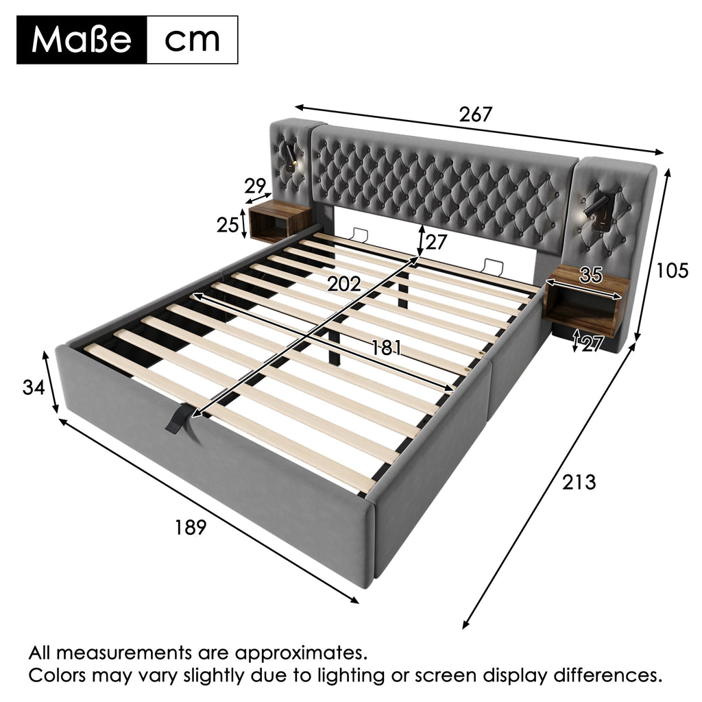 Unique Design: This bed features a headboard with two nightstands, a reading lamp with USB and Type-C charging functions, and a hydraulic storage bed.