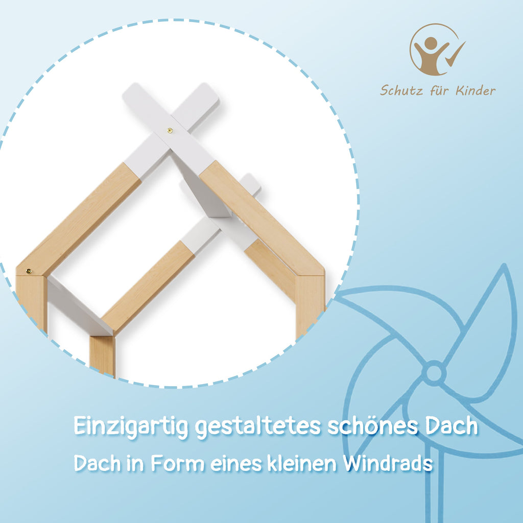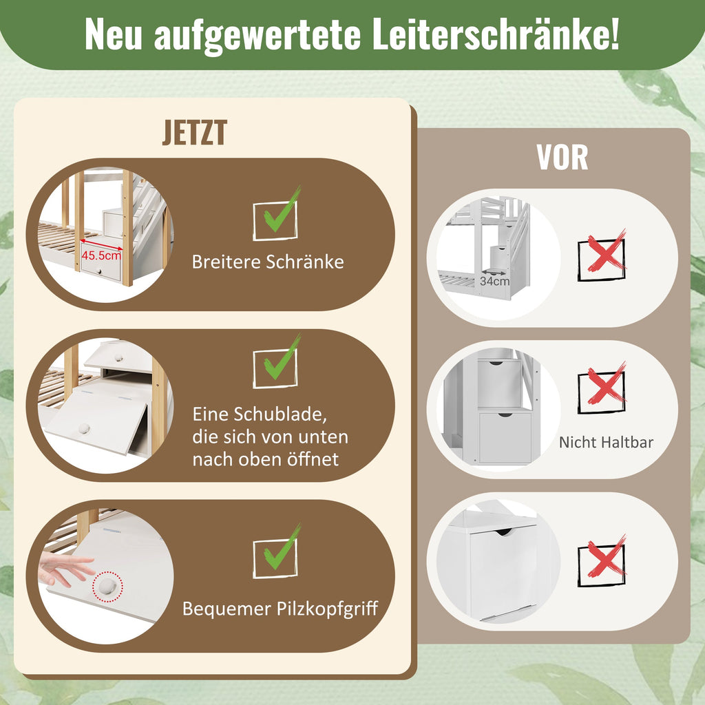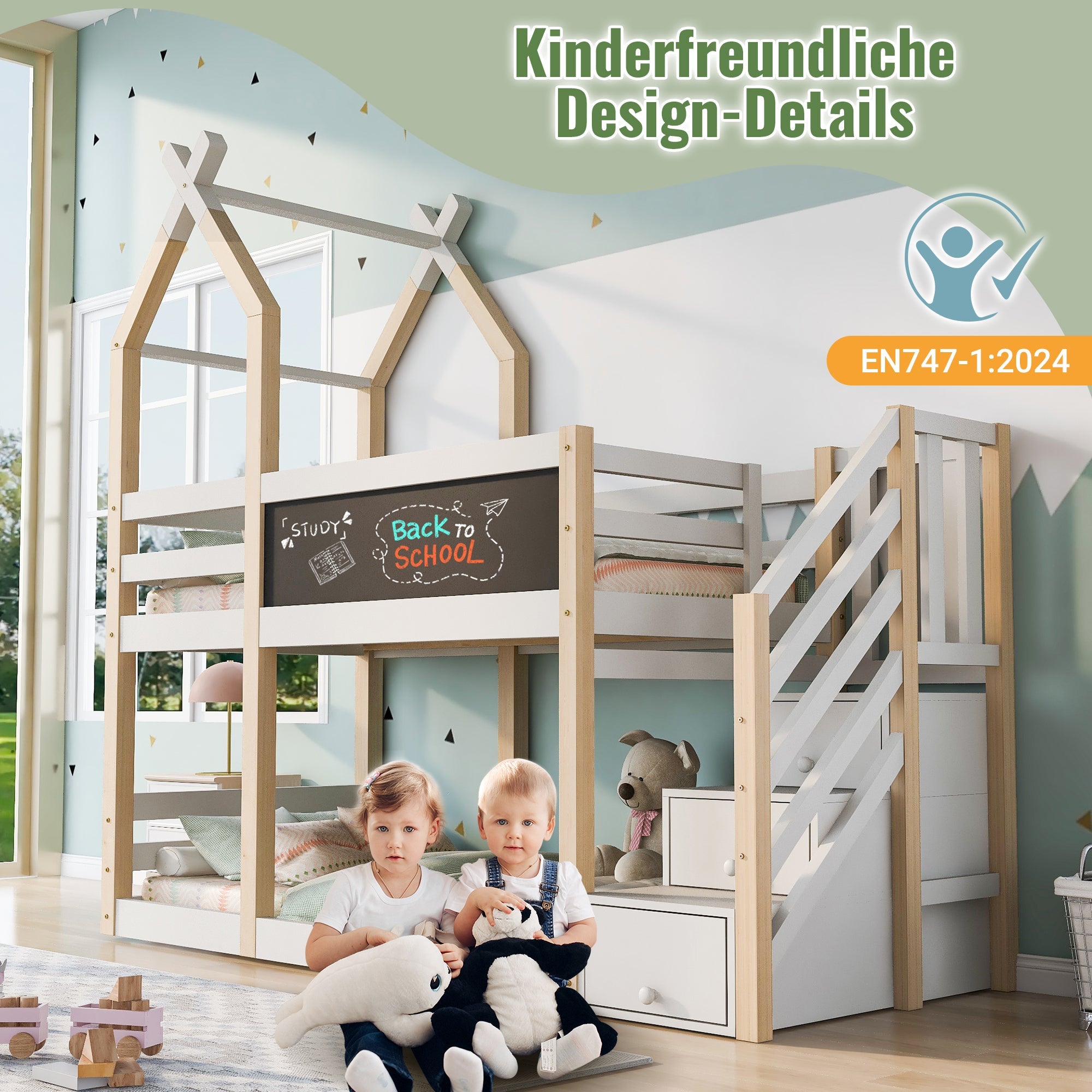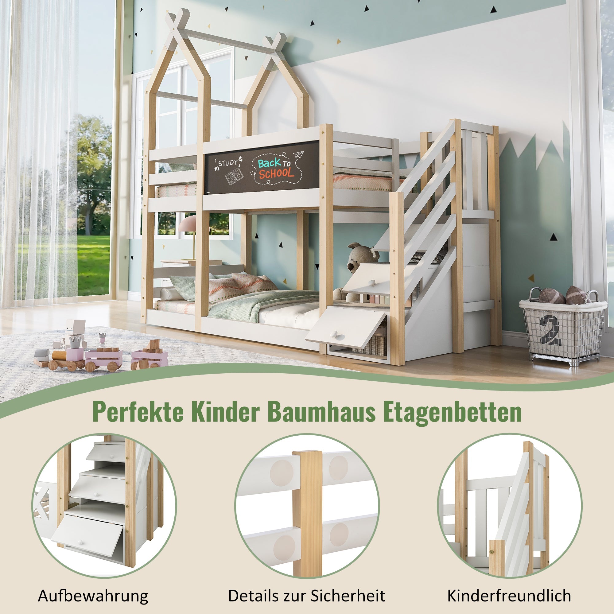 Bunk Bed 90x200, Treehouse Design with Blackboard, Storage, Fall Protection, Loft Bed for Kids, 2x Slatted Frames - Natural & White