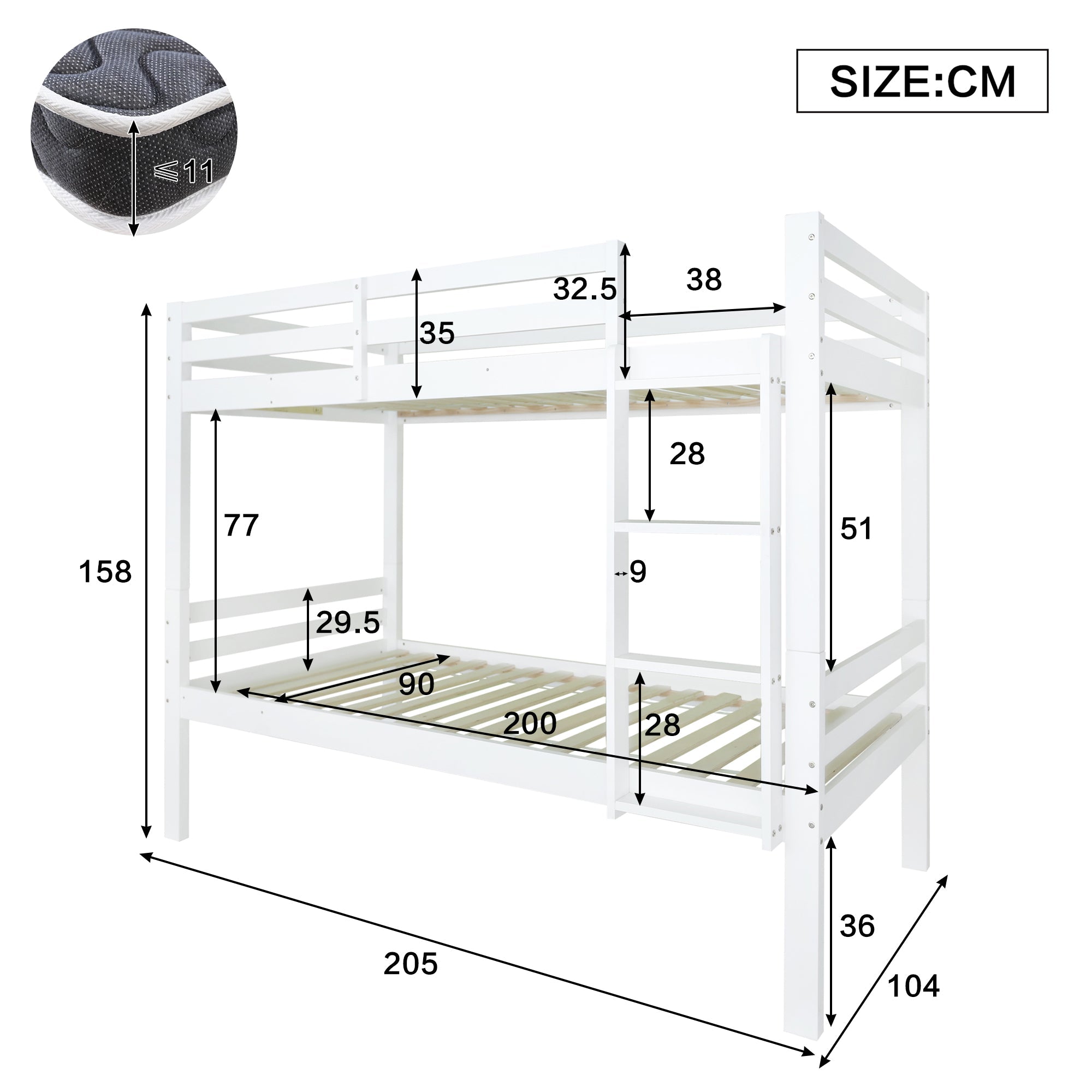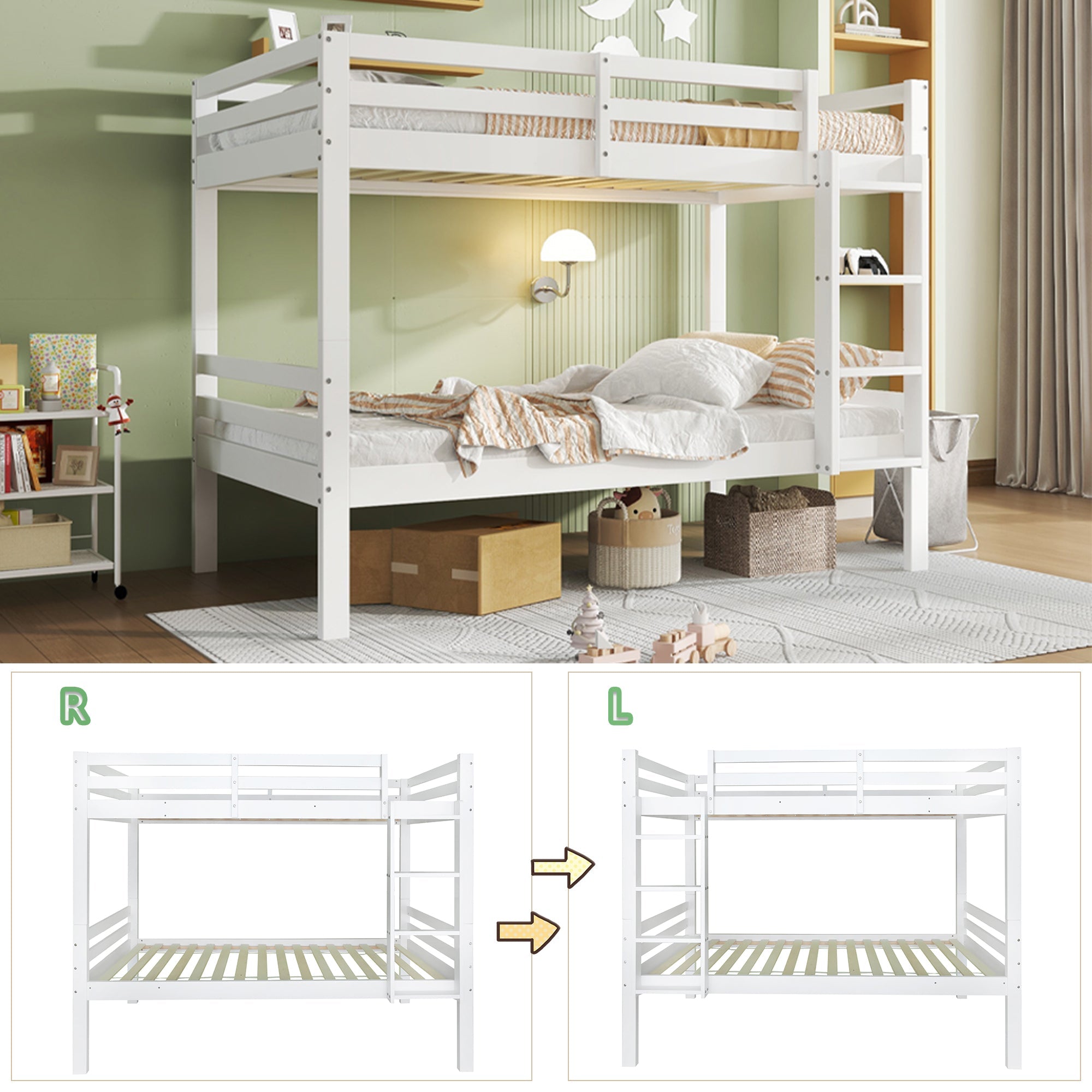 Bunk Bed for Children, Angled Ladder Fall Protection Divisible 2 Single Beds, Pine Frame White 90x200cm