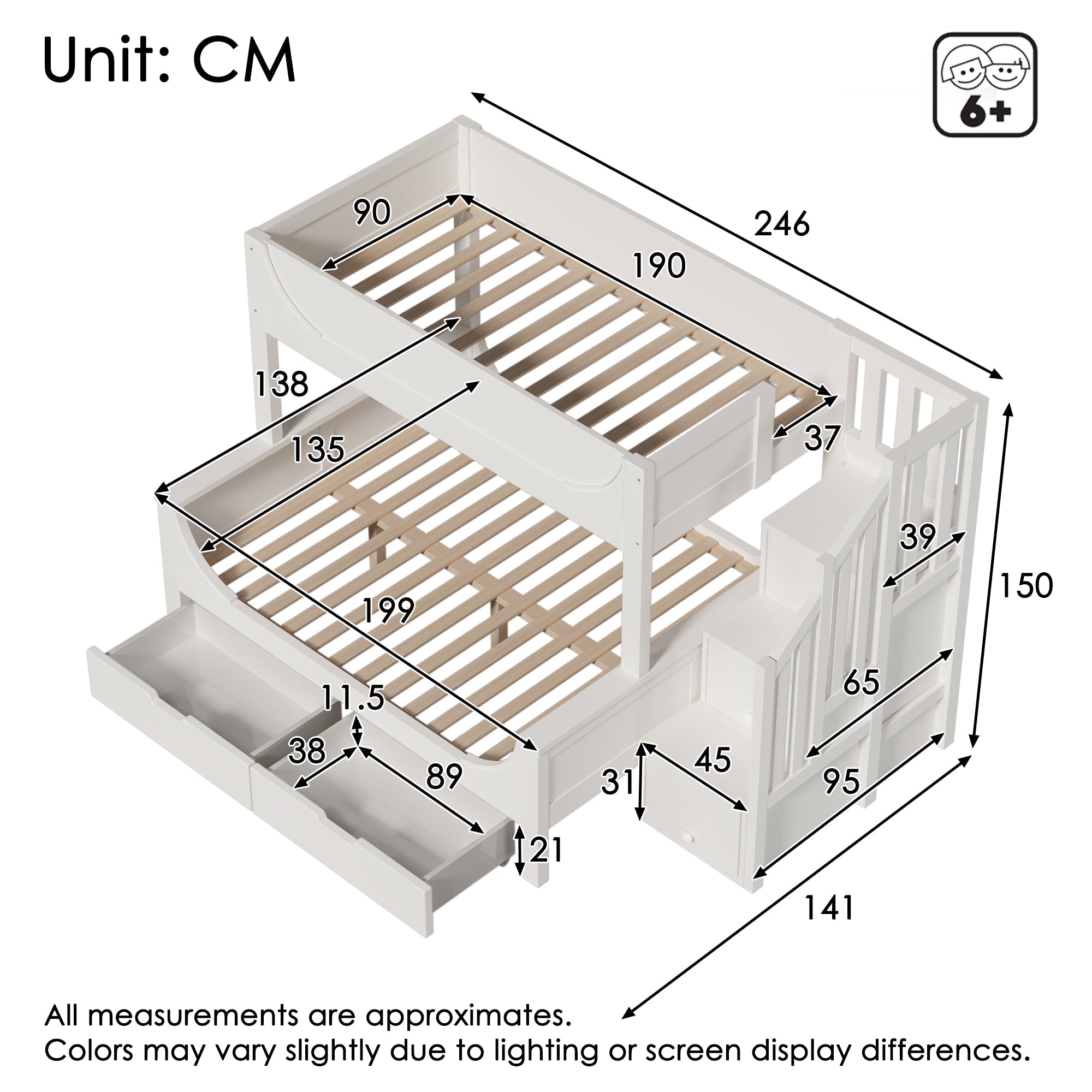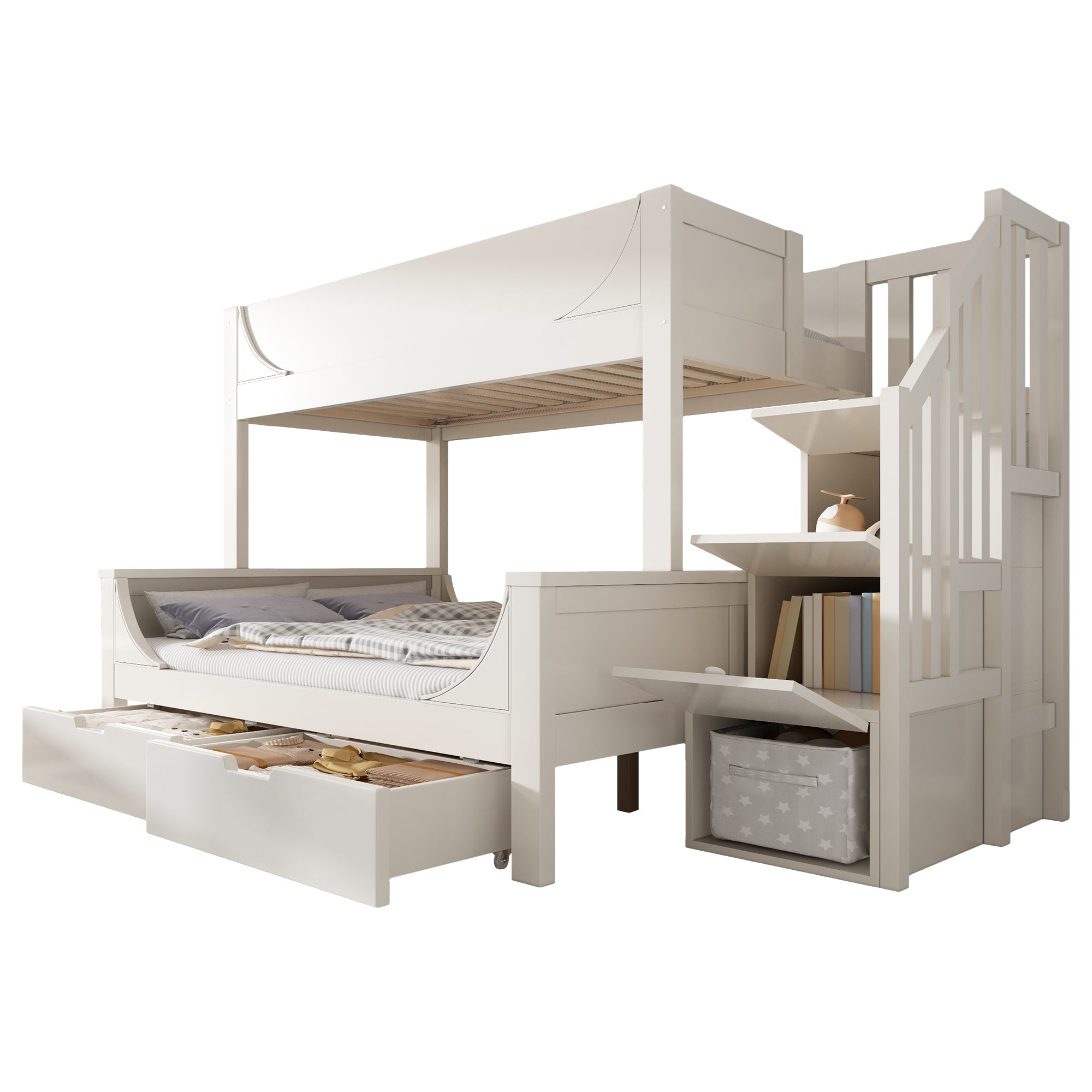 Bunk Beds for Kids, Staircase with Drawers and Storage, Solid Wood, White