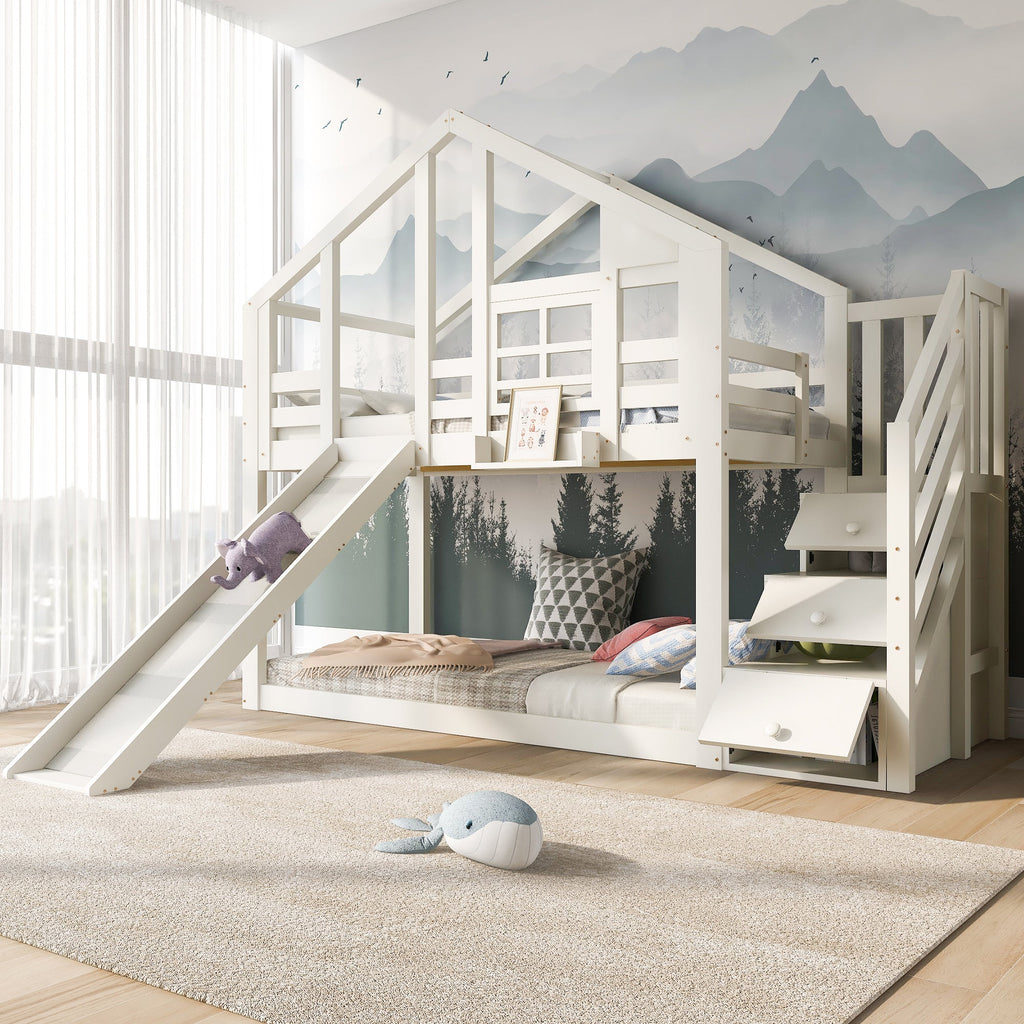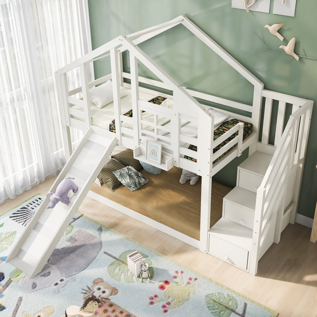 Children's Bed Tree House 90x200cm, Bunk Bed with Slide & Fall Protection, White