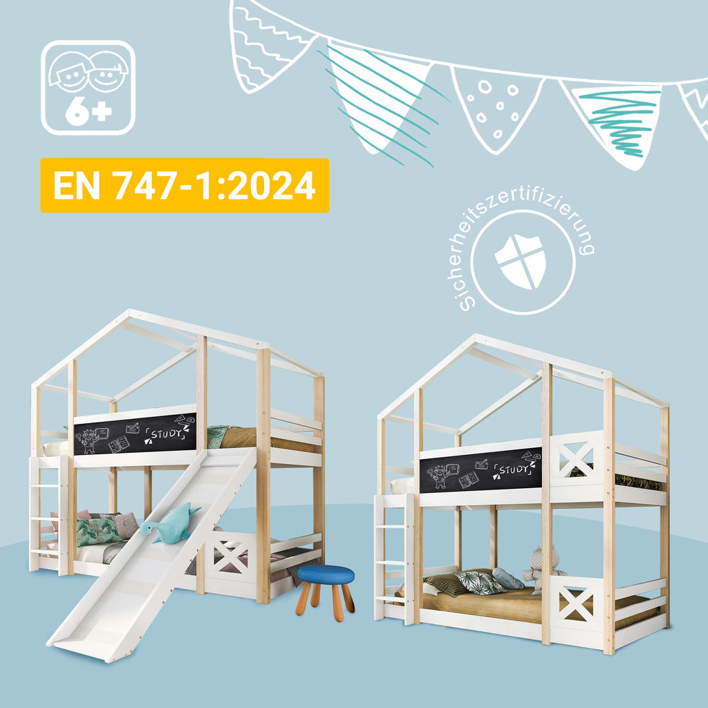 This unique loft bed features an entrance width of 39 cm. It is recommended for ages 6 years and older. The maximum mattress depth is 13 cm. This product is certified with EN 747-1:2024. The slide size is 152 x 39 cm.