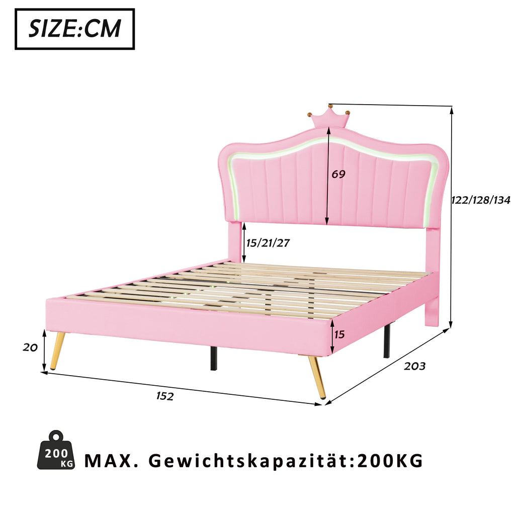 Children's Bed Upholstered 140x200cm LED Lights Slatted Frame, Pink PU Leather