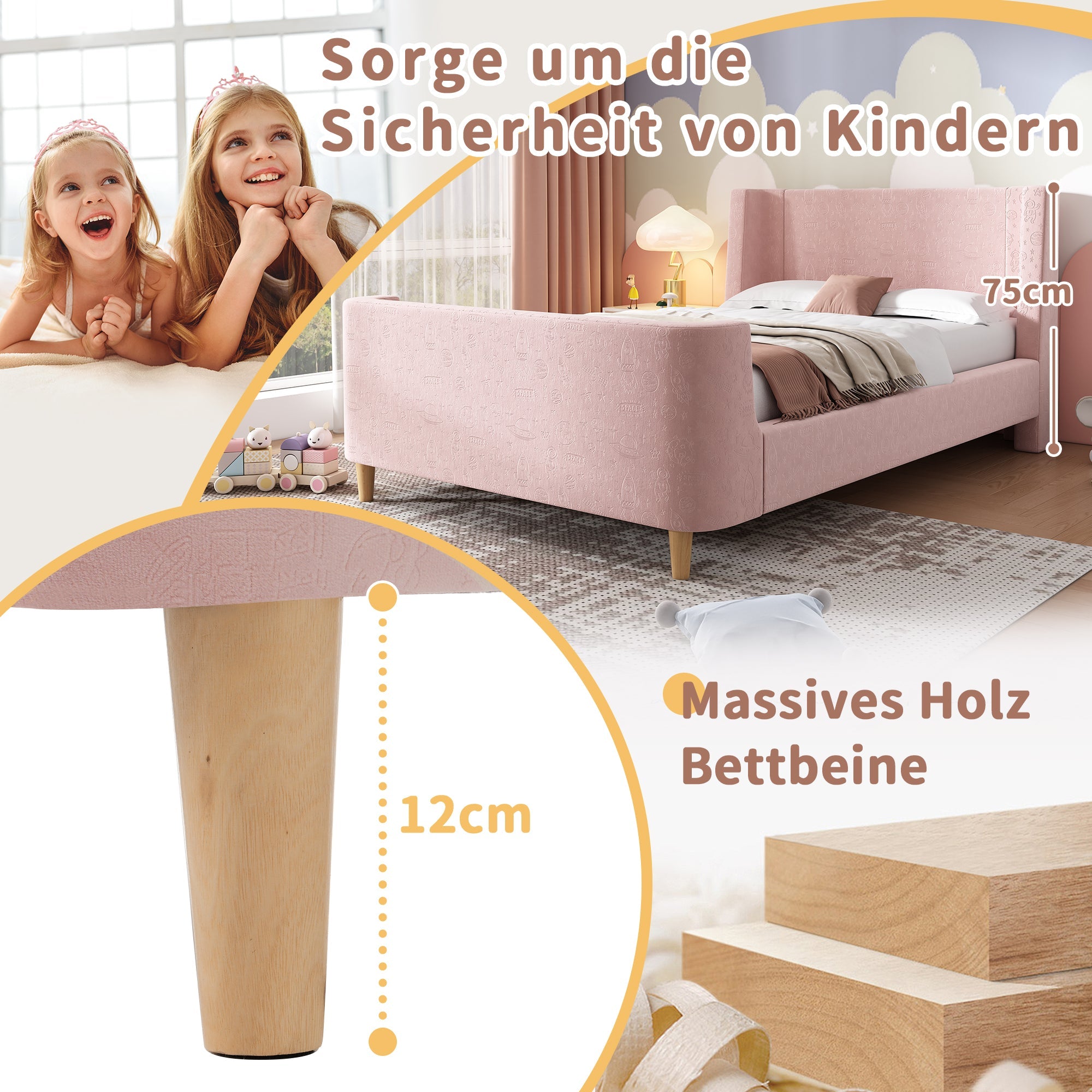 Children's Bed Upholstered Sleigh Bed, Cosmic Pattern, 90x200cm, Pink Velvet