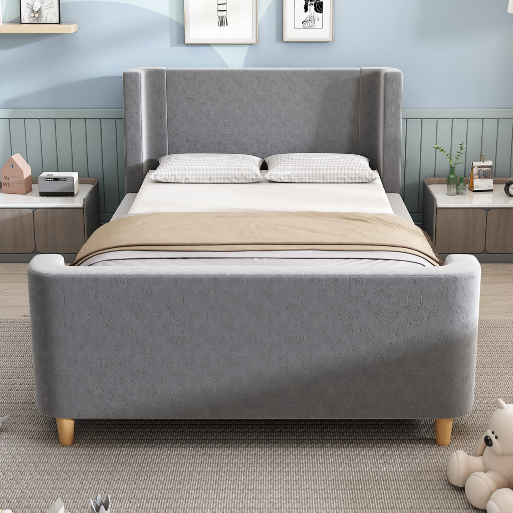 Children's Bed Upholstered Sleigh with Cosmic Pattern, 90x200cm, Grey Velvet
