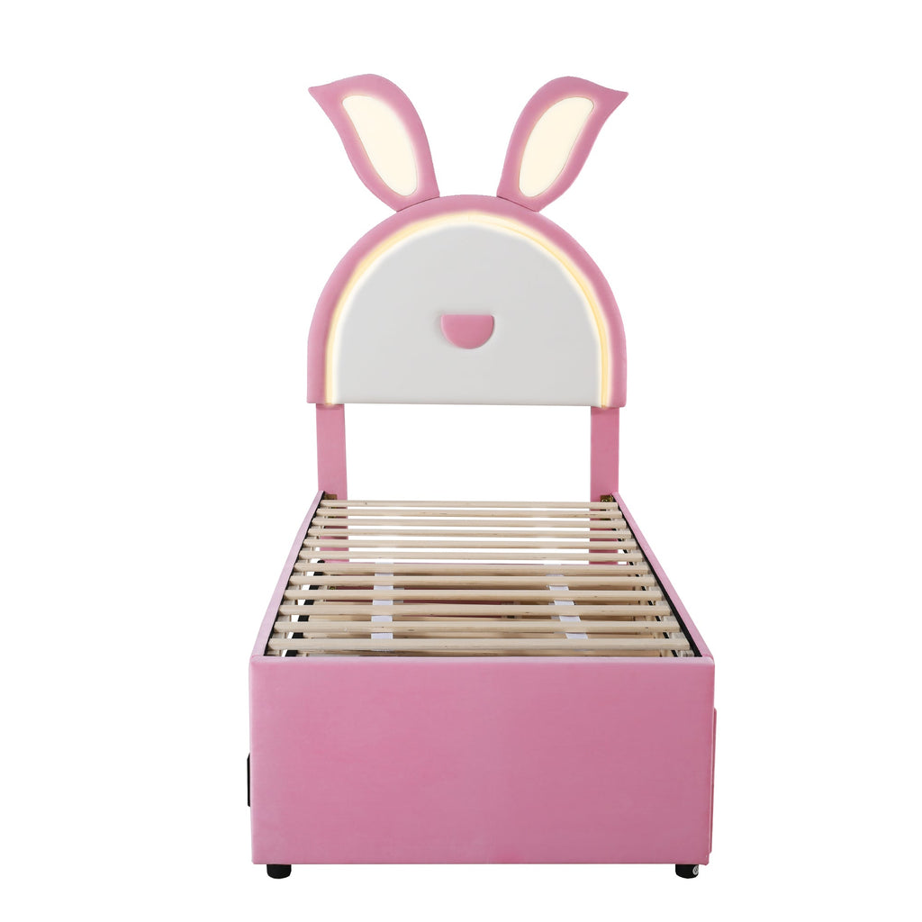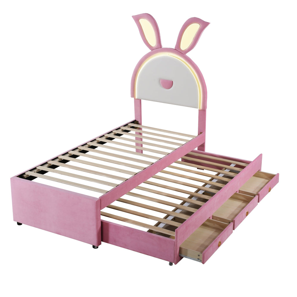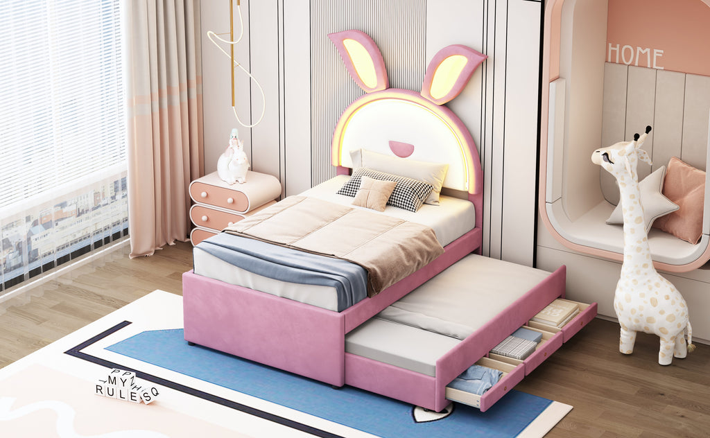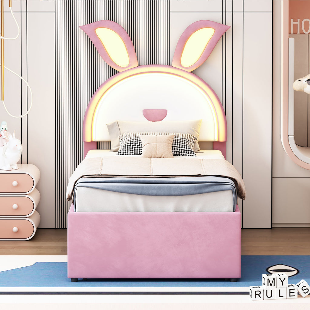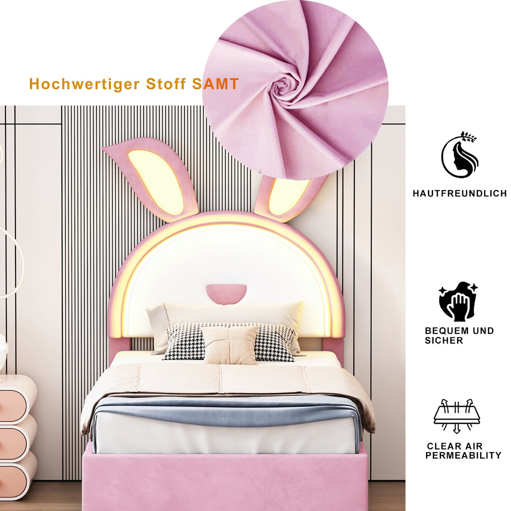 Children's Bed Upholstered Sofa Bed with Pull-Out, Storage, LED, Pink Velvet