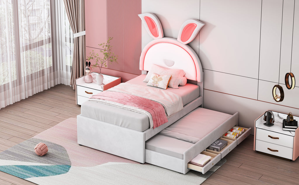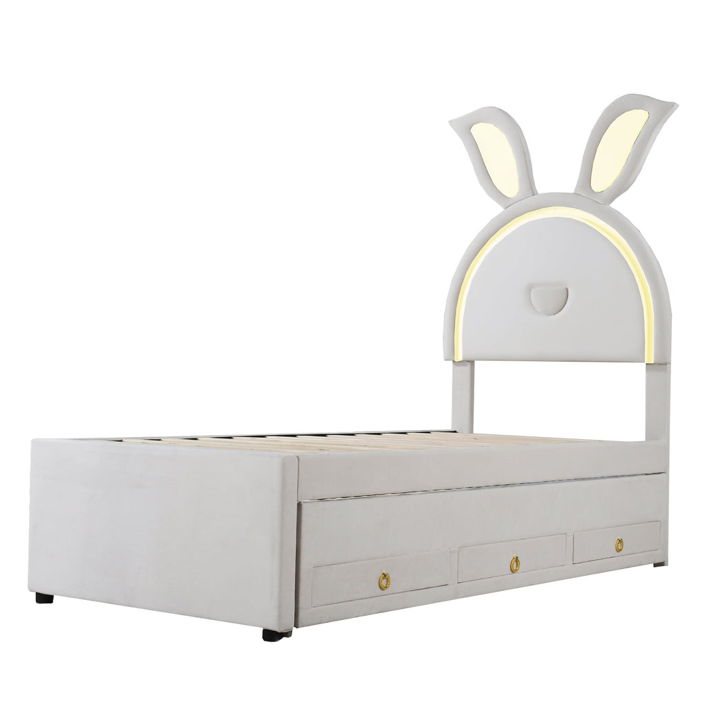 Children's Bed Upholstered Sofa with Pull-Out, Storage & LED Light, Beige Velvet