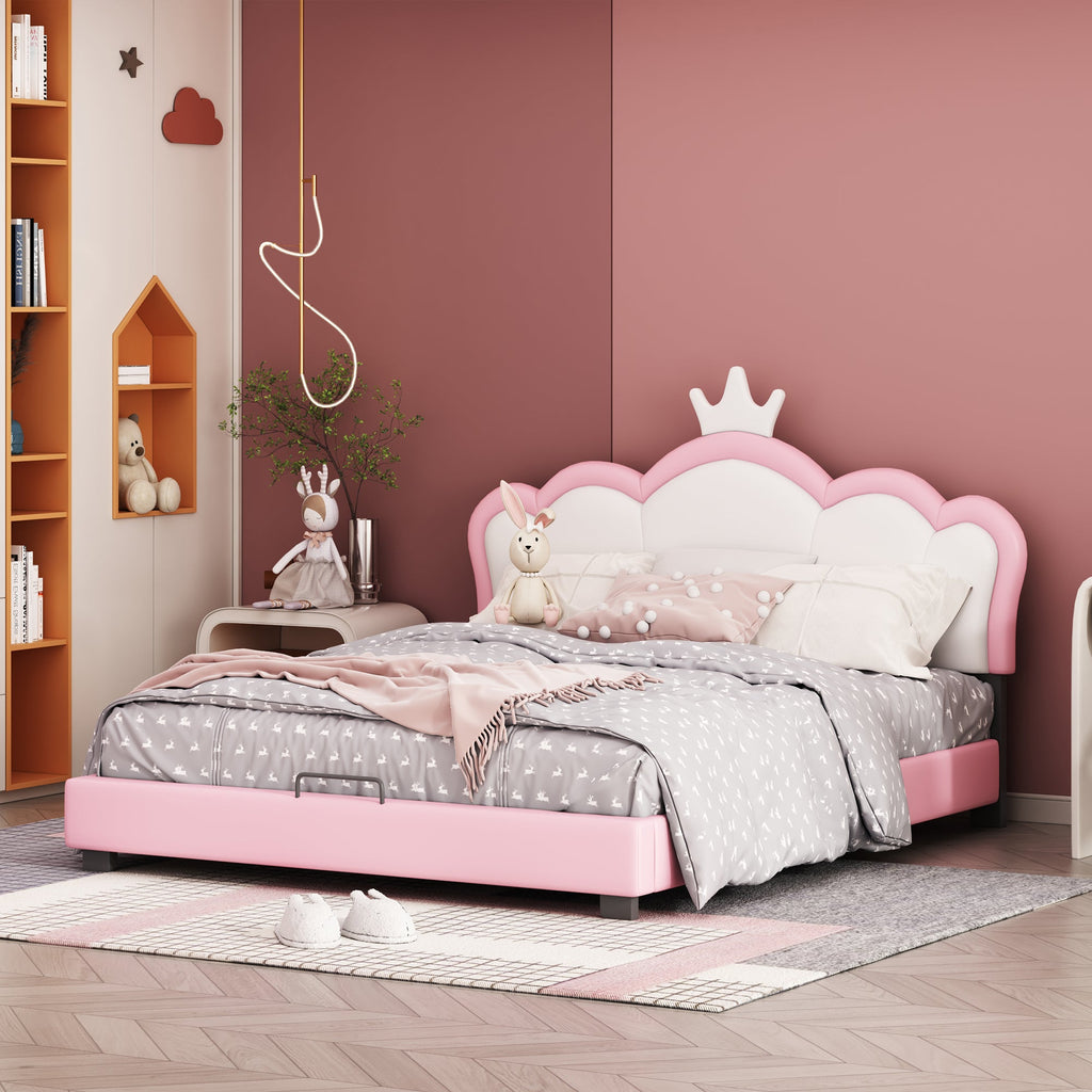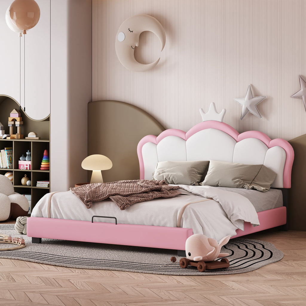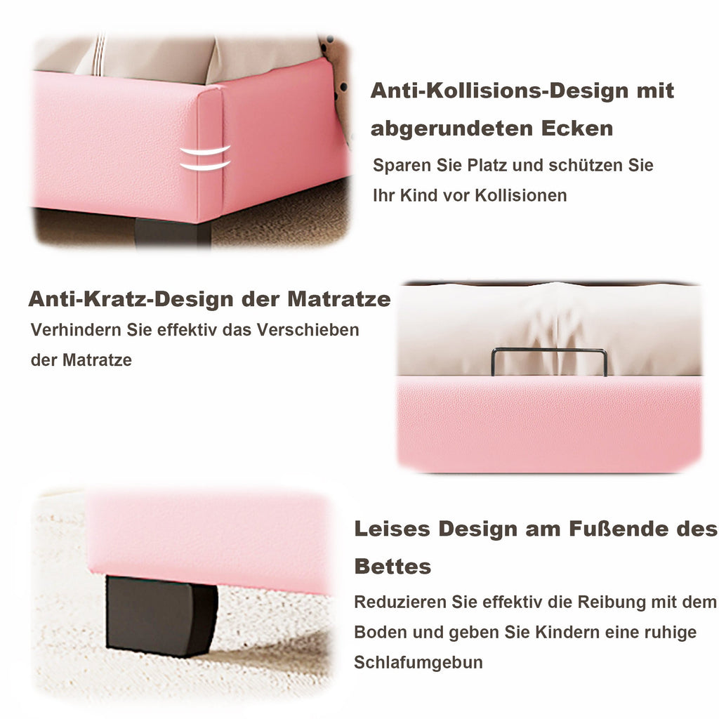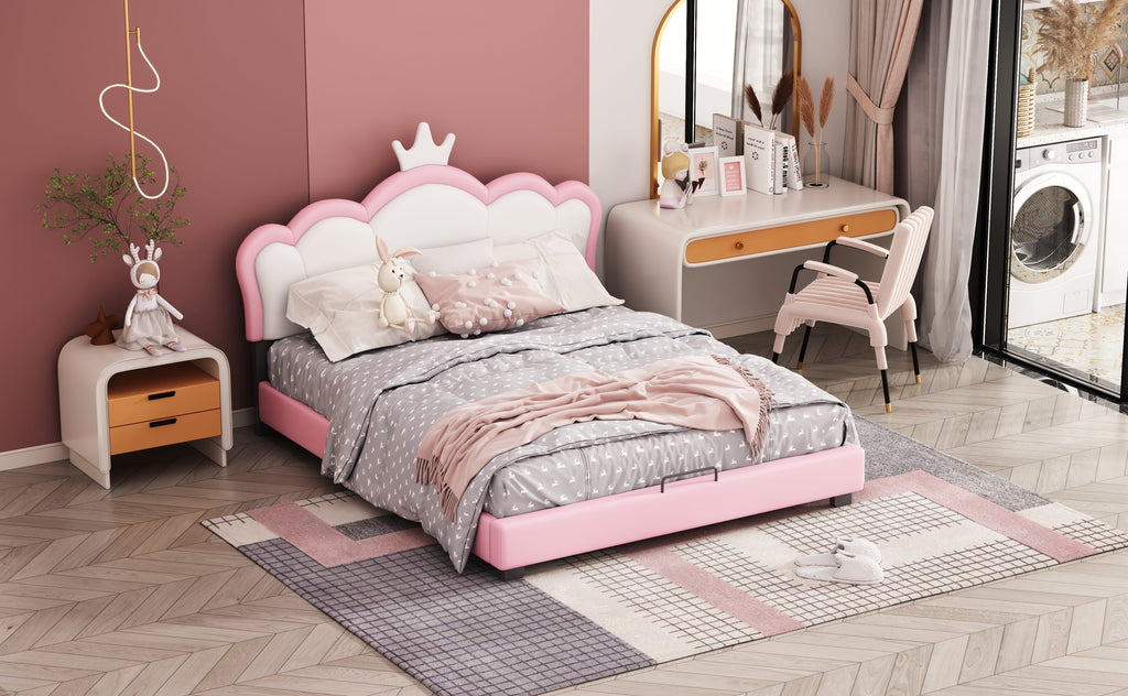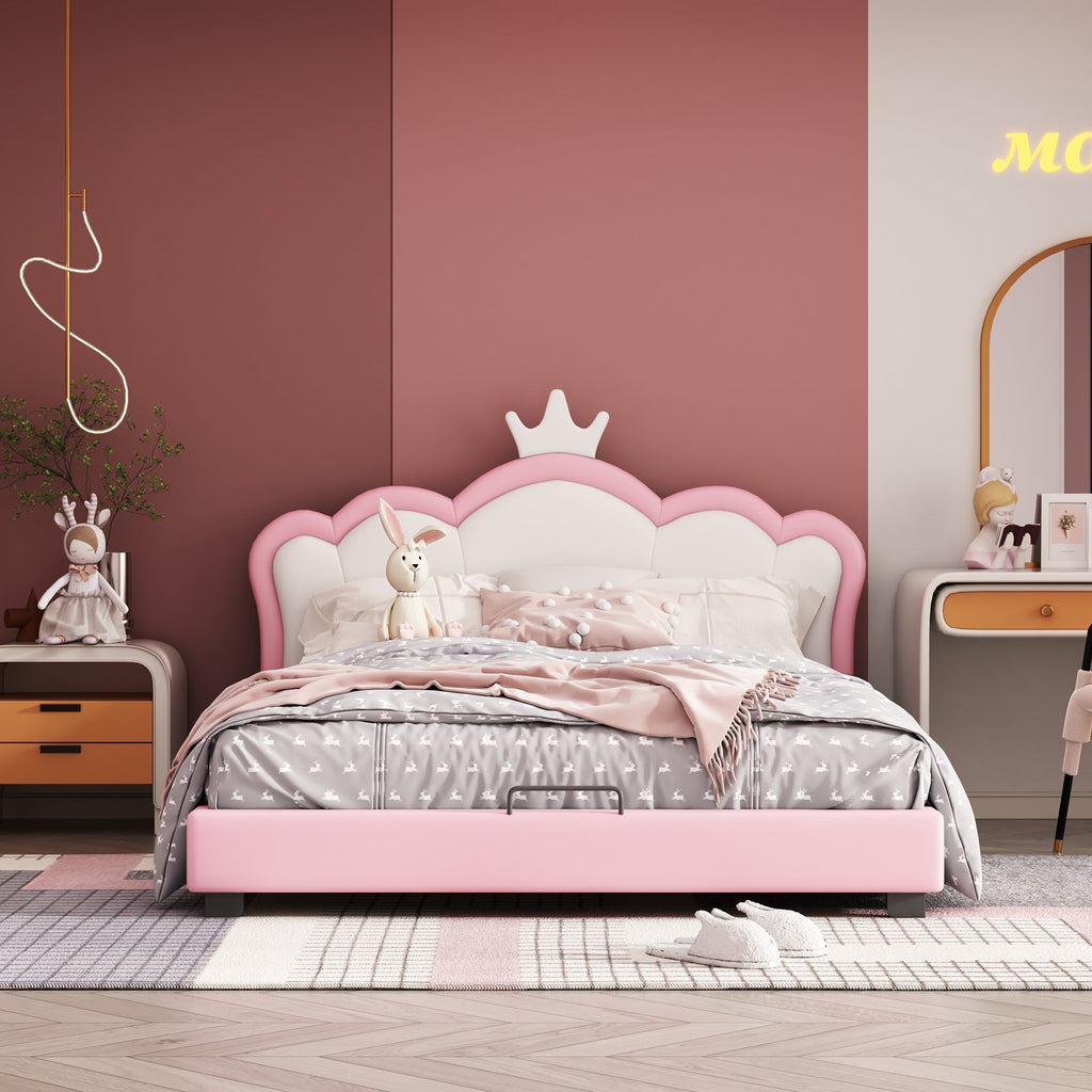 Children's Bed Upholstered with Slatted Frame & Crown Molding, Pink