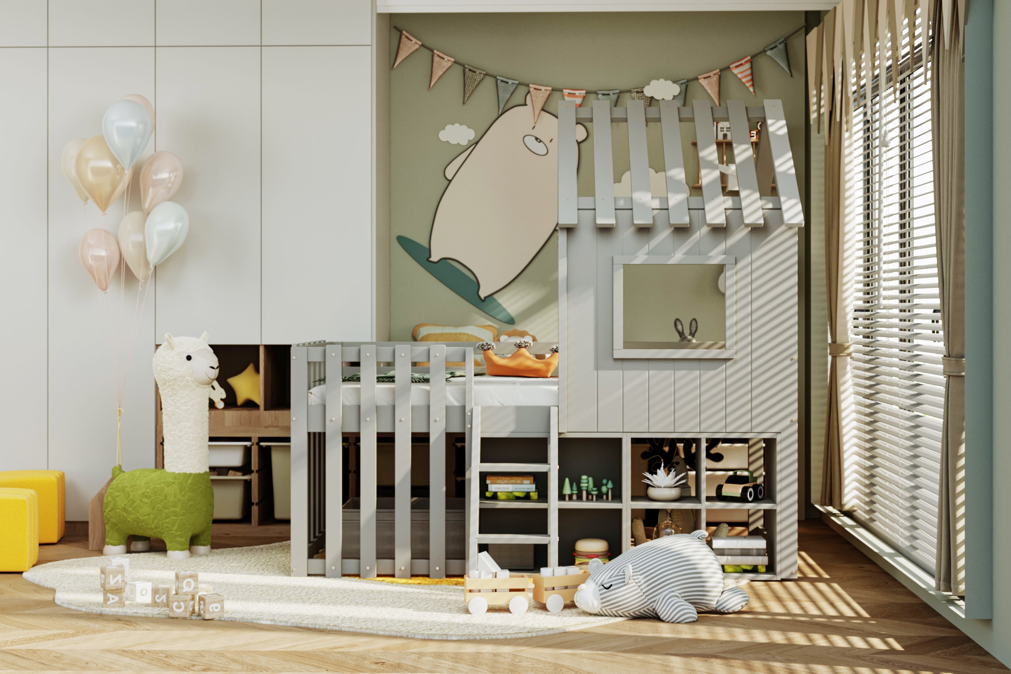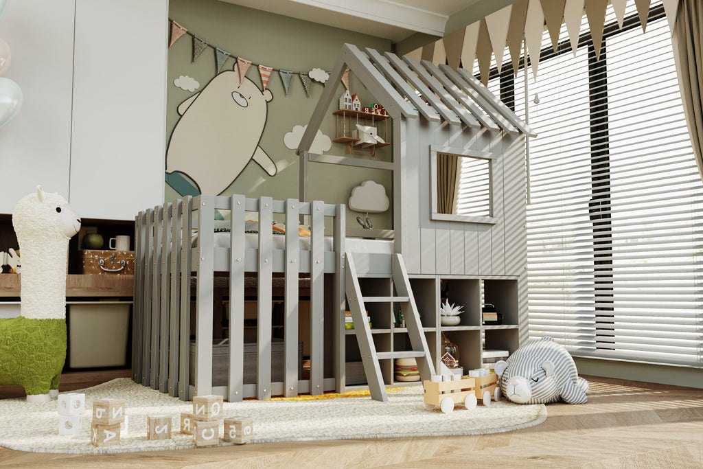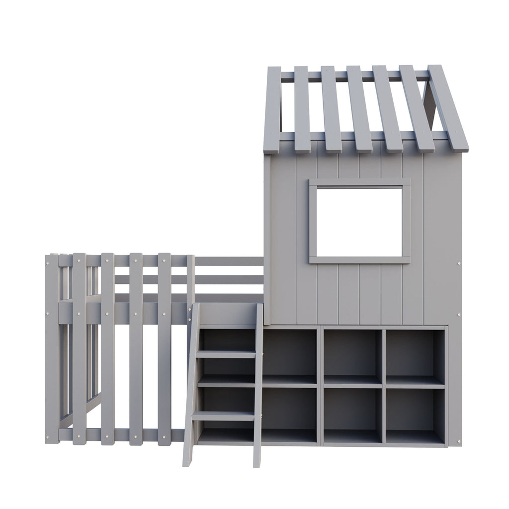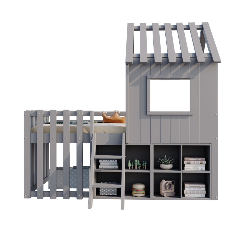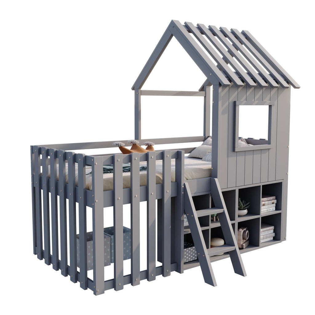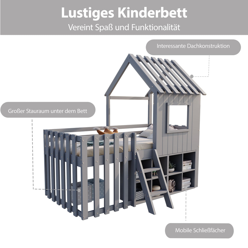 Children's House Bed 90x200, Roof & Window, Open Storage, Climbing Ladder, Solid Wood, Gray