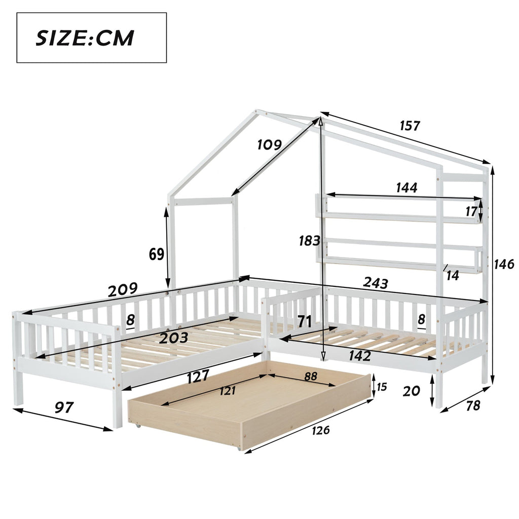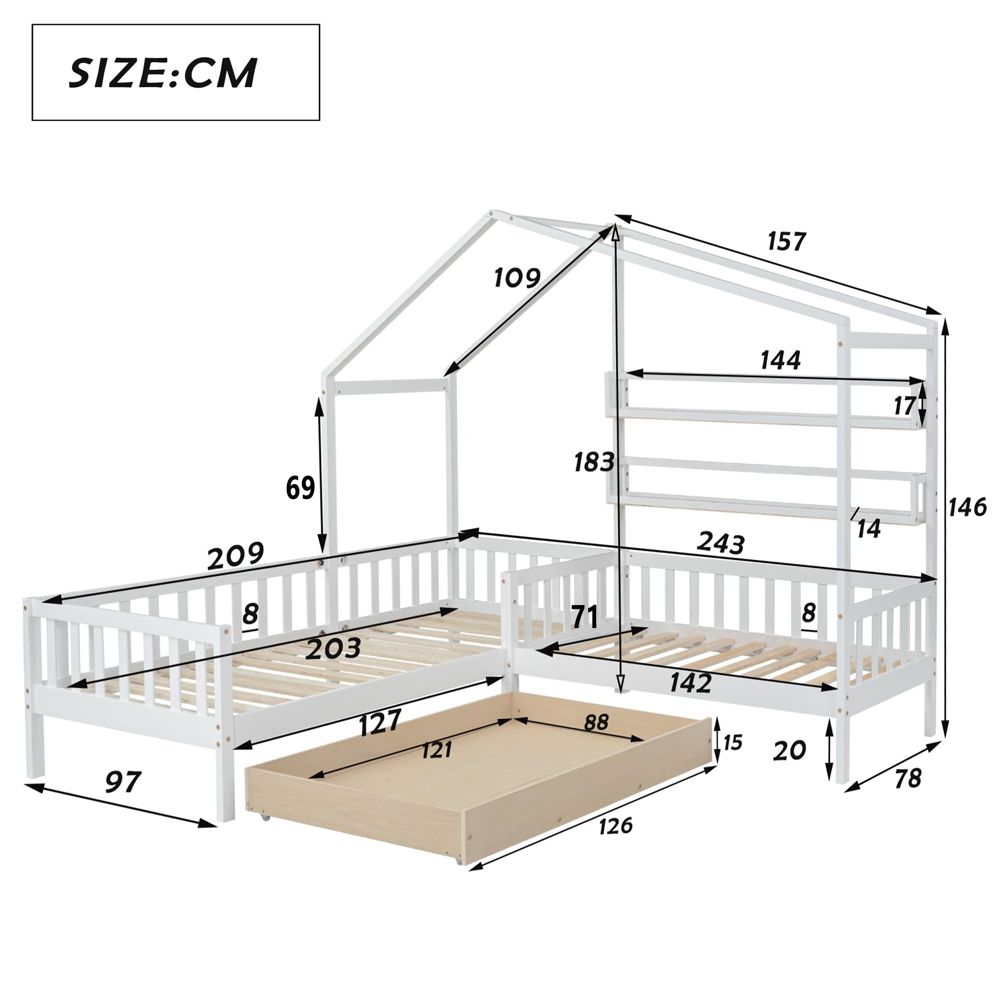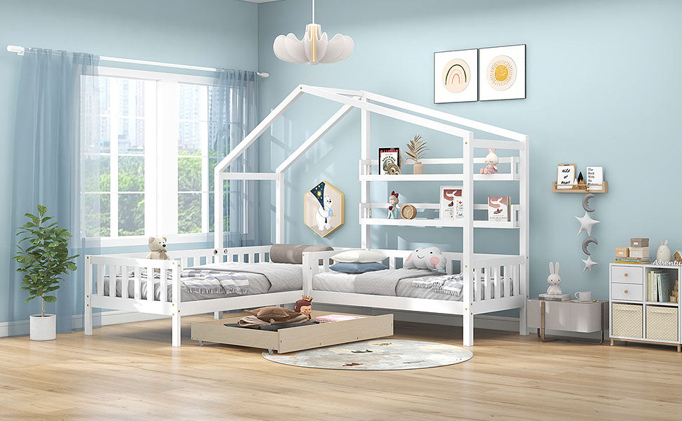 Children's House Bed with Drawers & Shelves, L-Shaped Solid Wood, White