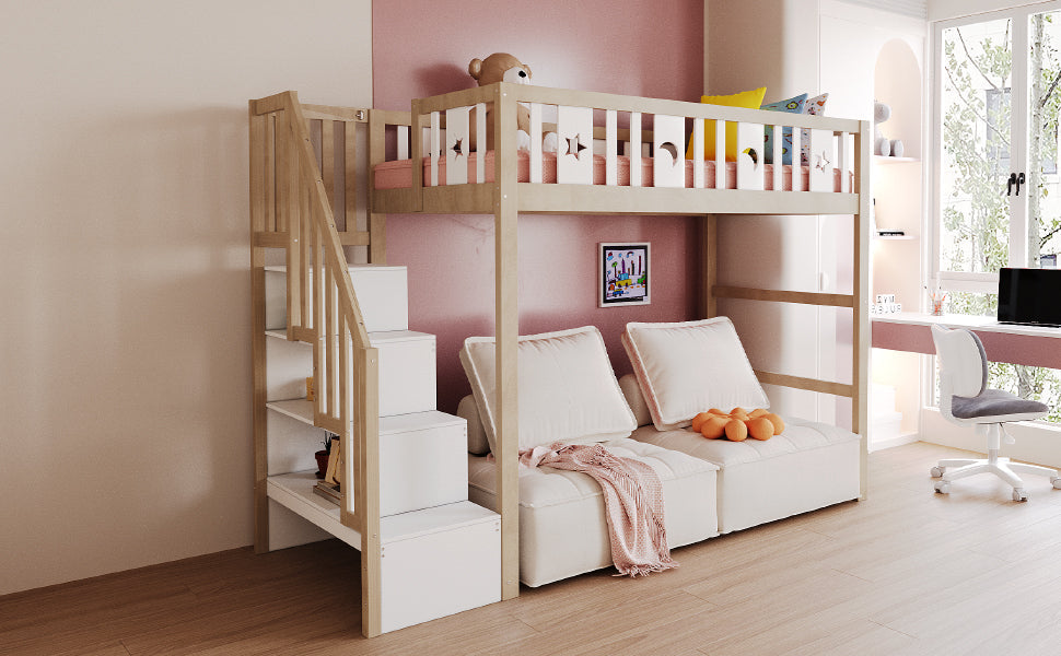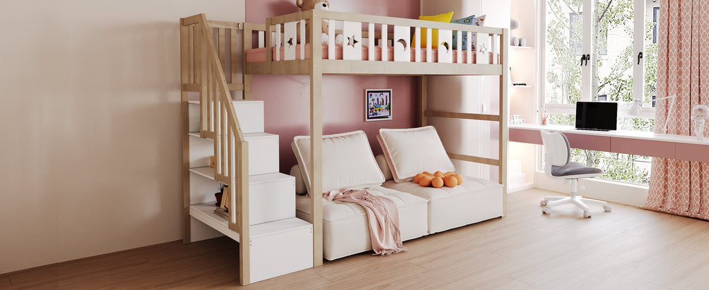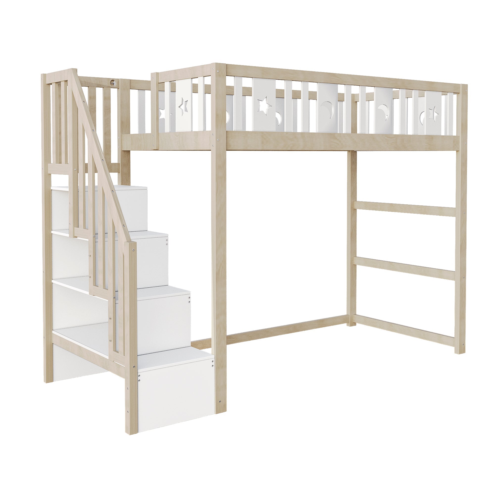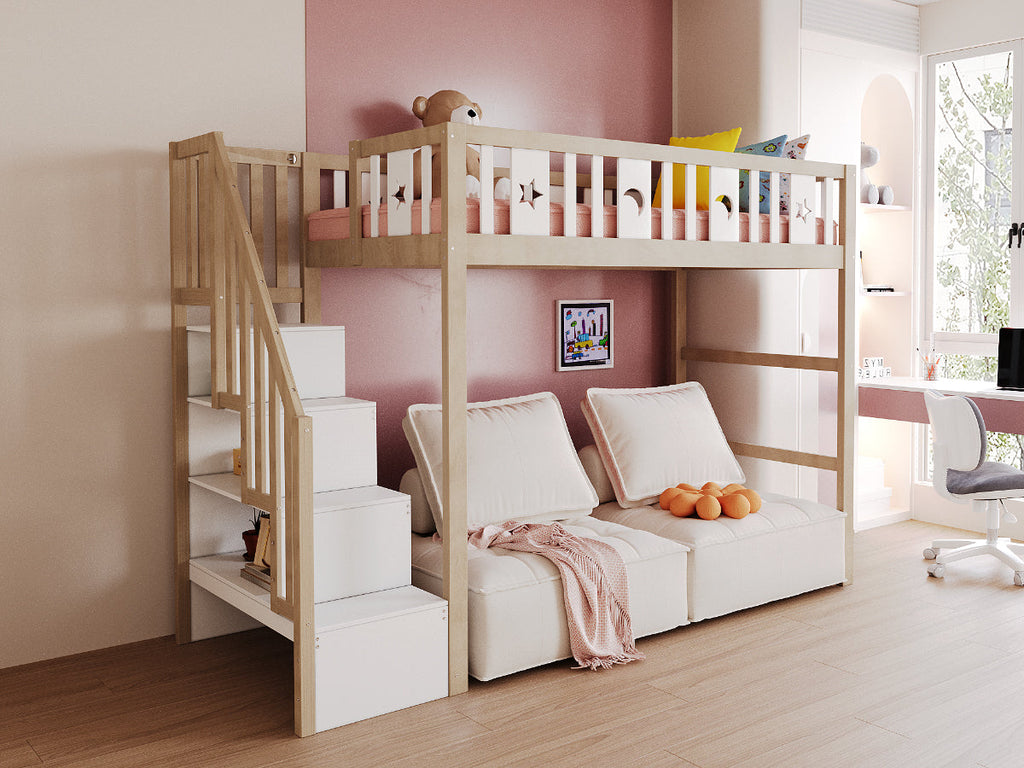 Transform your child's room into a true adventure land with this stylish solid wood loft bed\! The sophisticated design features a safe staircase, integrated shelving, and a cozy sofa area, offering not only a comfortable place to sleep but also a haven for play and relaxation. The loving details, such as the star and moon motifs, create a dreamy atmosphere, while the sturdy construction ensures safety. This is the perfect choice for modern families who want to combine functionality and design\!