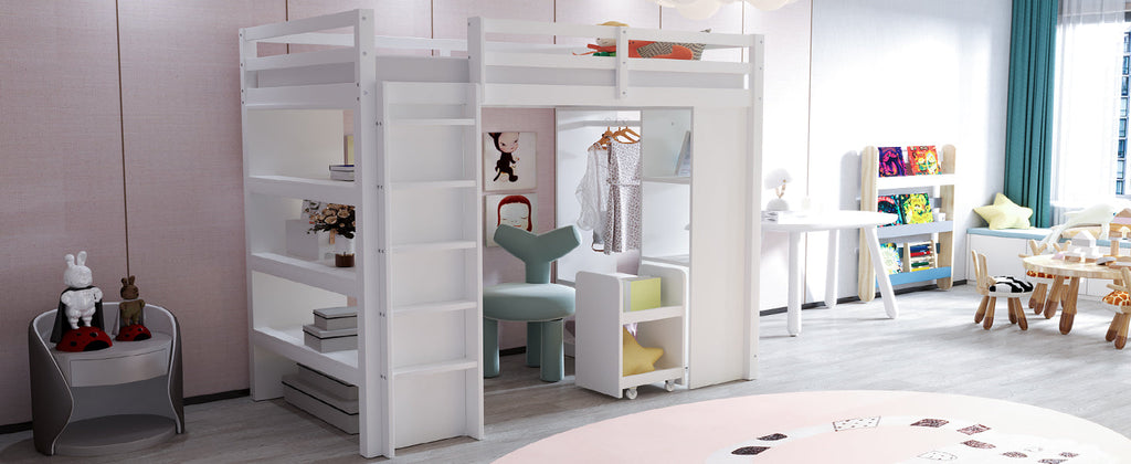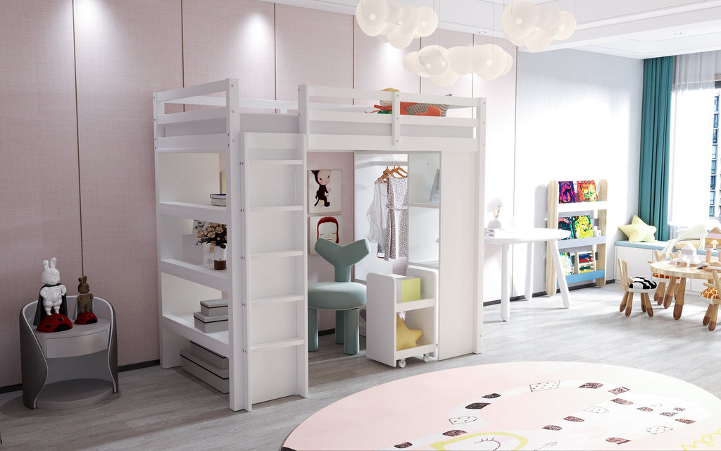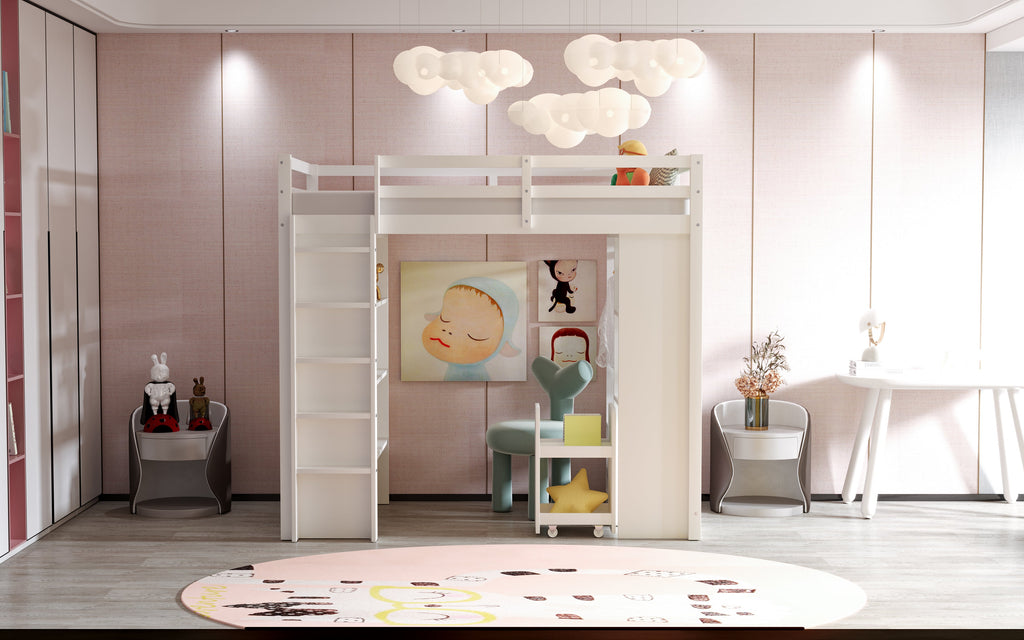 The loft bed features a straight ladder at the front for easy access to the raised sleeping area. The storage space under the bed offers ample room. On one side of the bed are multi-level shelves, perfect for books, toys, or decorative items, making it easy for your child to keep things organized. On the other side of the lower bed are simple hanging rods, several storage compartments, and a removable trolley, perfect for storing clothes, school supplies, or everyday items. The trolley is so flexible that it can be moved around the room as needed, encouraging children to organize in a fun way.
