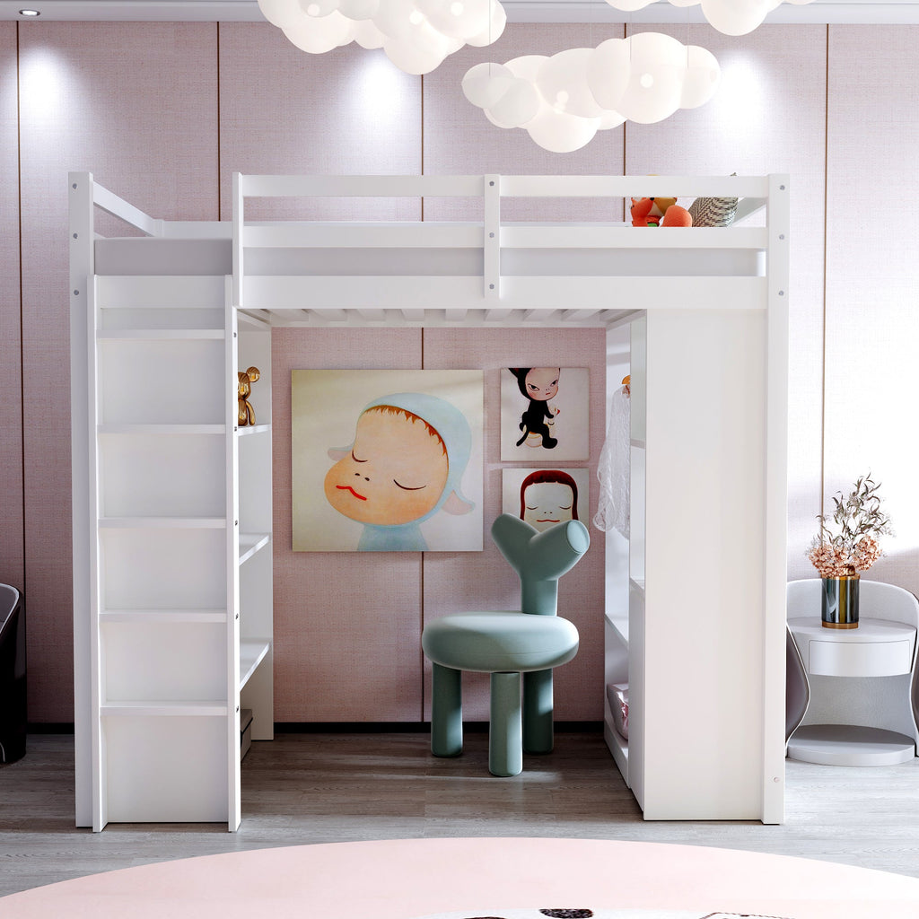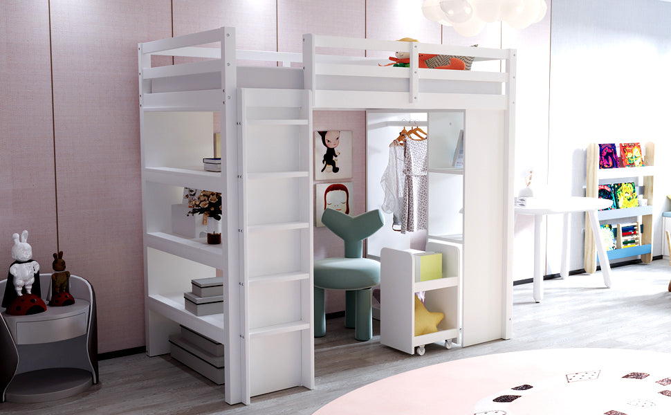 Children's Loft Bed, Multi-Level Shelves, Hangers, Storage, Removable Trolley, 90 x 200 cm, White