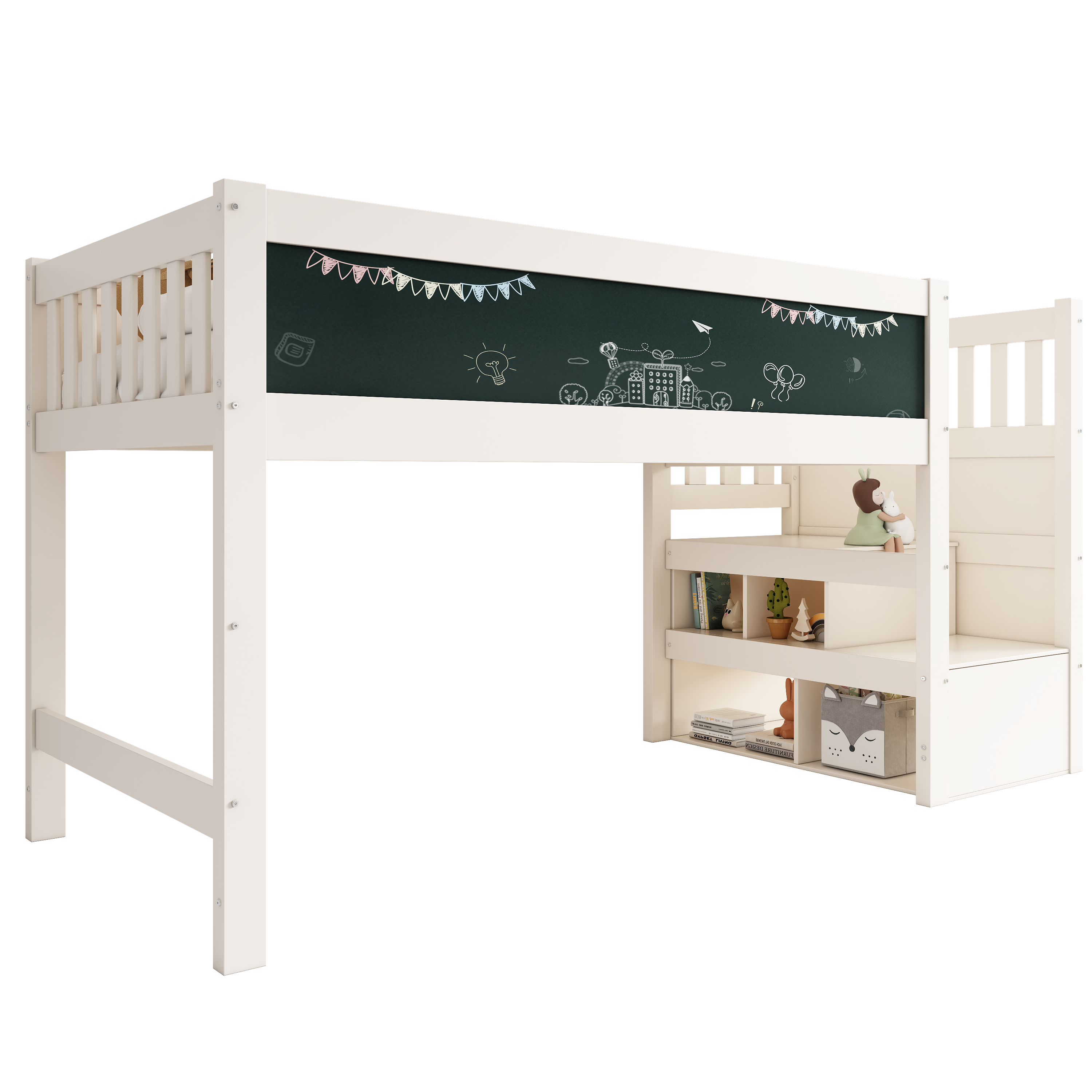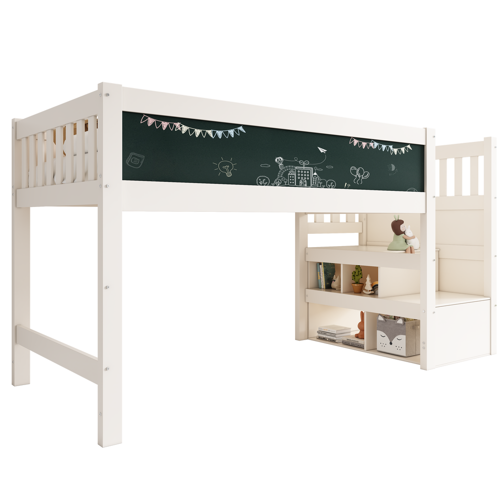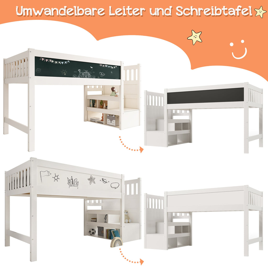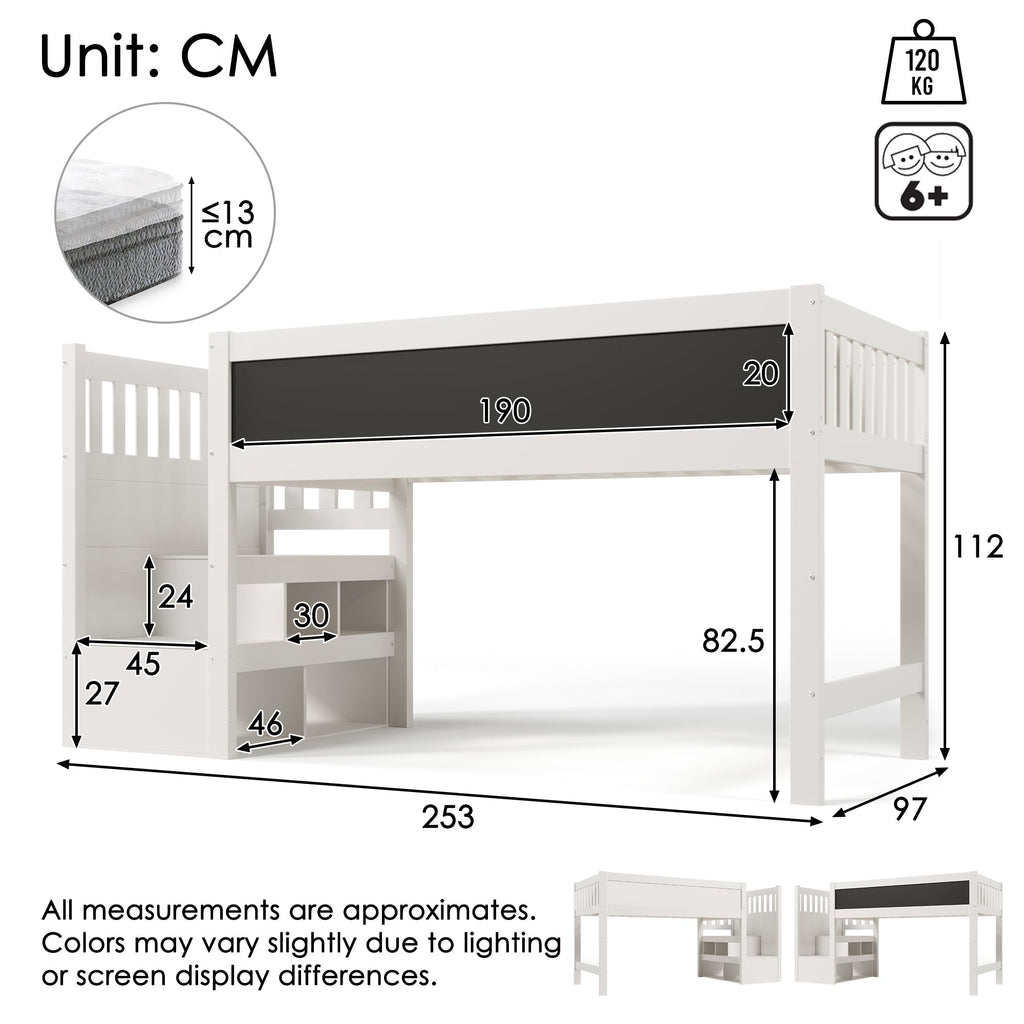 Children's Loft Bed with Whiteboard & Blackboard, Storage, 90 x 200 cm, White