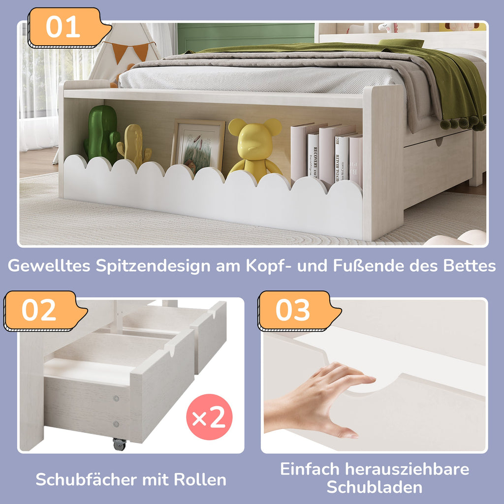 Children's Single Bed, Storage with Drawers, Shelf, Bench, Wood, White Oak