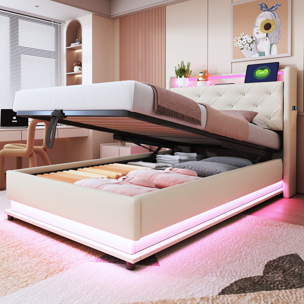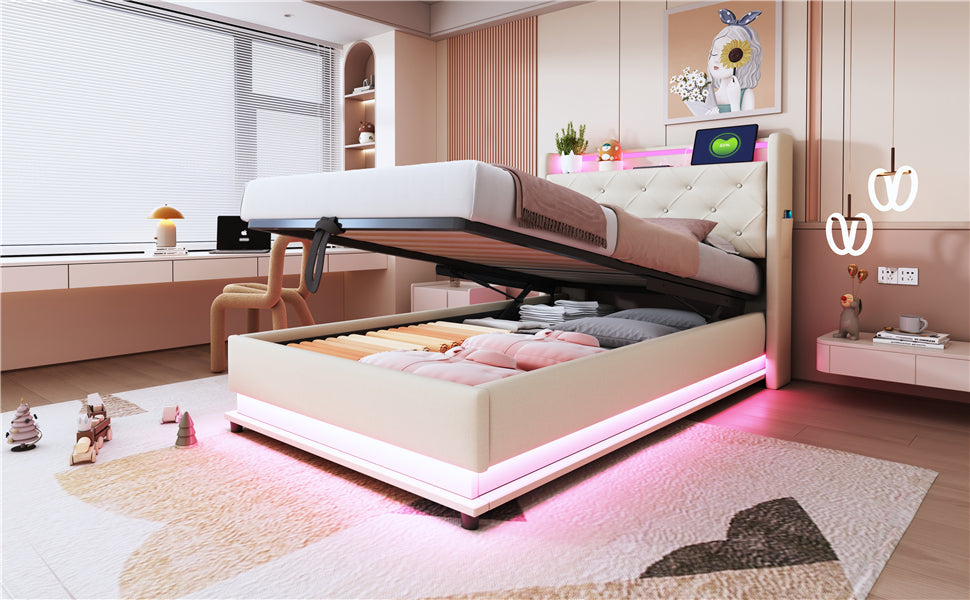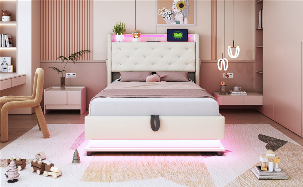 Children's Upholstered Bed 90*200cm, Lights, USB, Storage, Beige Linen