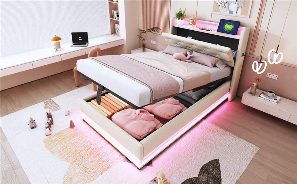 The headboard and bed rail feature color-changing lights to create a calming ambiance. The headboard also includes a fold-out storage compartment, providing more space for books, toys, or other personal items. For added convenience, there are three USB ports and one Type-C port on the side of the bed, allowing your child to easily charge devices such as tablets and mobile phones.