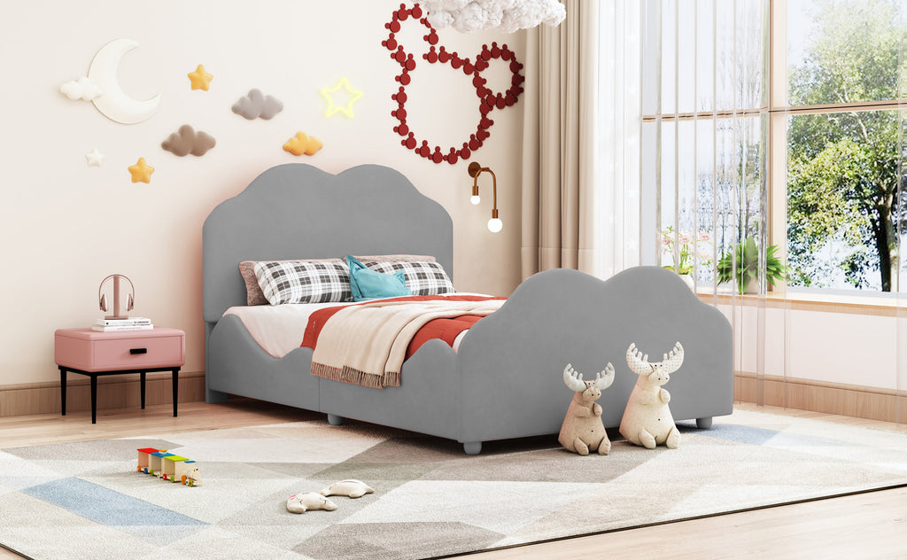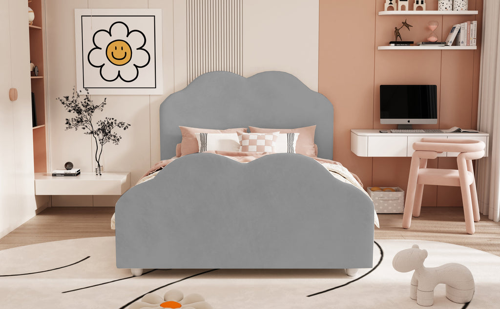 Transform your child's bedroom with this uniquely designed upholstered bed. Its simple yet charming cloud-shaped headboard and footboard create a serene and comfortable atmosphere, making bedtime feel like floating on clouds. Available in a versatile gray velvet finish, this bed seamlessly complements various bedroom styles.