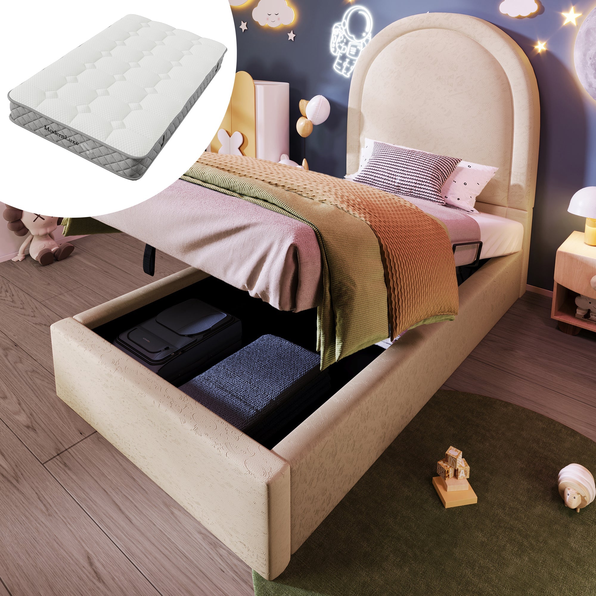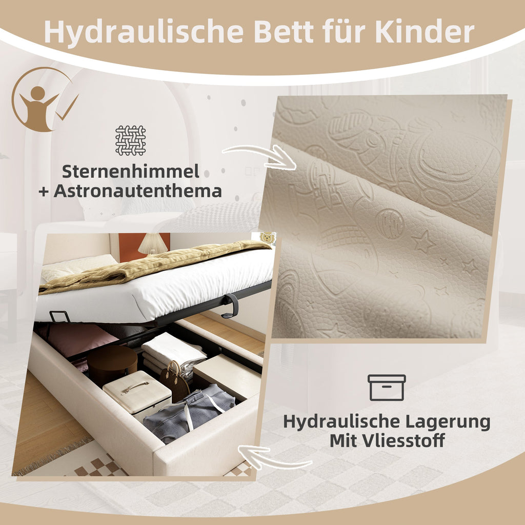 Children's Upholstered Bed, Single with Cosmic Pattern, 90x200cm, Beige PU