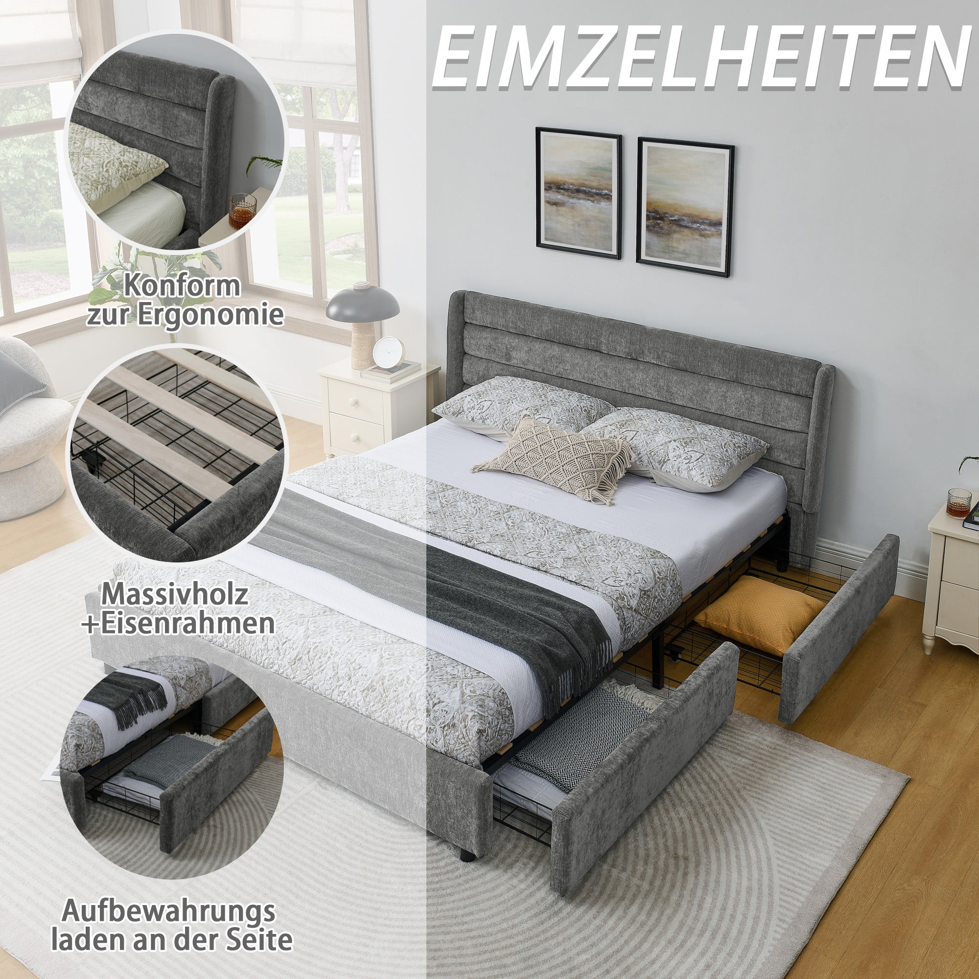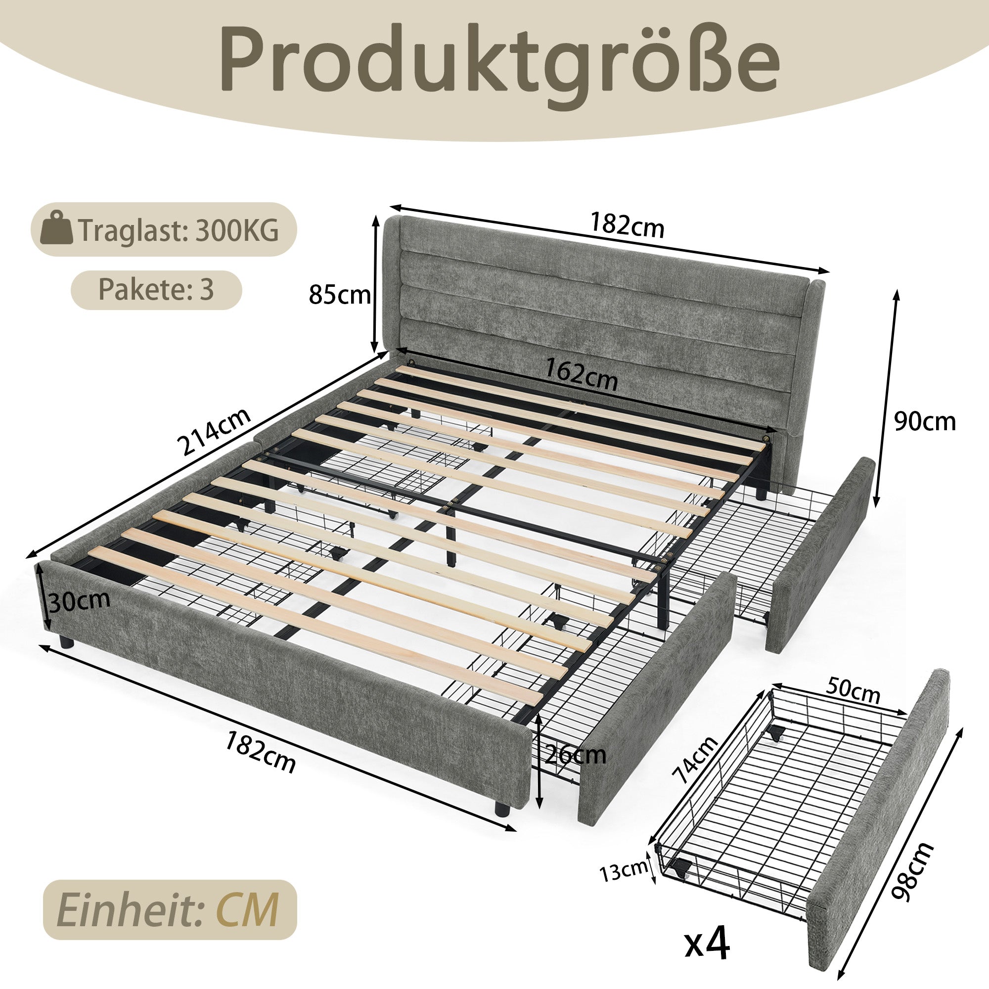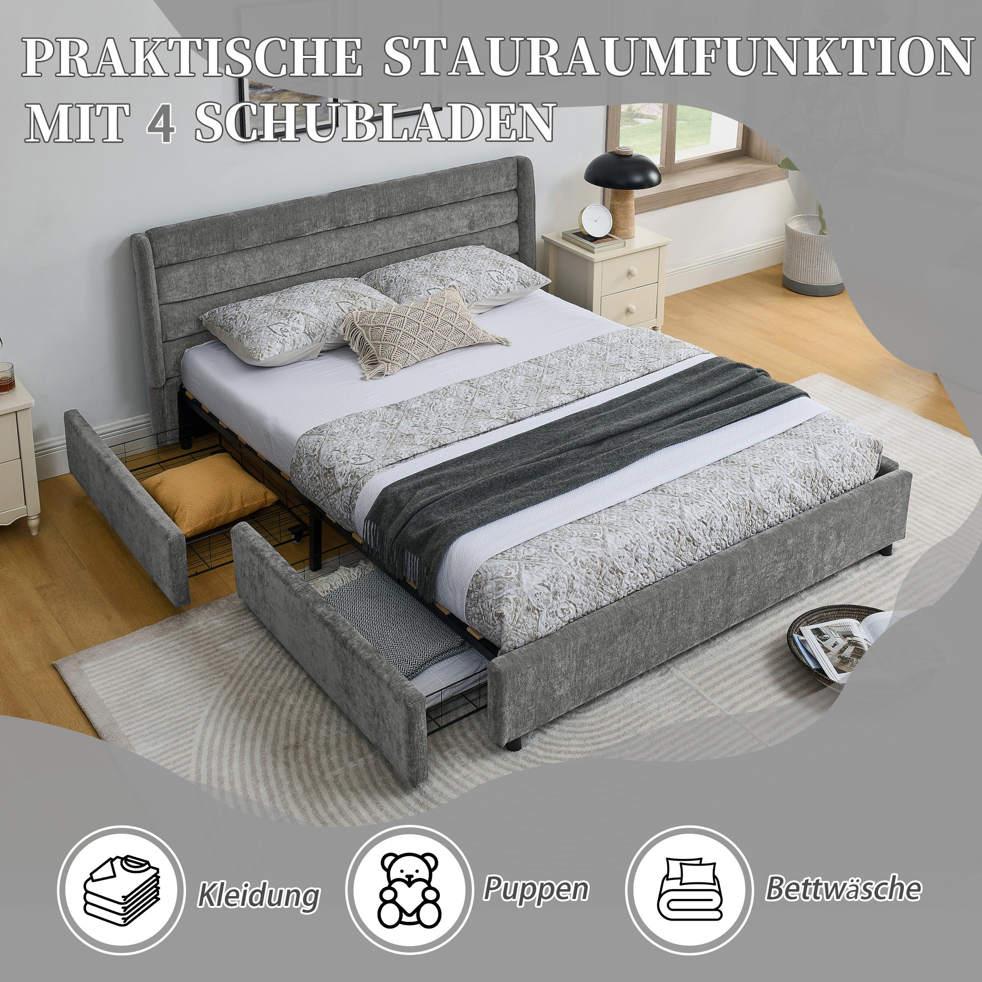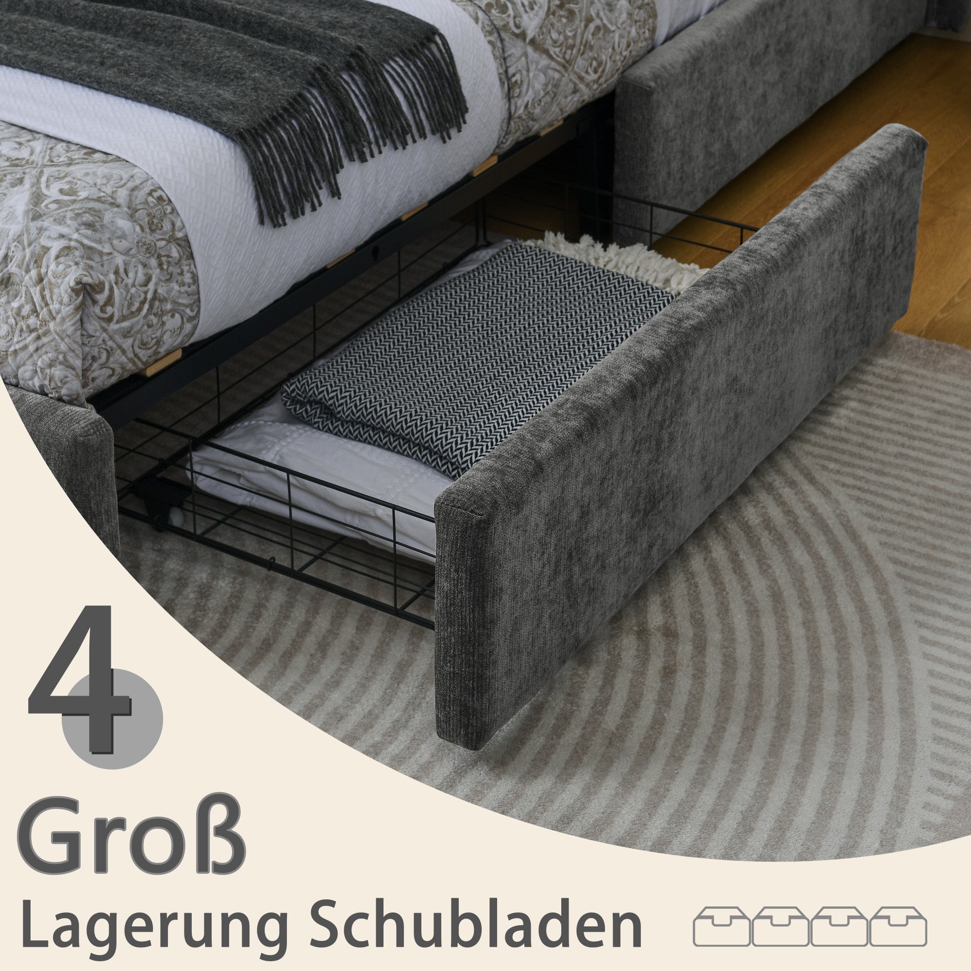 Double Bed 160x200cm with 4 Large Storage Drawers, Dark Grey Chenille