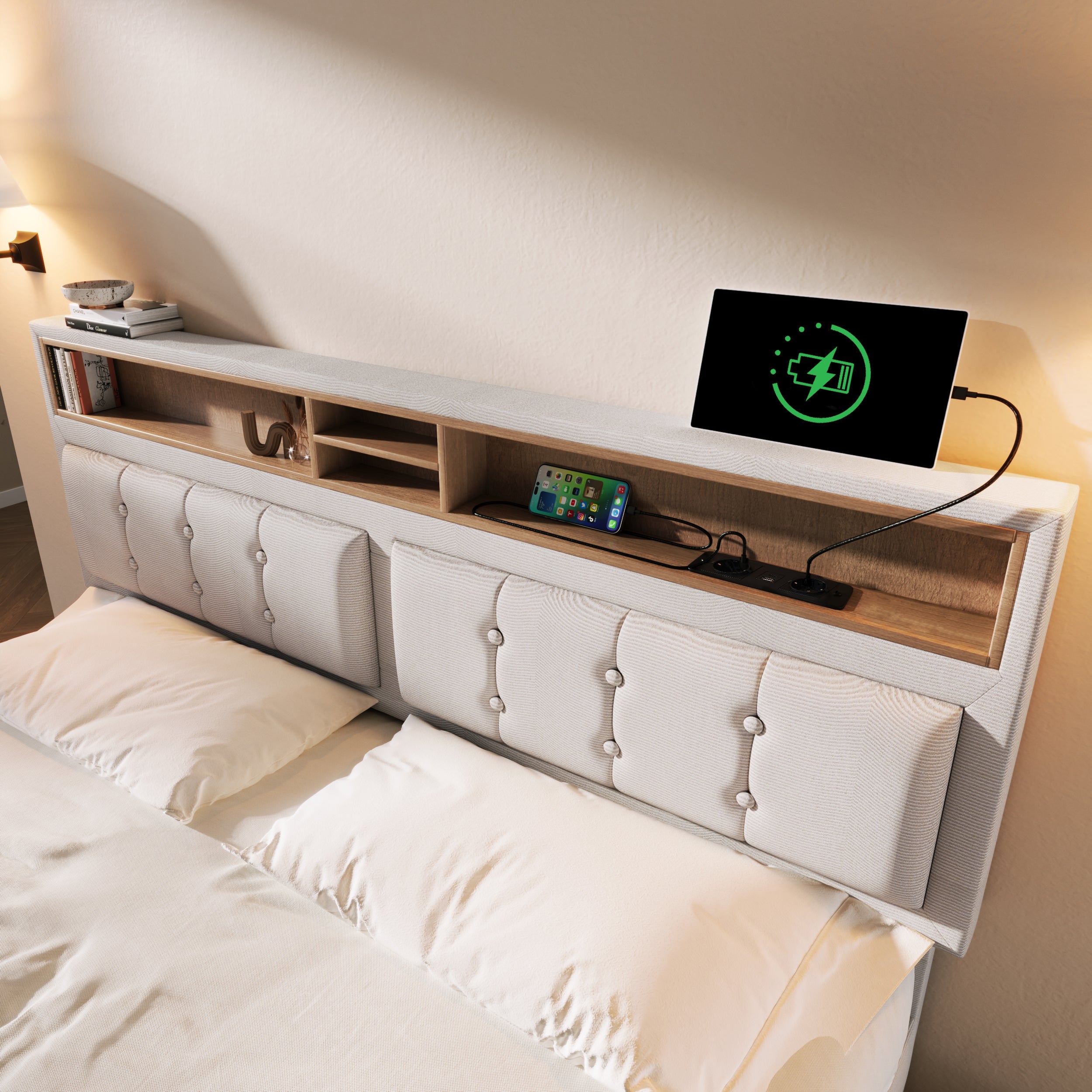 Double Bed, 4 Drawers USB C, Upholstered Adjustable Headboard, Wood