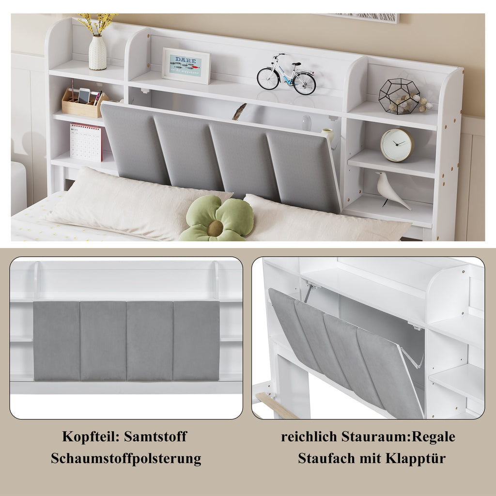 Double Bed, Open Shelf, 3 Drawers, Pine Frame, White+Grey