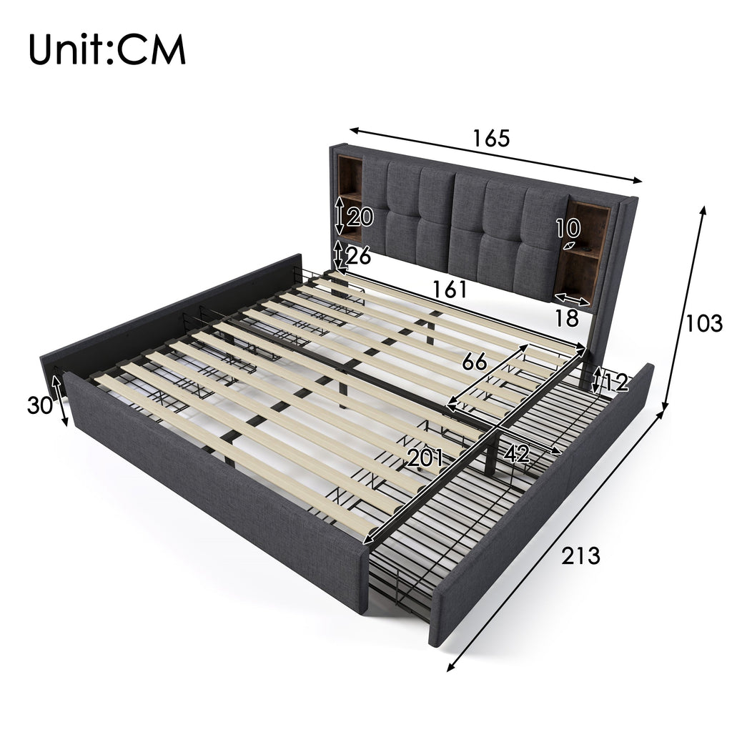 Dimensions: 160x200cm. Overall: 165x213x103 cm (WxLxH). Panel Material: Linen. Color: Gray. Maximum User Weight: 200 kg / 440 lbs. Headboard Distance: 26cm. Charging Type: Wireless Charging + USB + Type-C. Box Spring Required: No. Assembly Required: Yes. Package Contents: Bed Frame + Charging Station + 4 Drawers. Unique Design: Inductive Charging Station. Applicable Mattress: 160x200 cm. Package Quantity: 2. Inner Drawer Dimensions: 66x42x12 cm (WxLxH). Gross Weight/Net Weight: 53.4/50 kg.