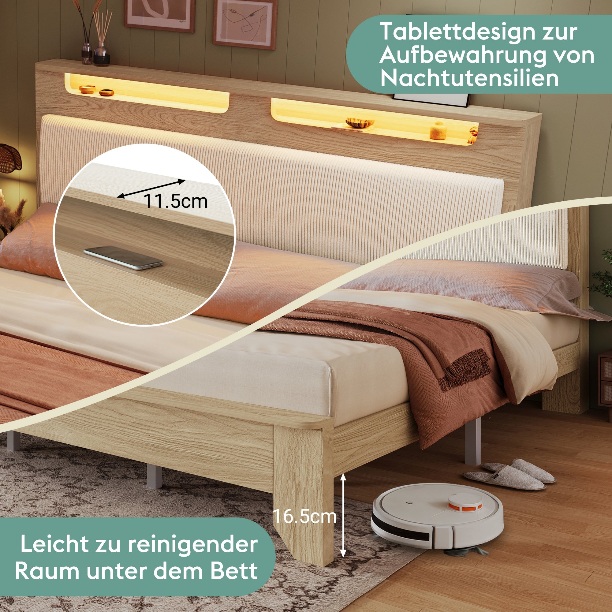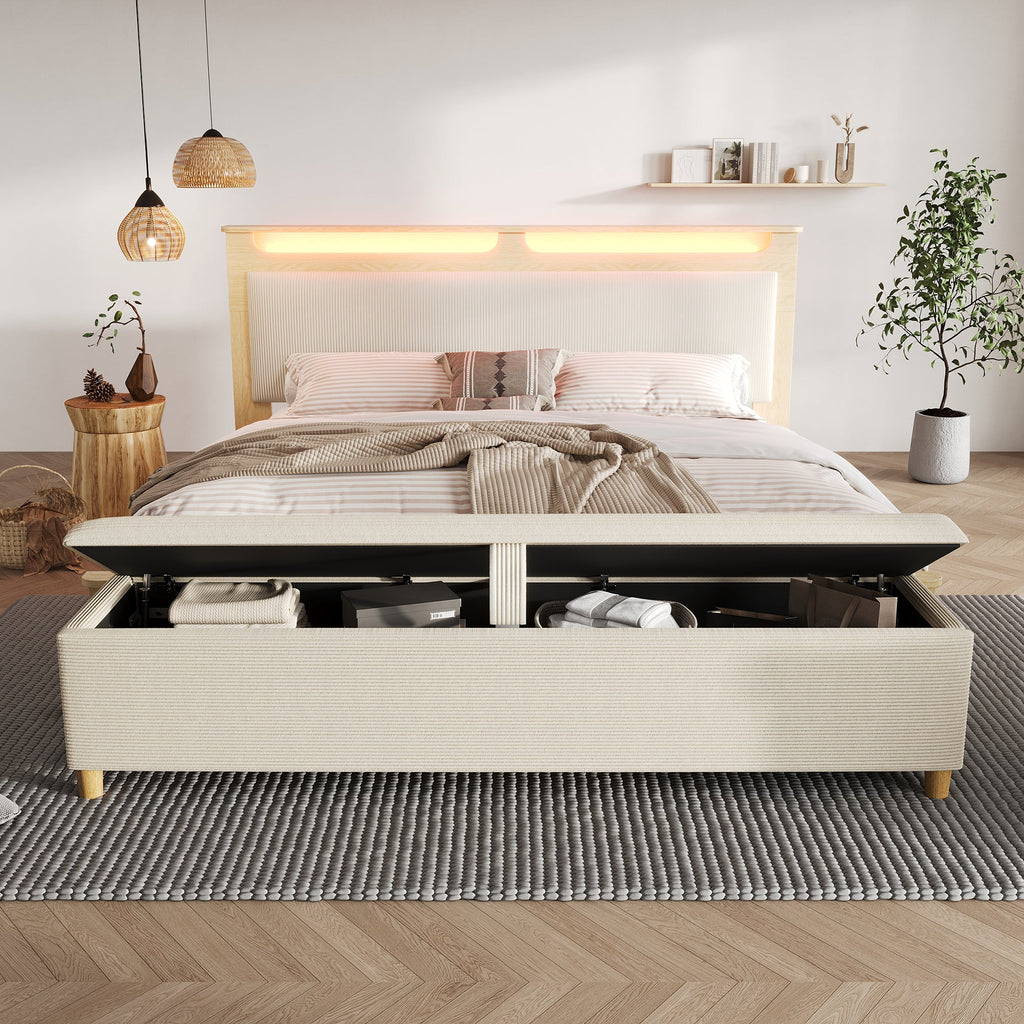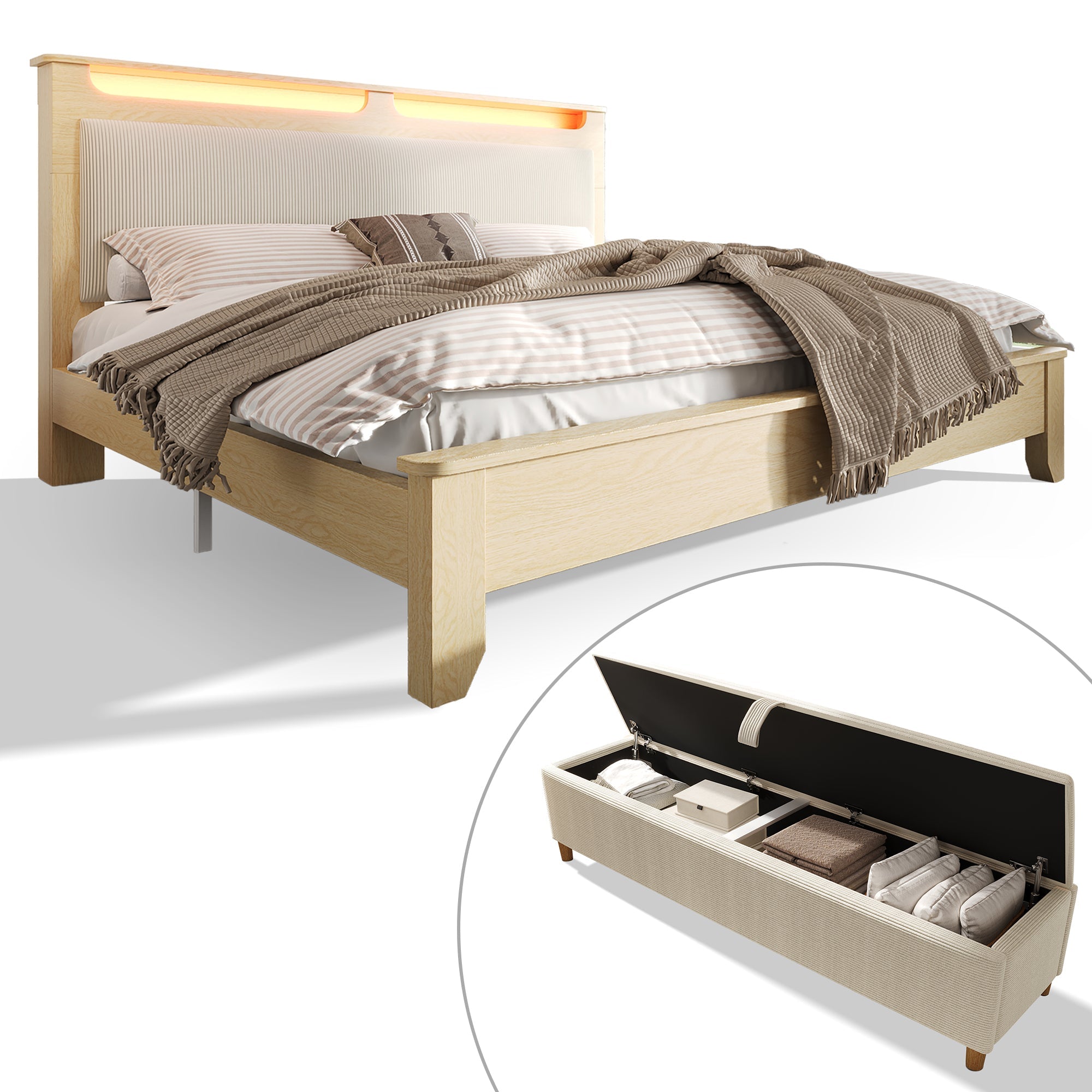 Double Bed with Bench, Headboard Storage & LED, Light Oak