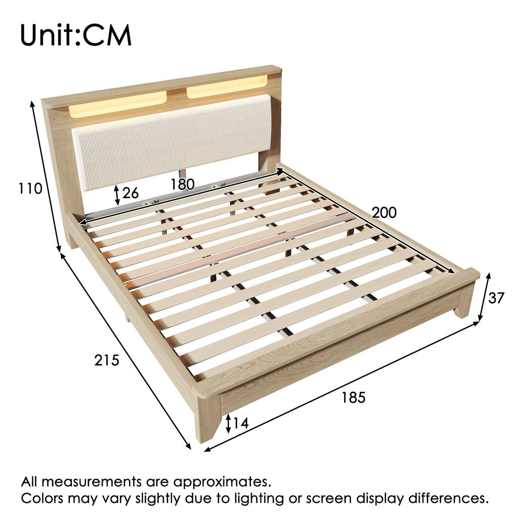 Double Wooden Bed, 180x200cm, Storage Headboard, LED, Corduroy, Light Oak