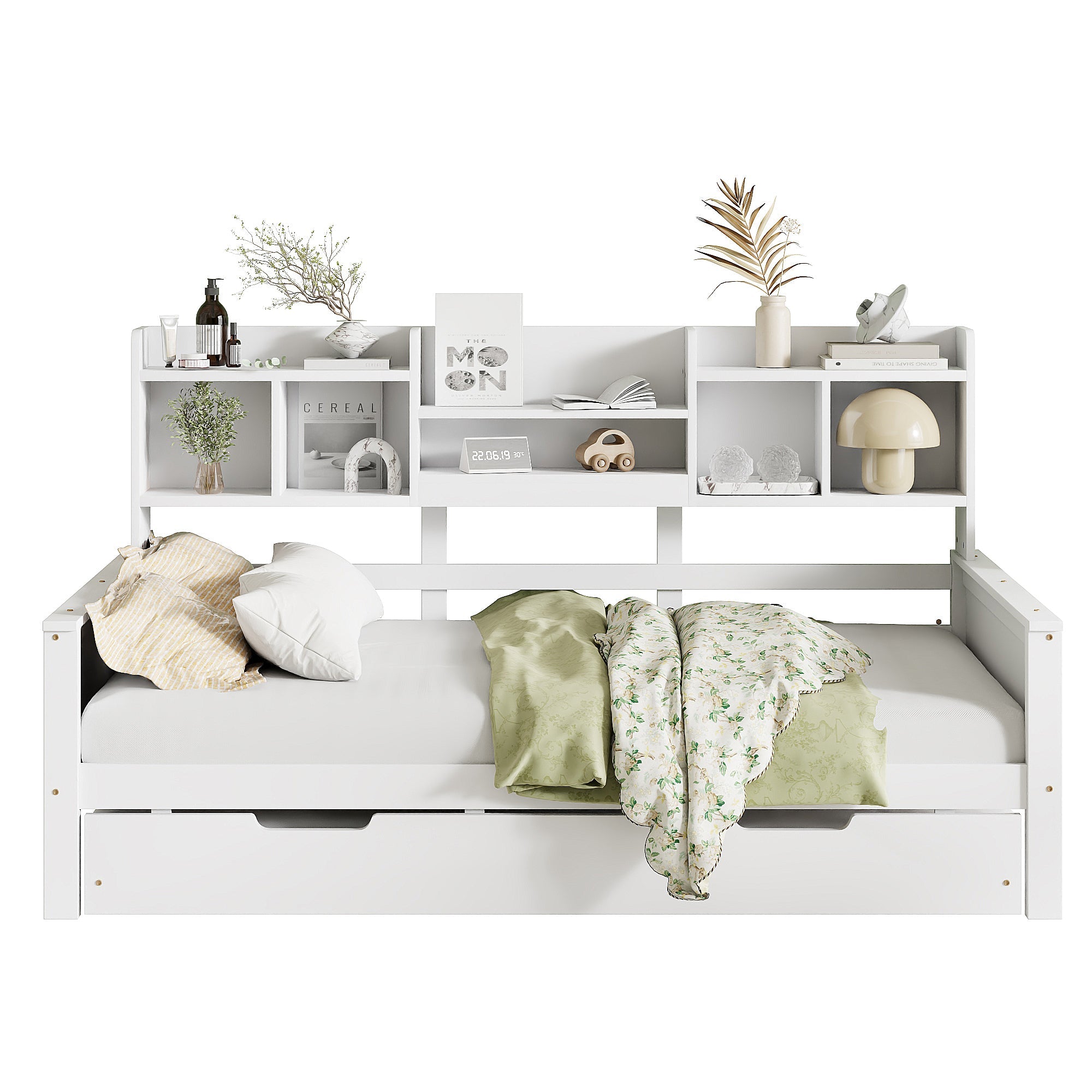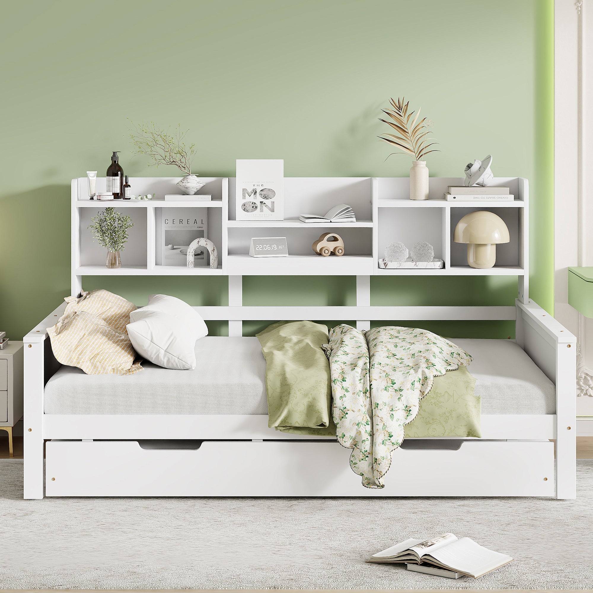 With a pull-out bed underneath, this bed can provide extra sleeping space for guests or family members. Storage compartments on the side of the bed offer space for books or other everyday items.
