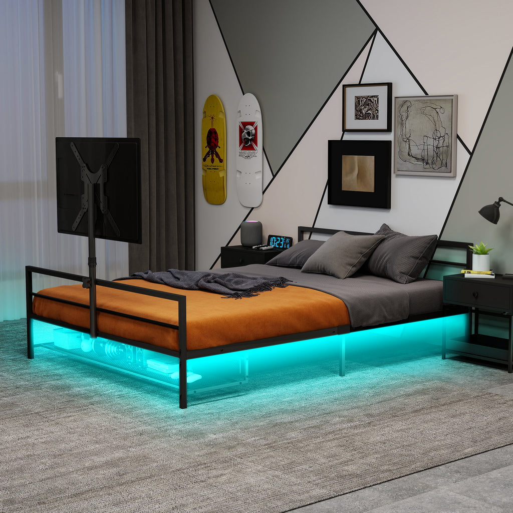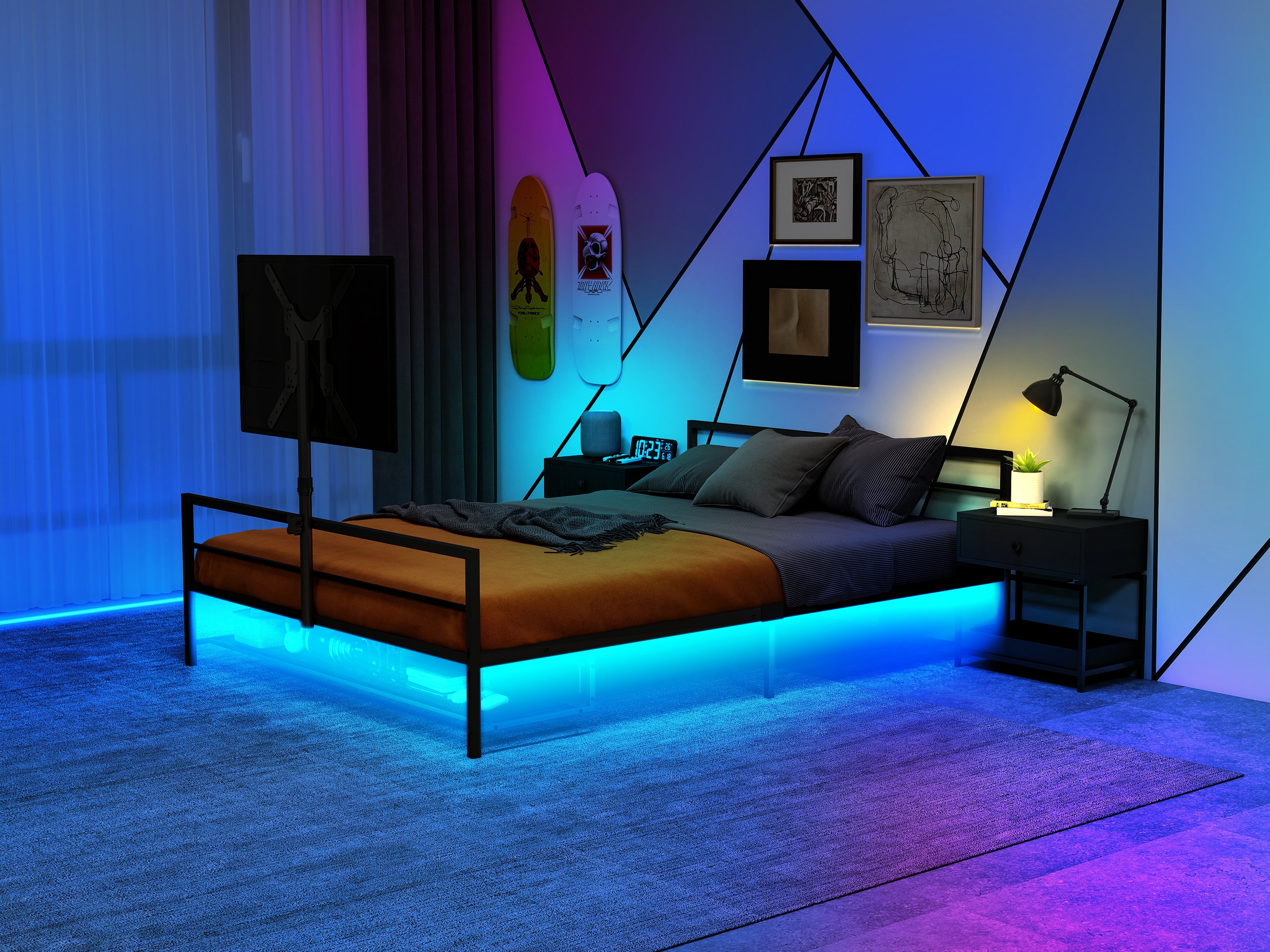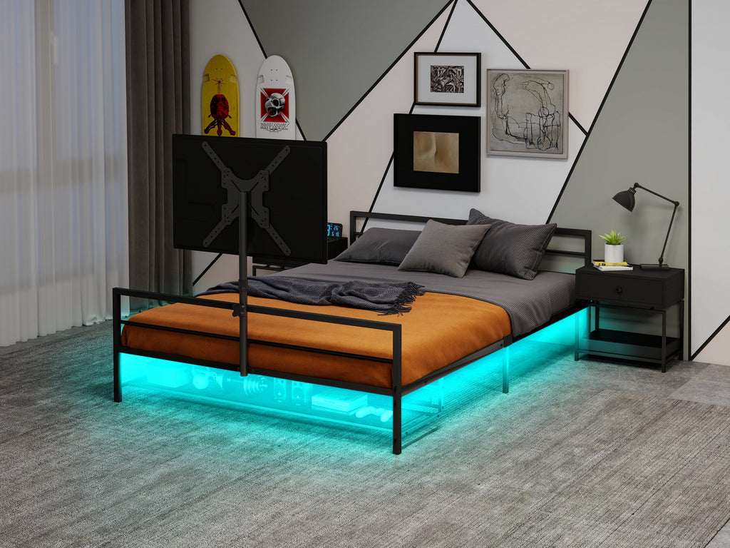 Gaming Bed: Adjustable Holder, LED Lights, Underbed Storage - Black Metal