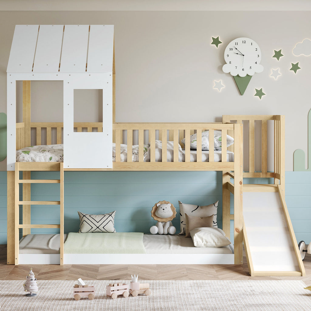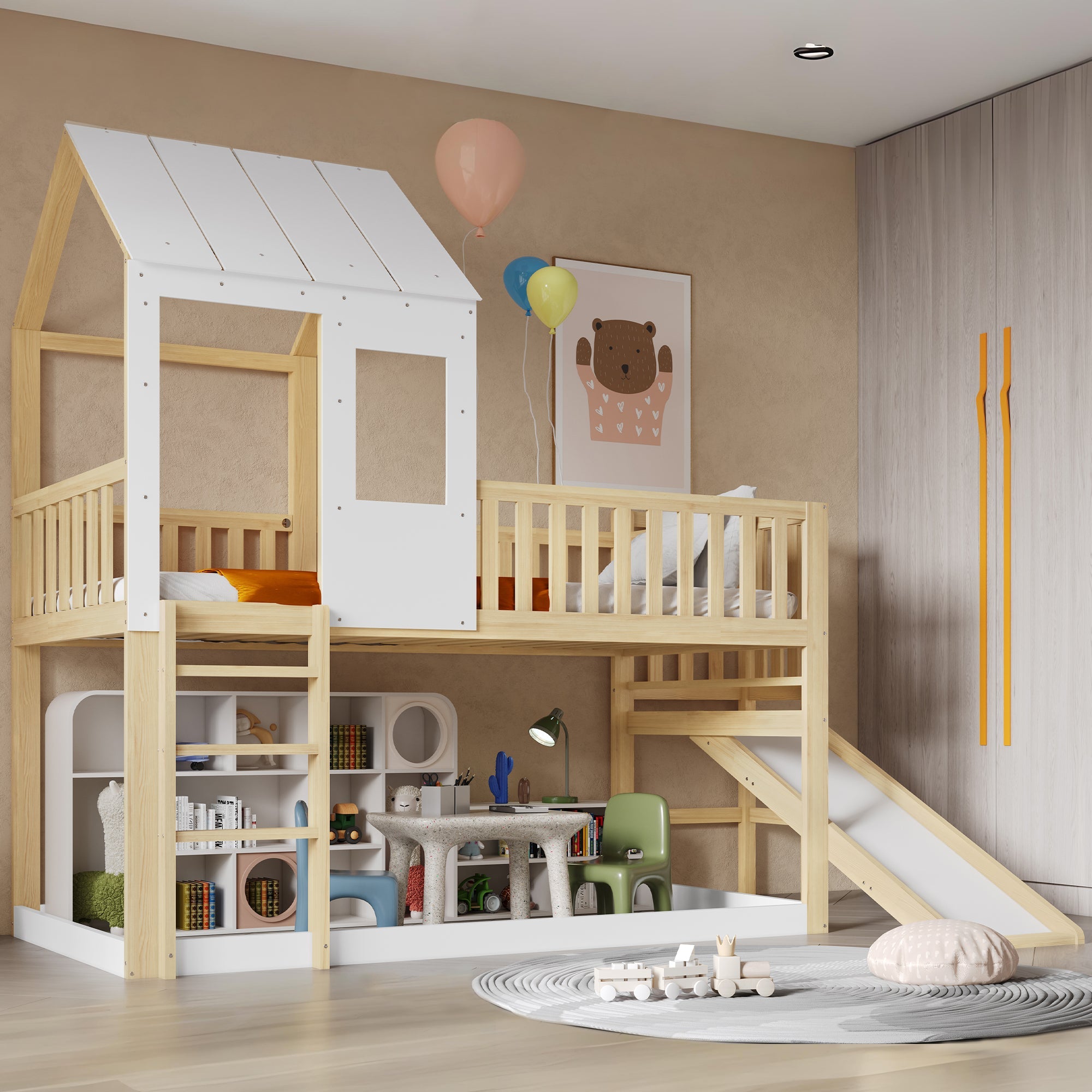 High Sleeper Bed with Slide, Roof, & Storage, 3ft Single, Pine/MDF, White/Wood Colour