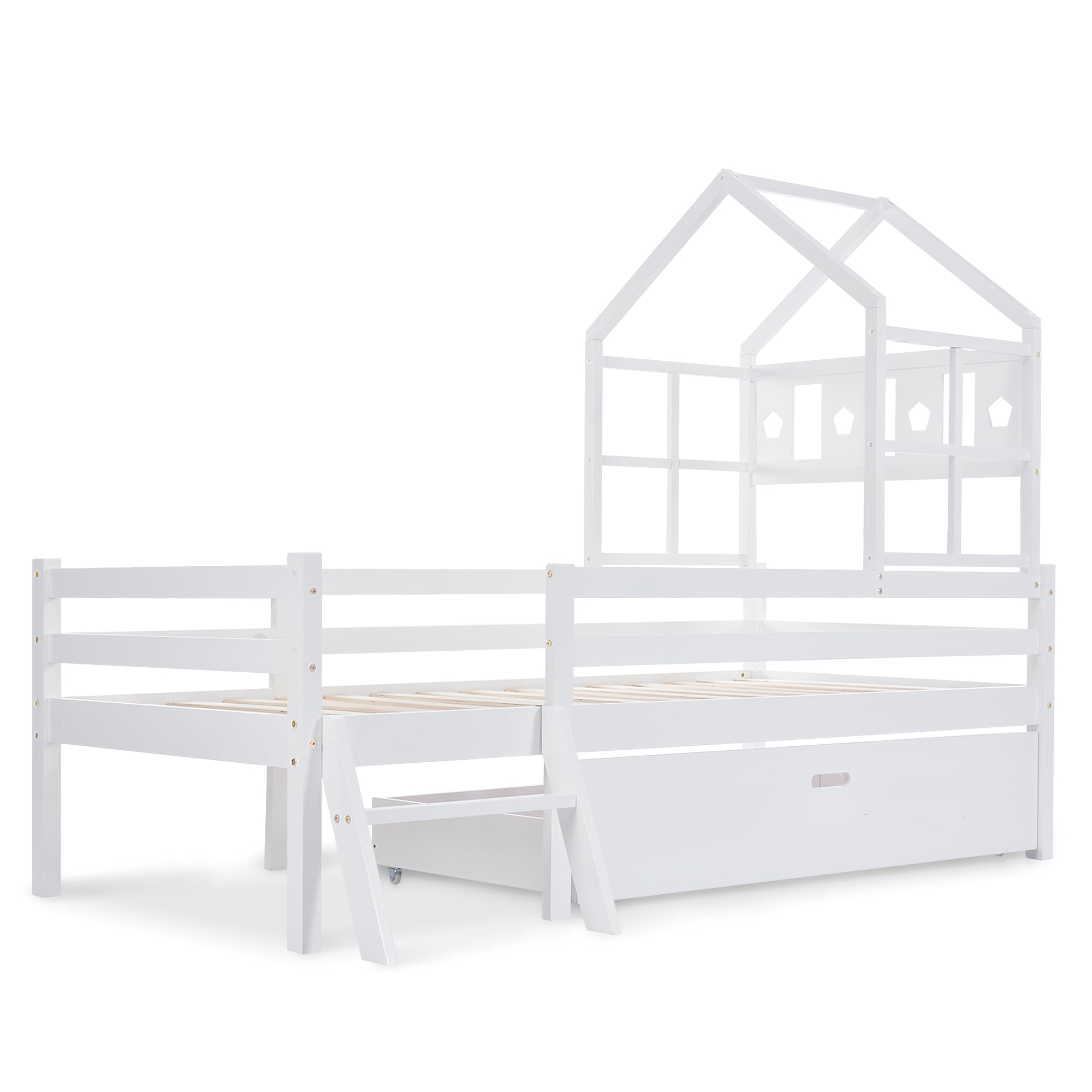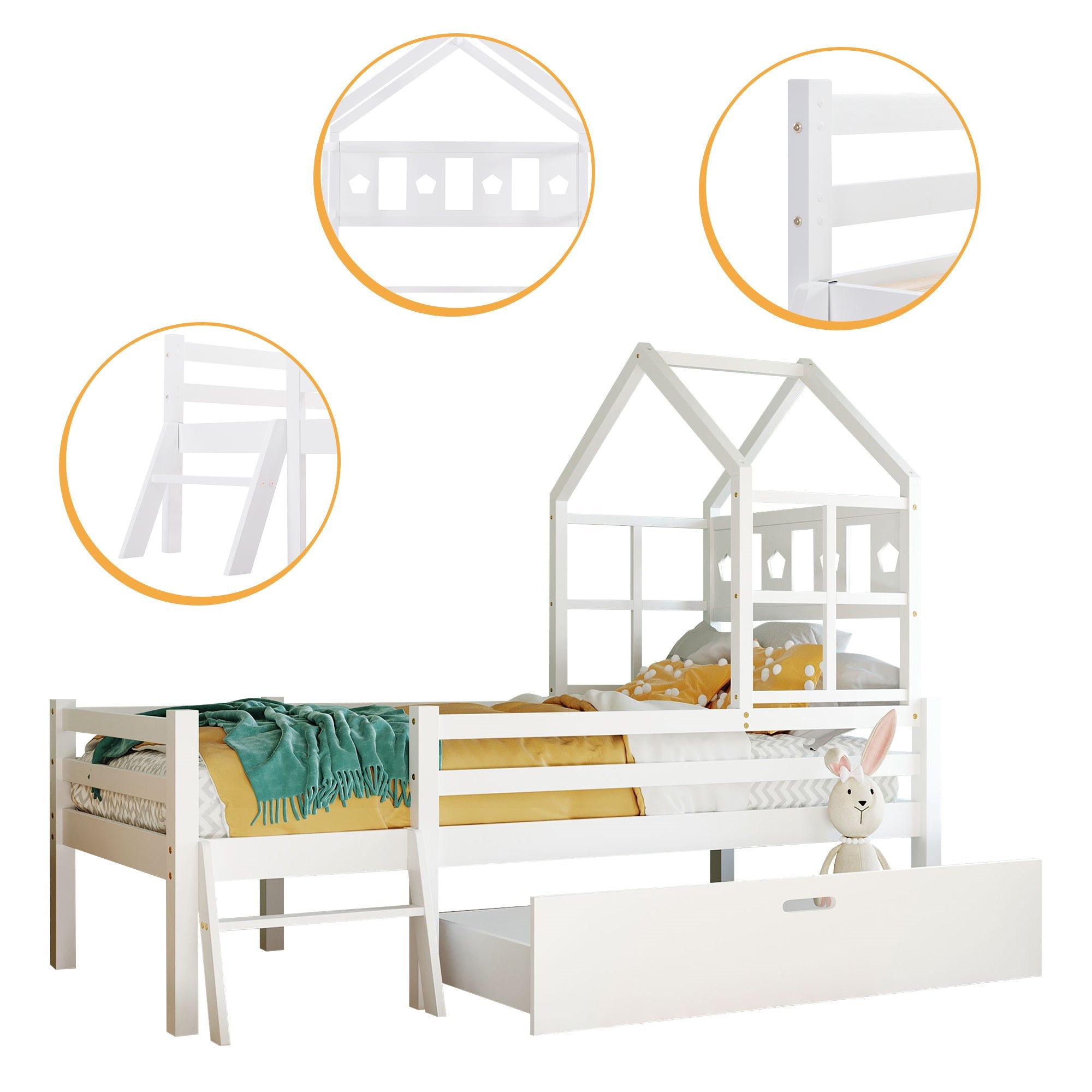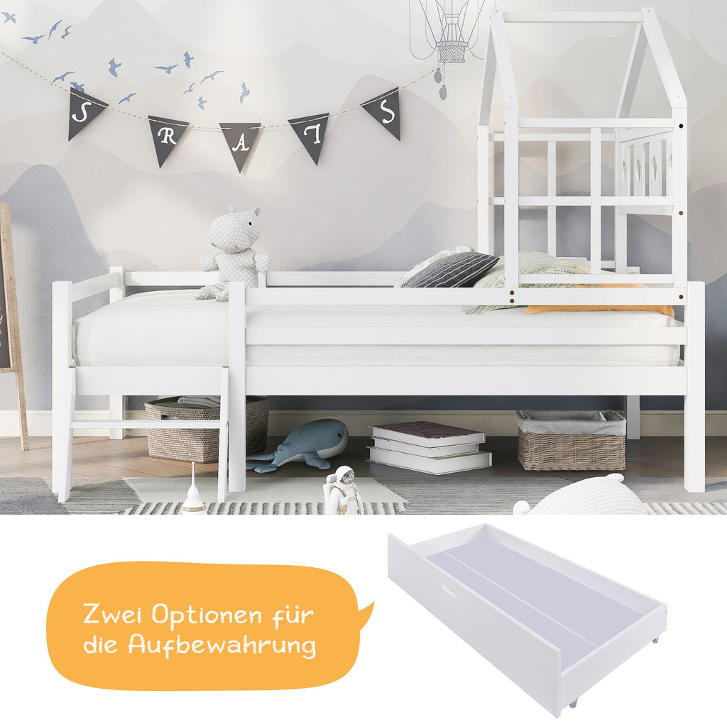 House Bed Children's, Ladder, Drawers, Loft Bed, Fall Protection, Solid Wood, 90x200cm White