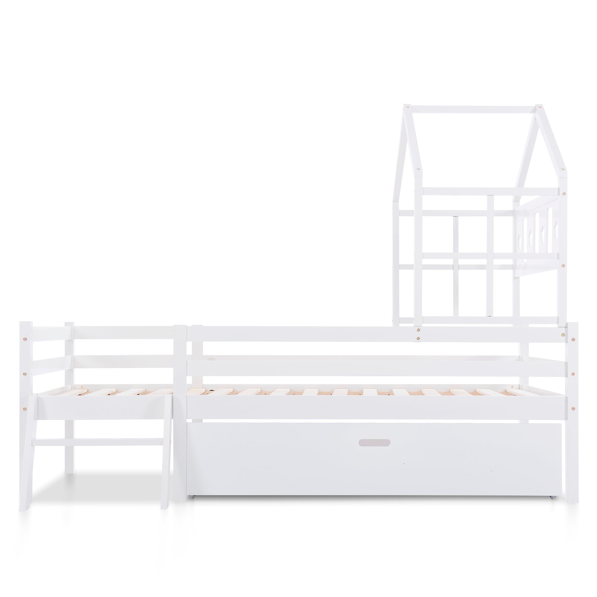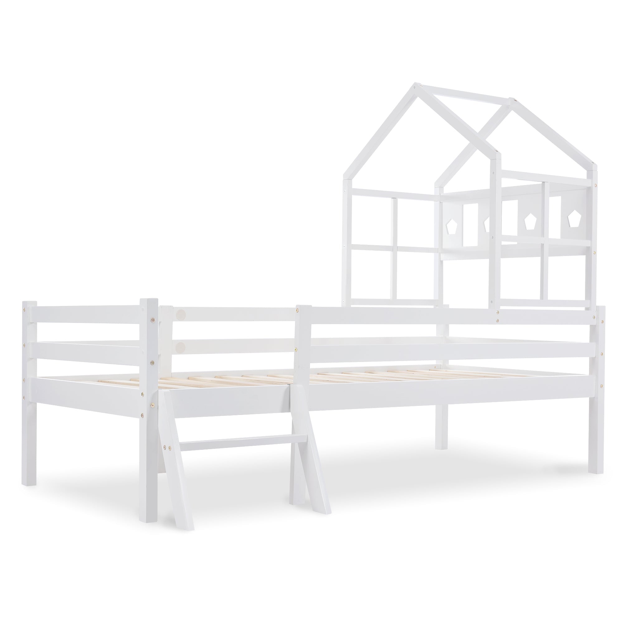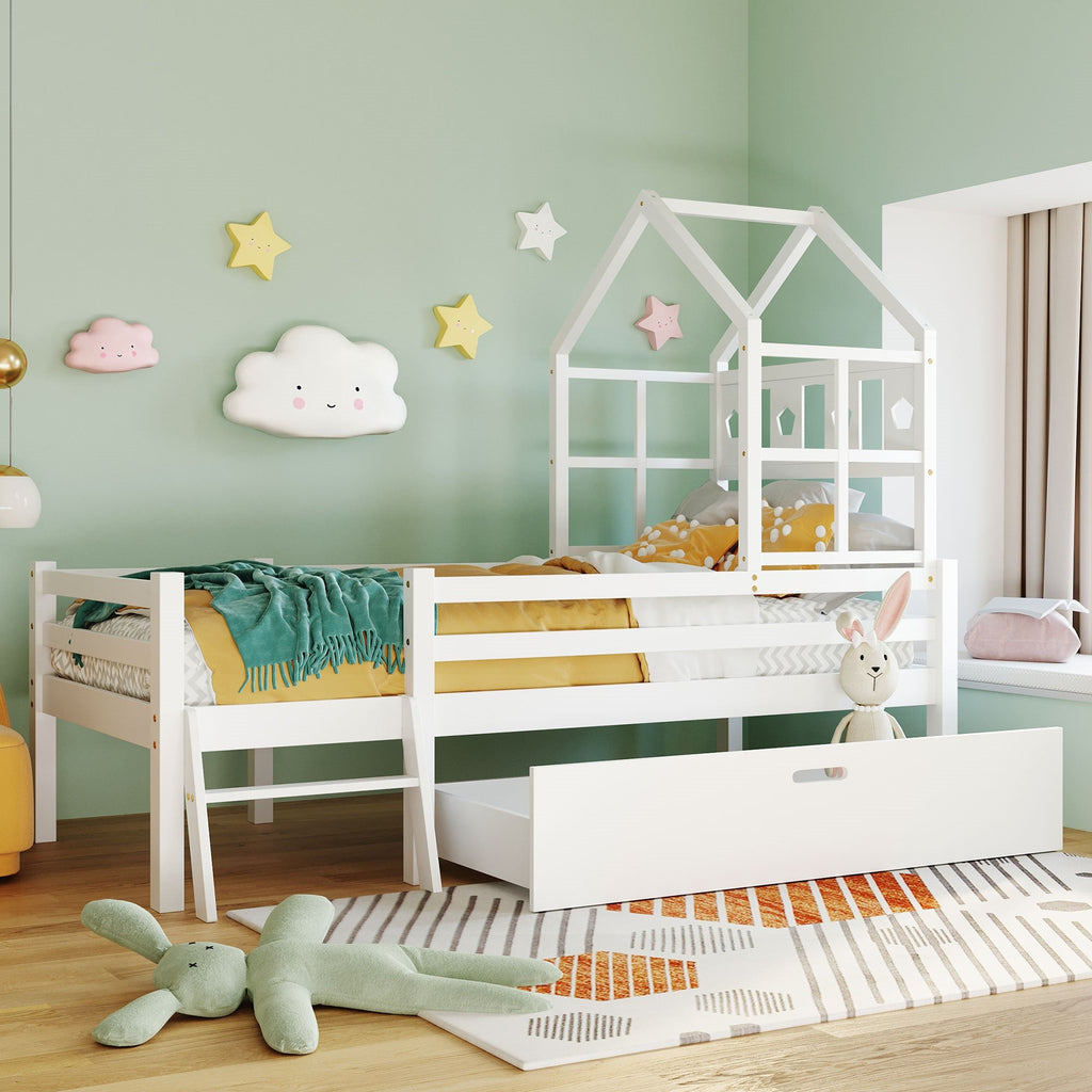 House Bed Children's, Ladder, Drawers, Loft Bed, Fall Protection, Solid Wood, 90x200cm White