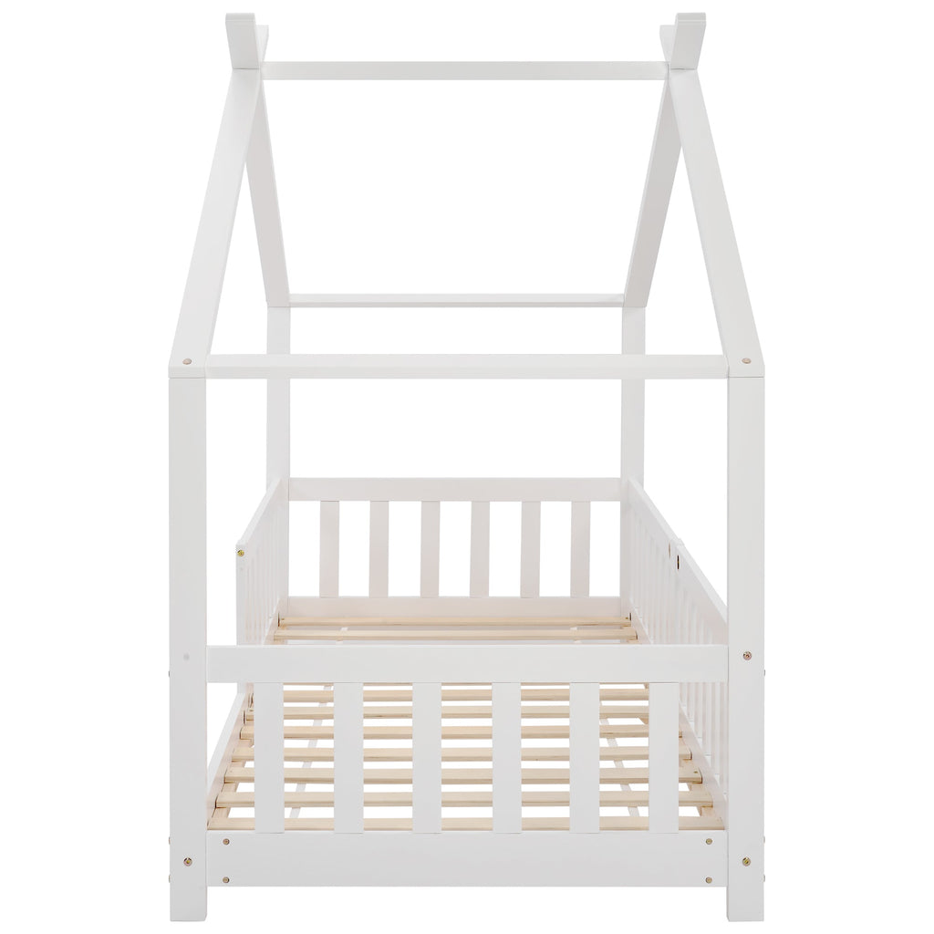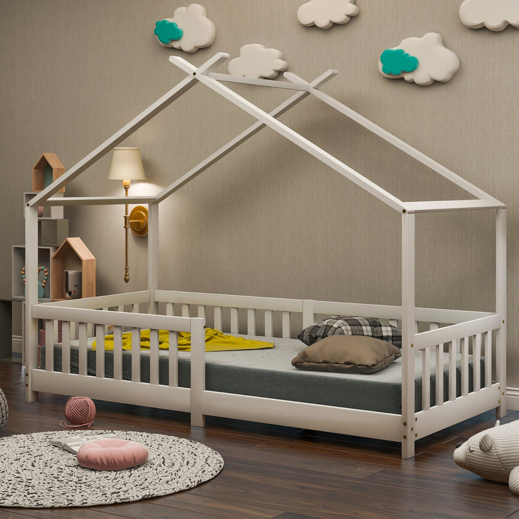 House Bed, Solid Wood with Fence & Slatted Frame, Fall Protection, White