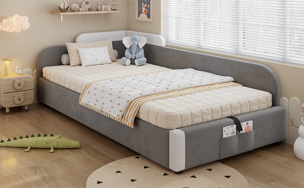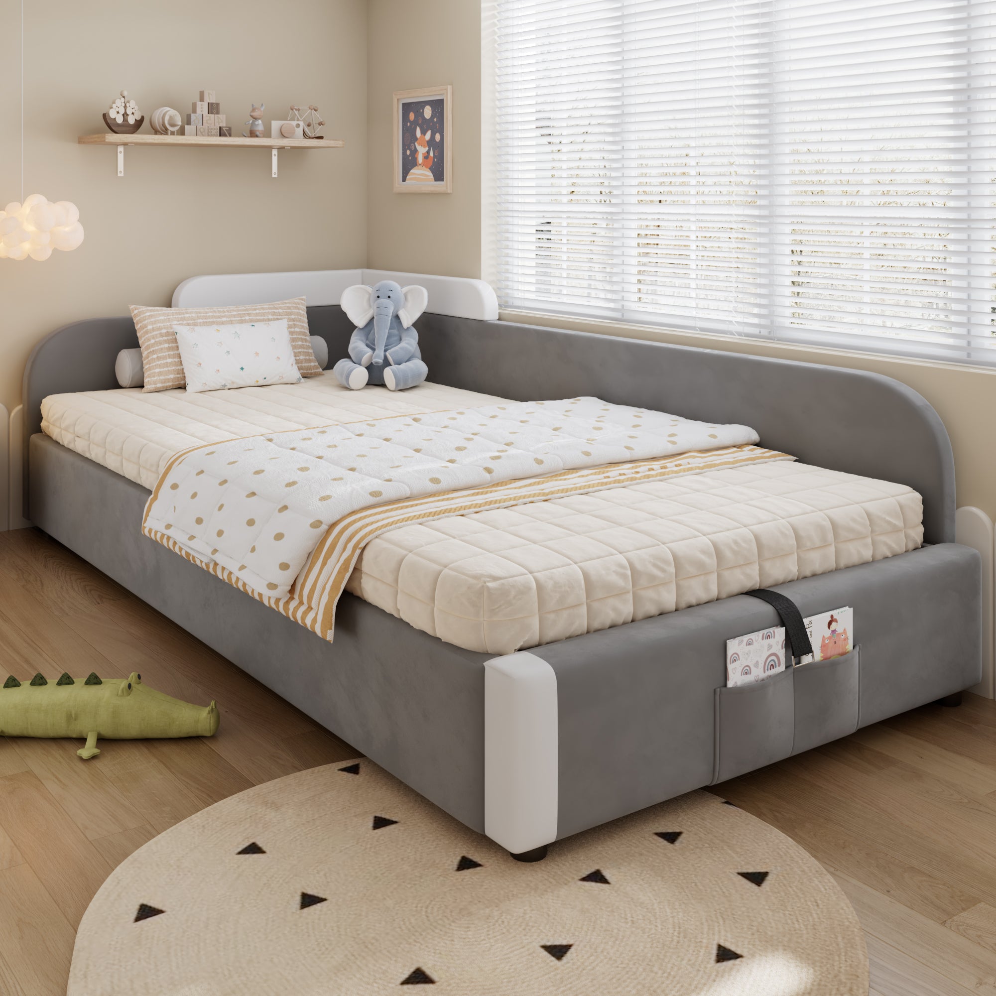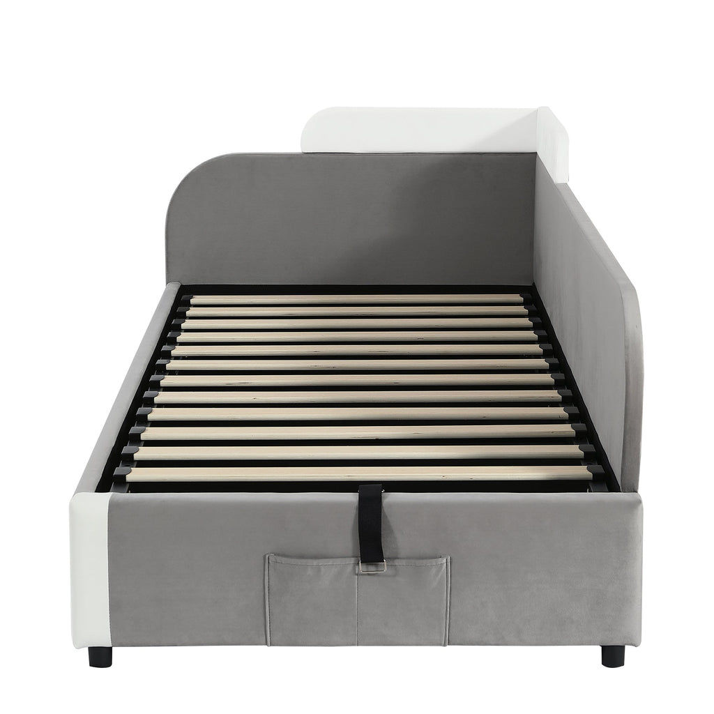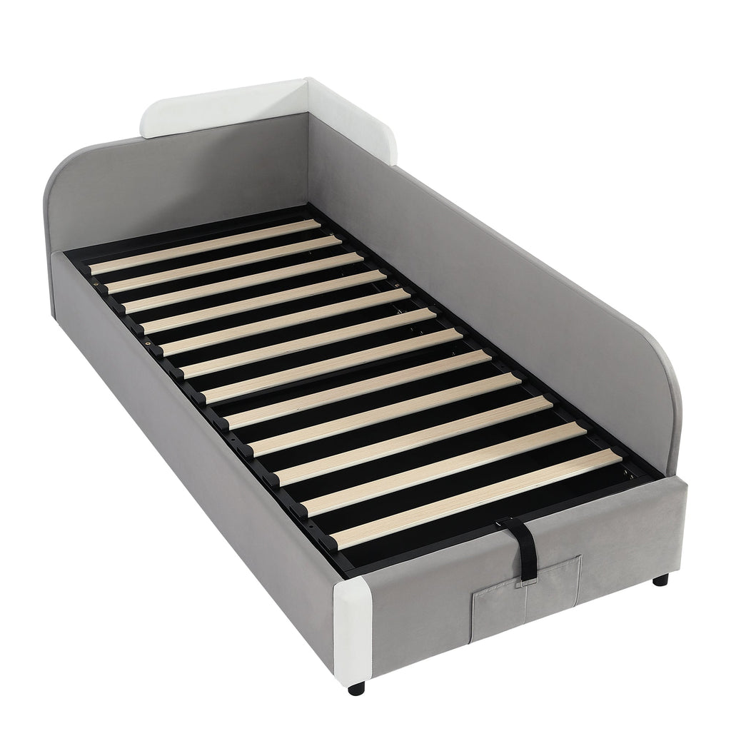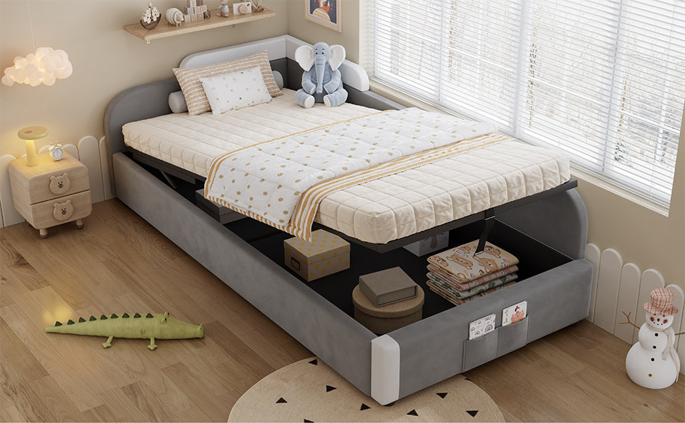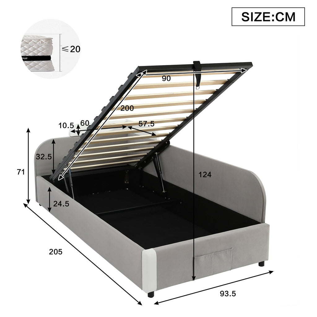 Hydraulic Bed with Storage, Raised Soft Fence, Right Side Panel, Velvet + Plywood, Gray