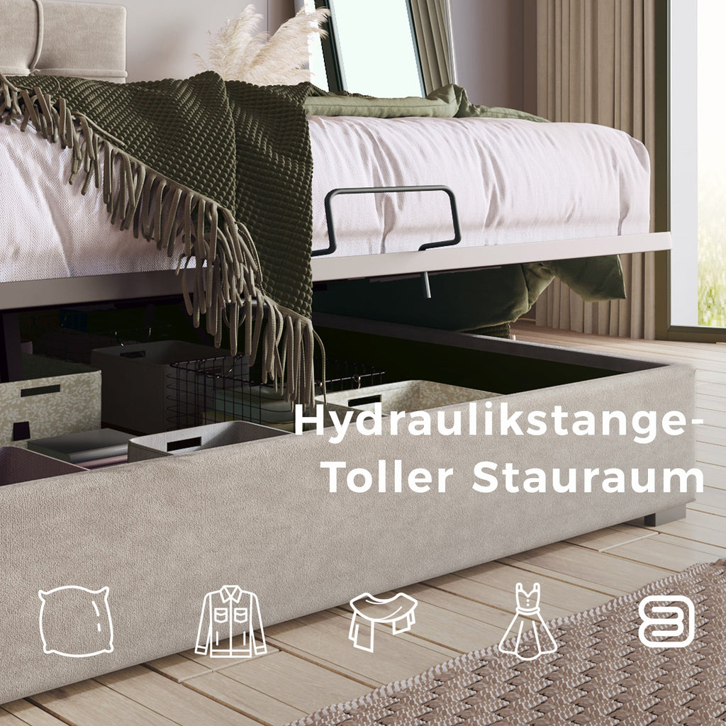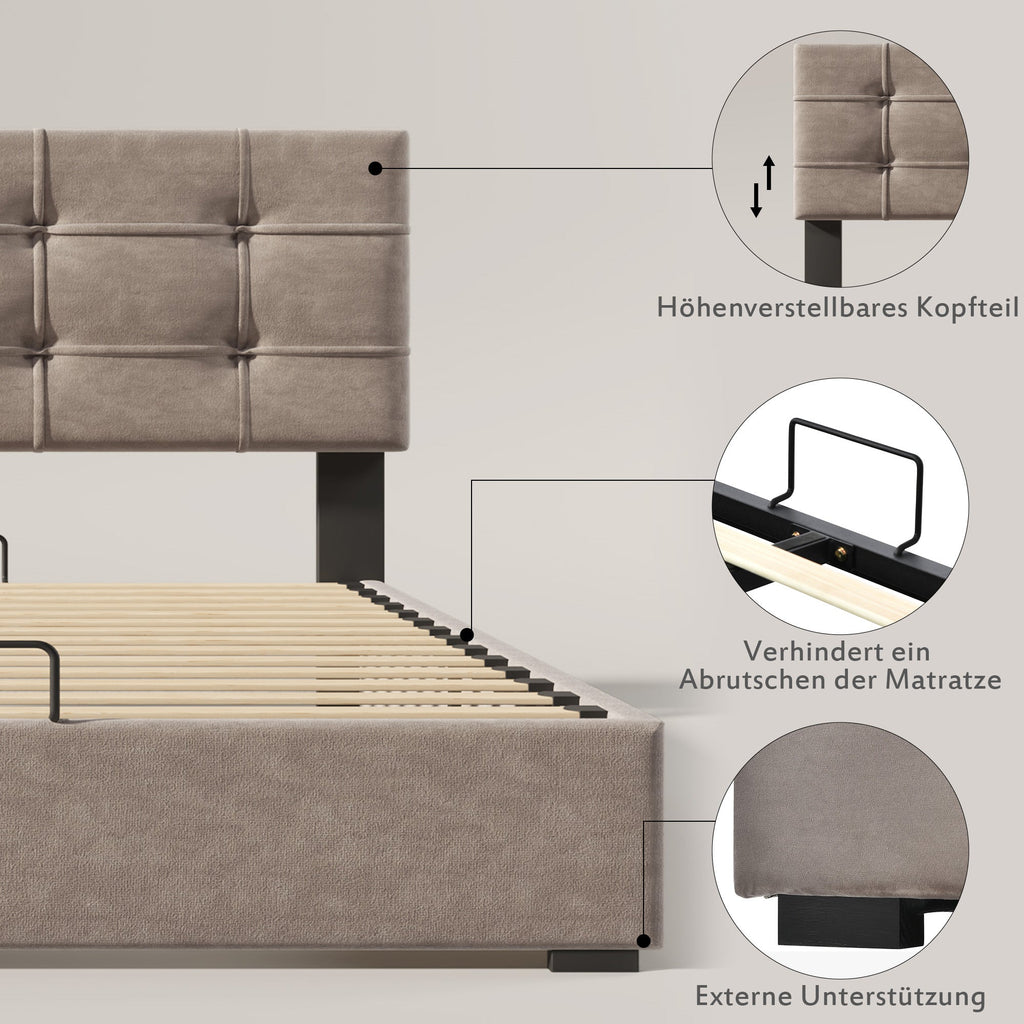 Hydraulic Double Upholstered Bed, 140x200cm with Adjustable Headboard, Metal Slatted Frame, Velvet Light Grey