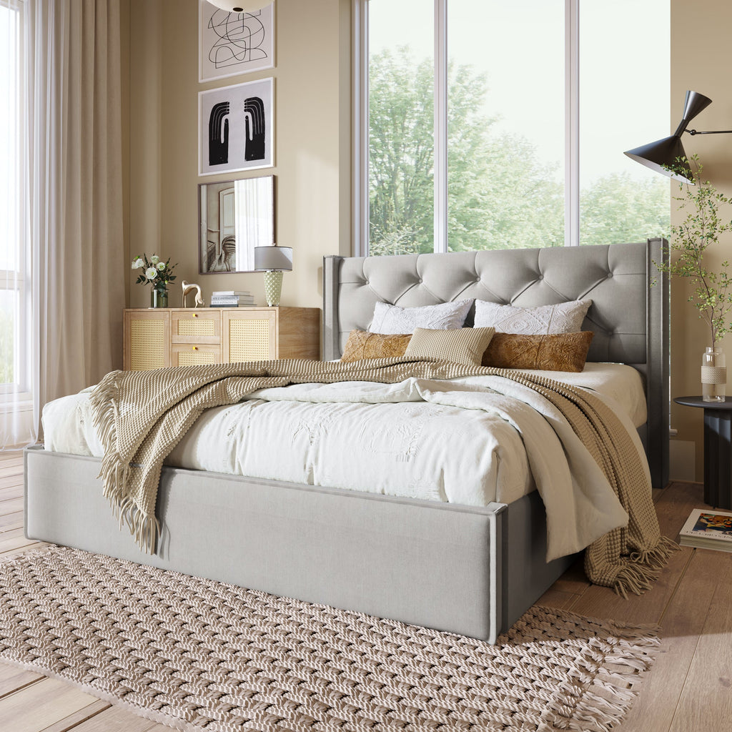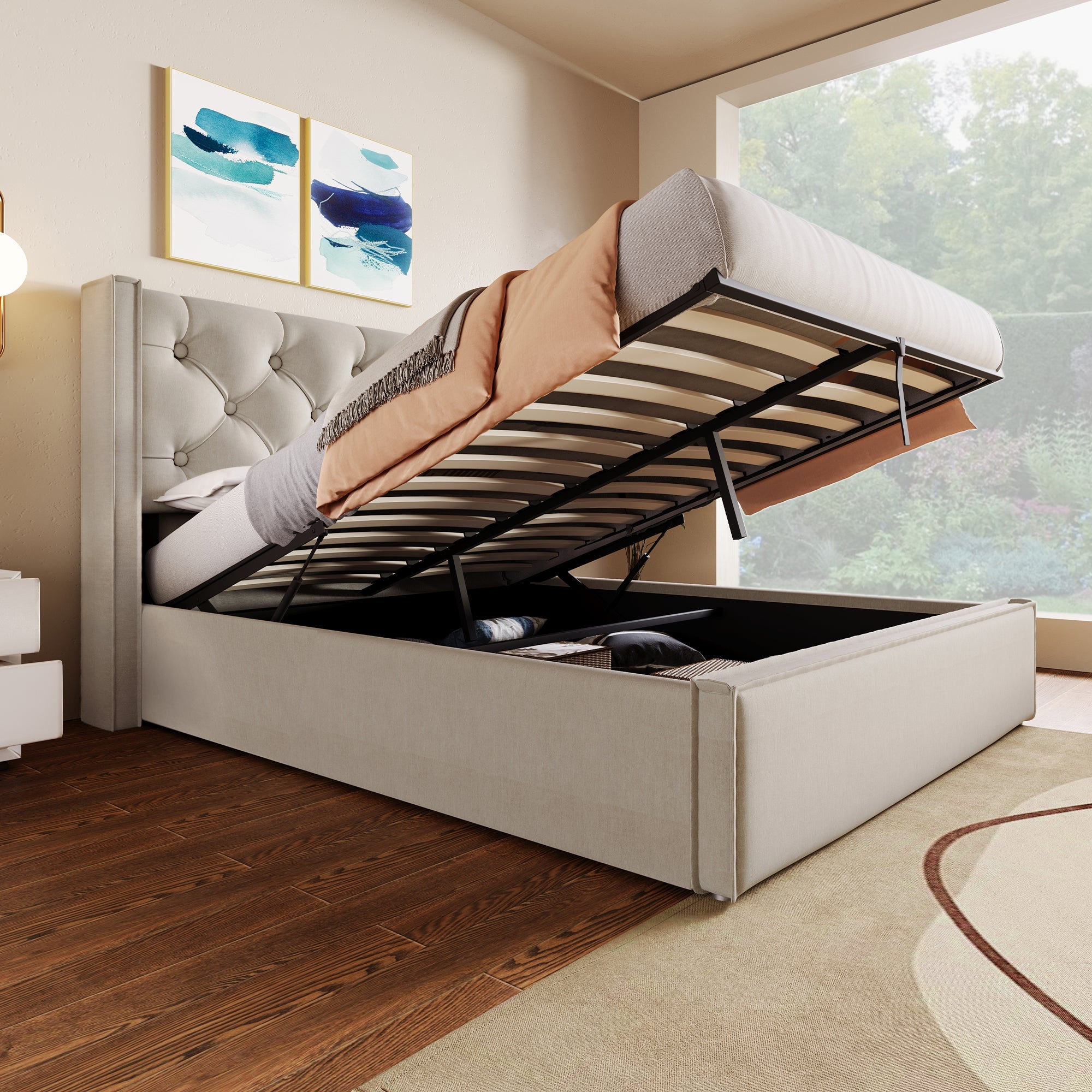 Hydraulic Double Upholstered Bed, 140x200cm with Metal Frame & Storage, Cotton Light Grey