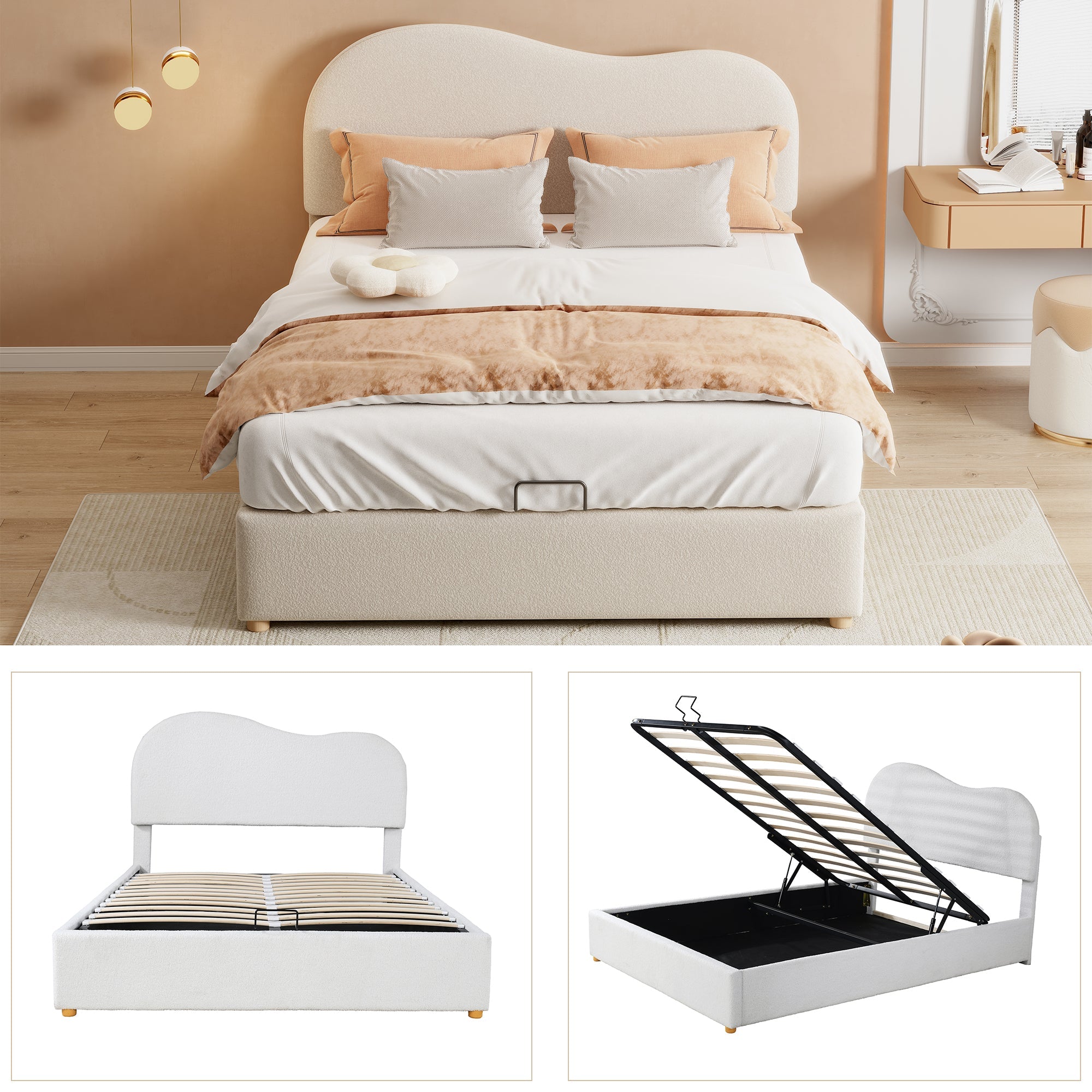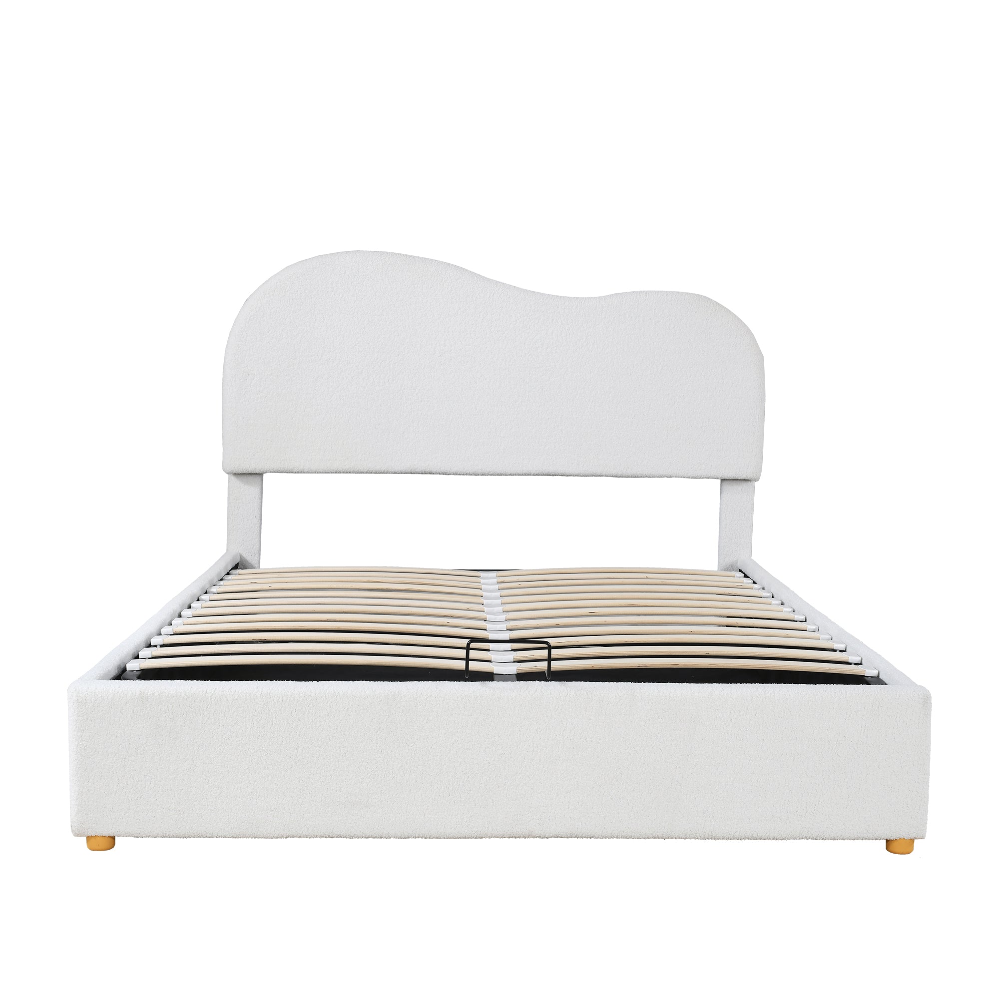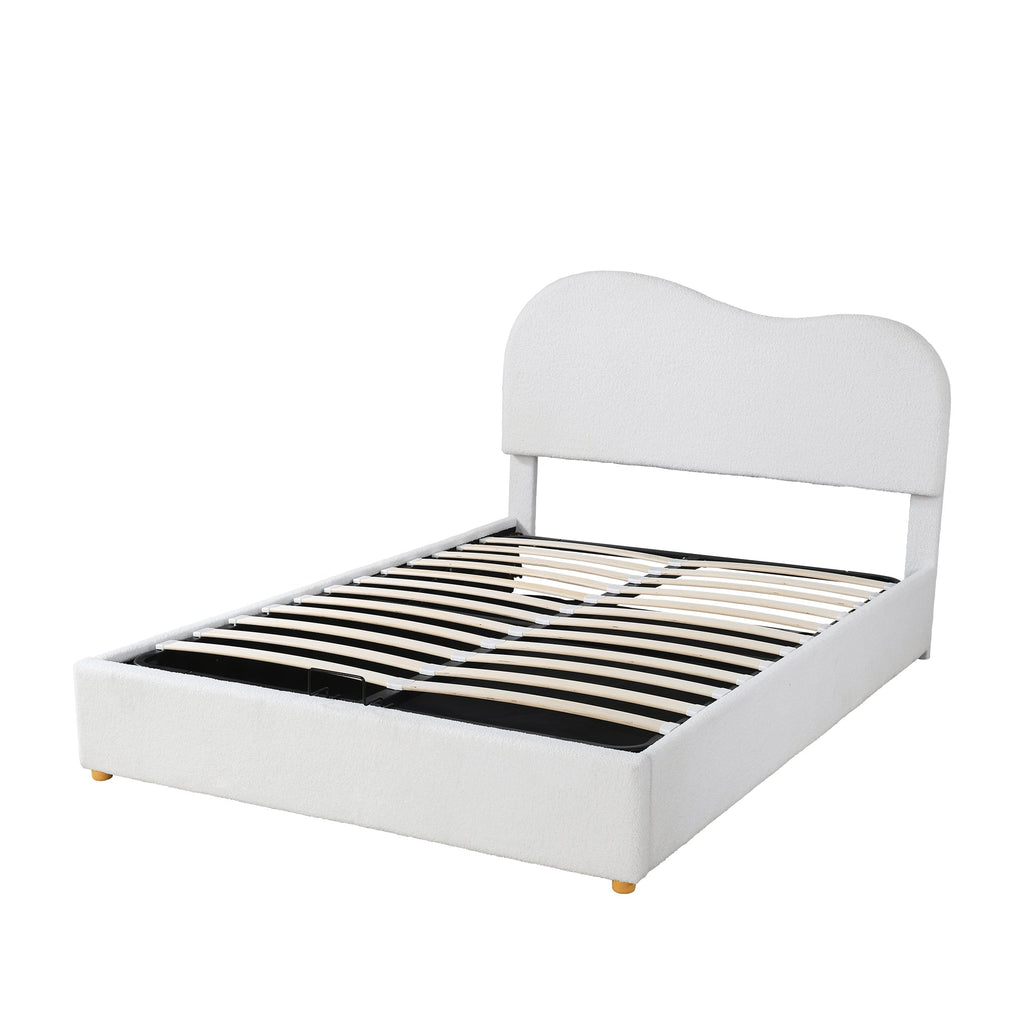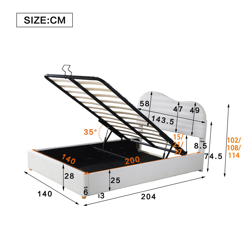Hydraulic Double Upholstered Bed, Adjustable Headboard with Storage, White Fleece, 140x200cm
