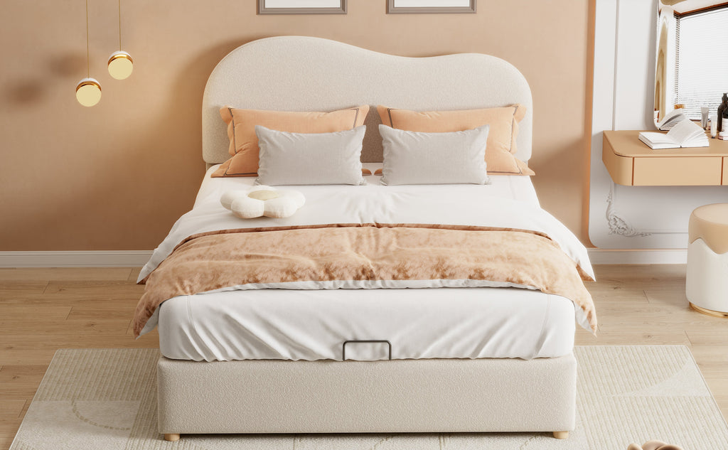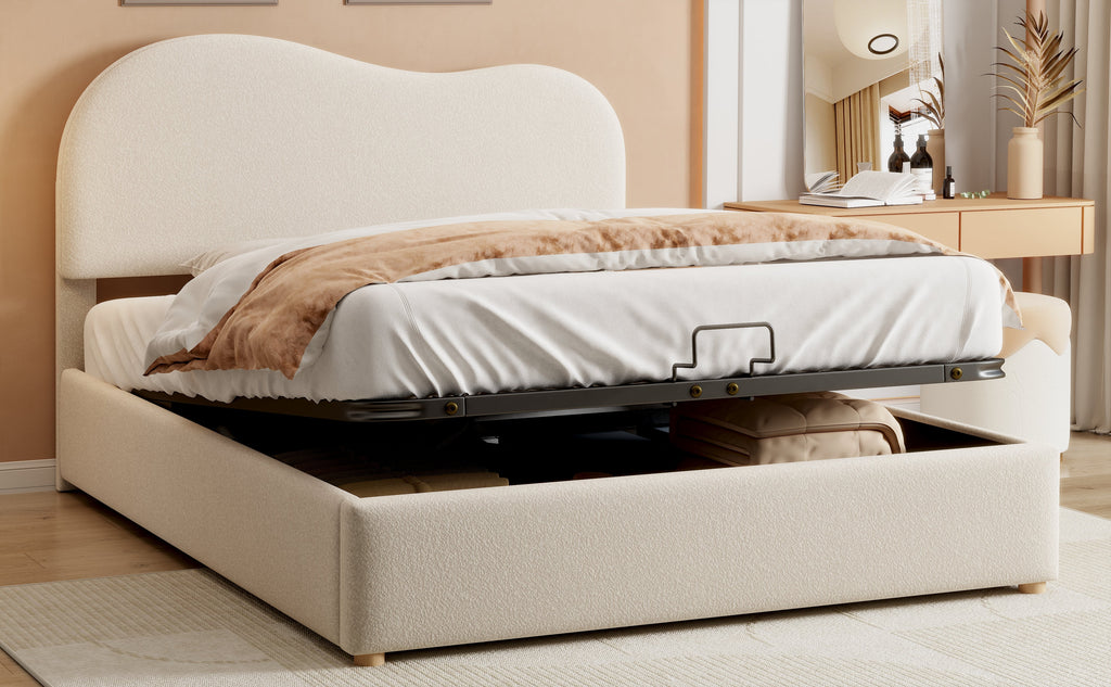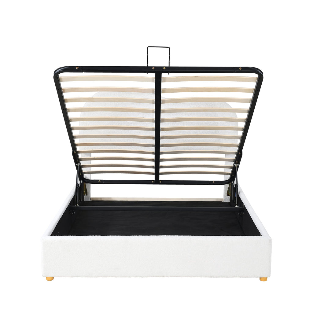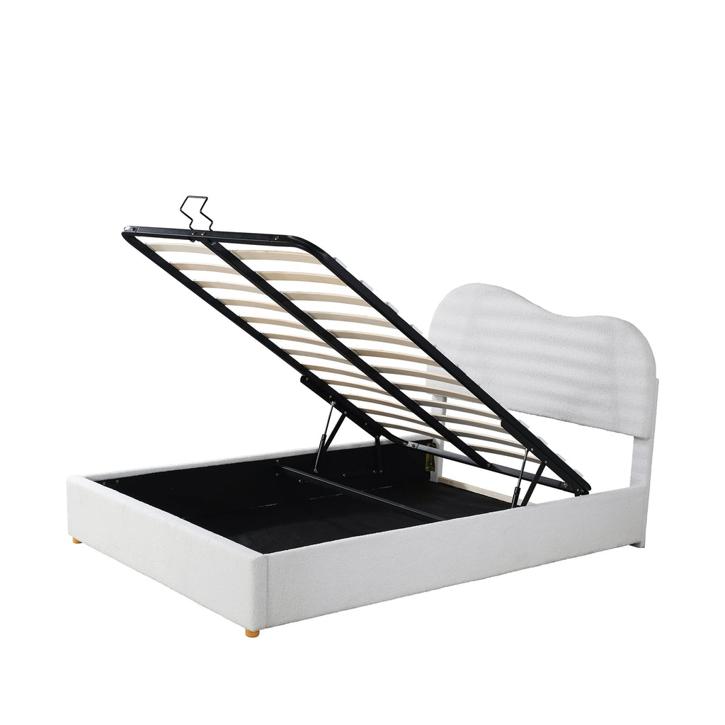 Hydraulic Double Upholstered Bed, Adjustable Headboard with Storage, White Fleece, 140x200cm