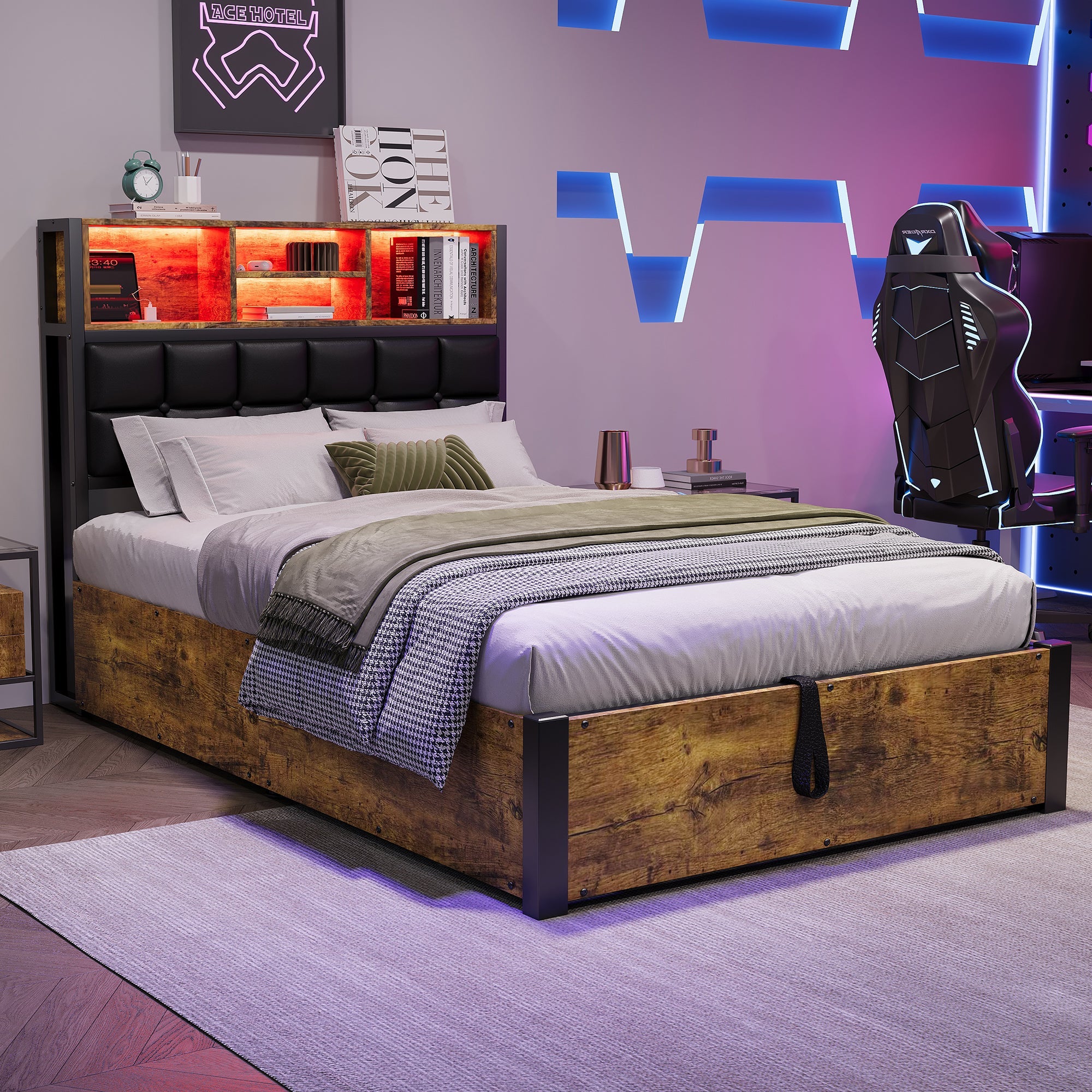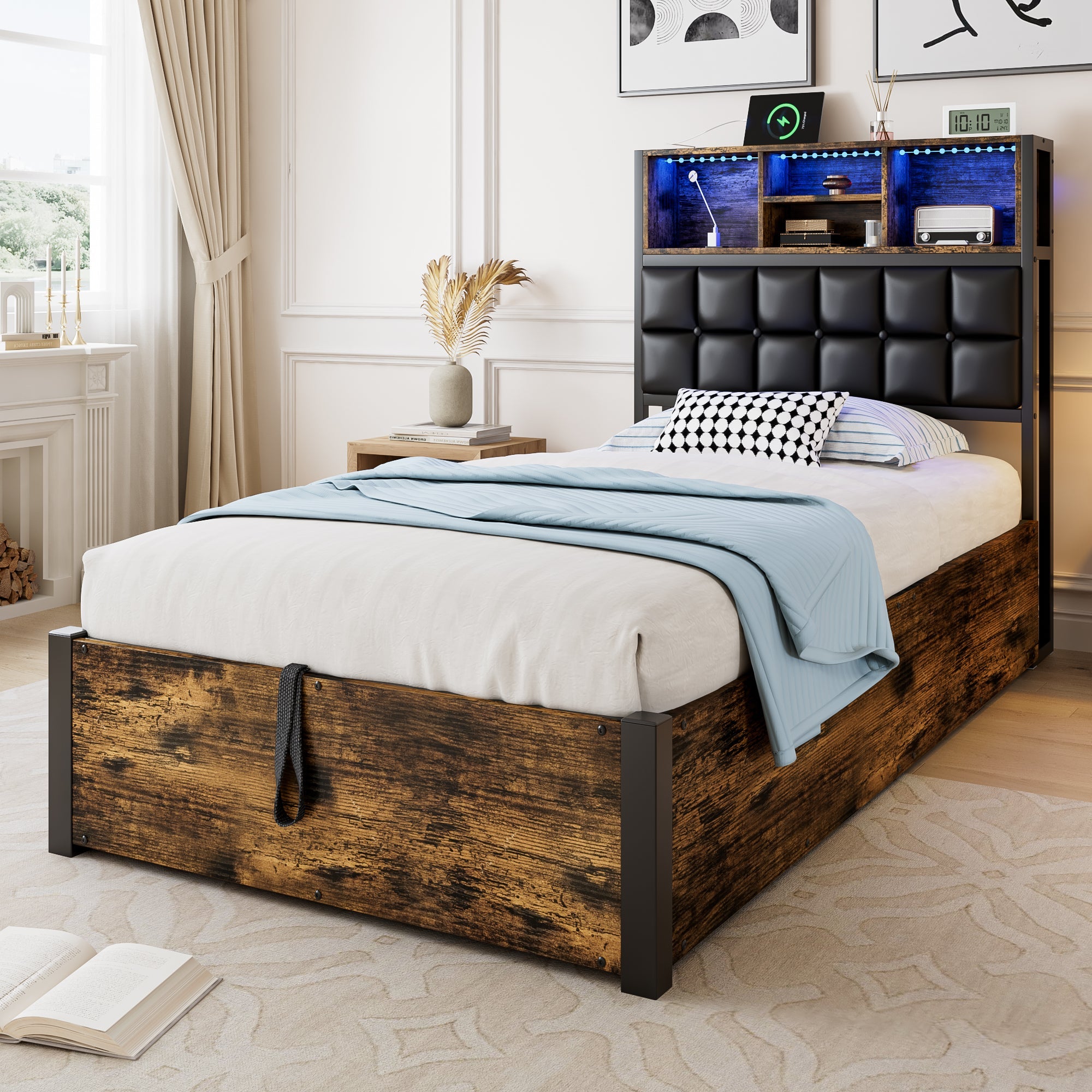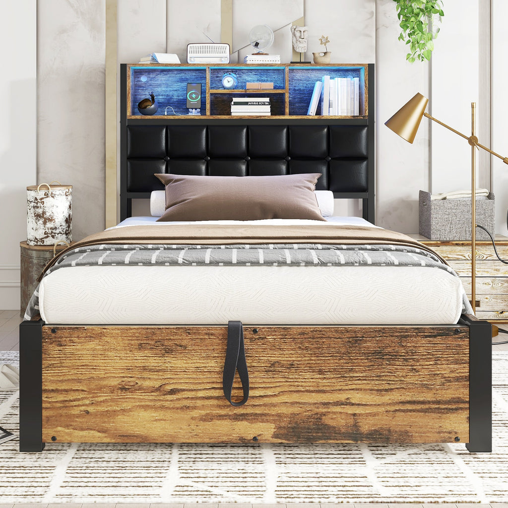 Hydraulic Metal Bed with Charging Port, LED Light, and Storage Headboard, Black + Wood