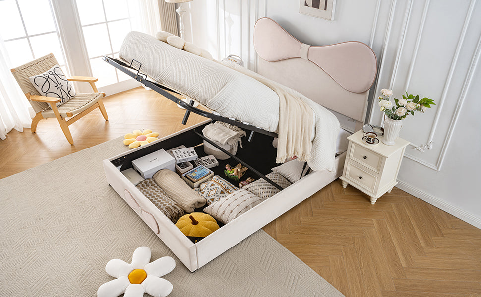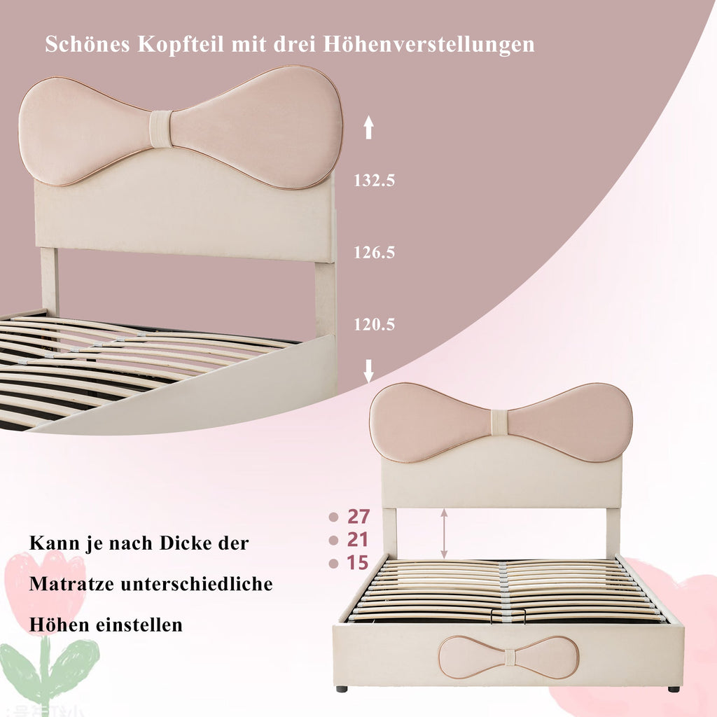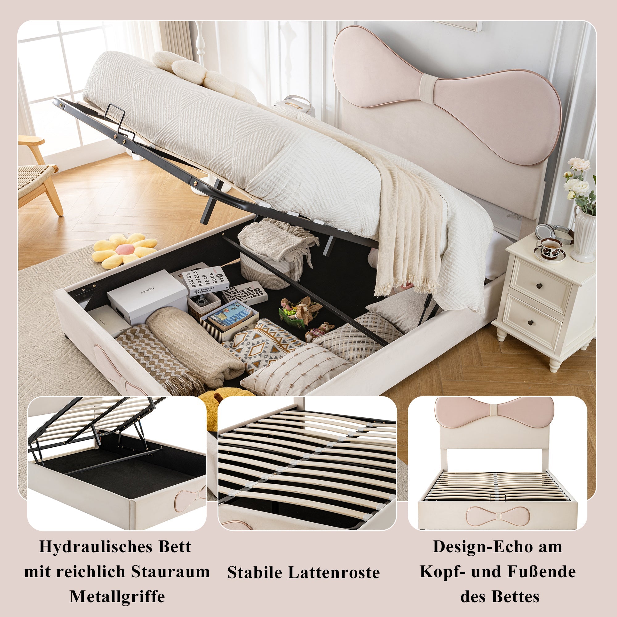 Hydraulic Upholstered Bed, Double with Adjustable Headboard, Storage, Velvet Beige+Pink