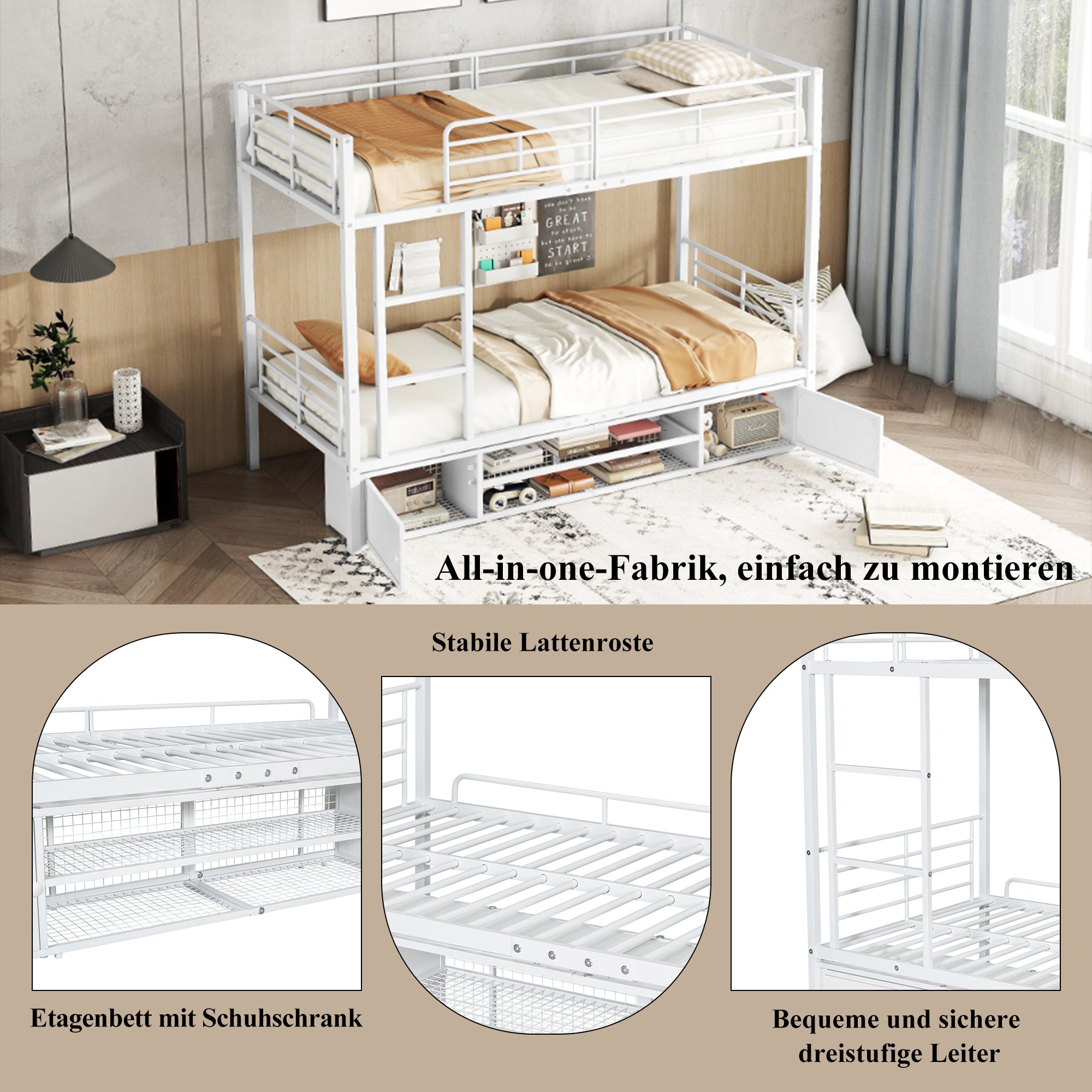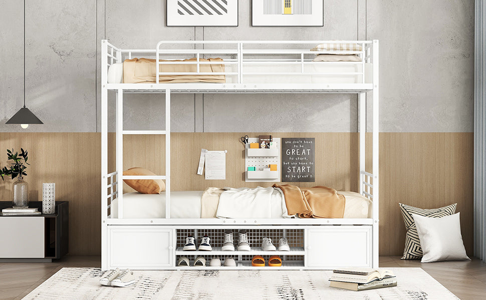 Iron Frame Bunk Bed, Open Shoe Rack, Double-Door Storage Cabinet, Iron, White