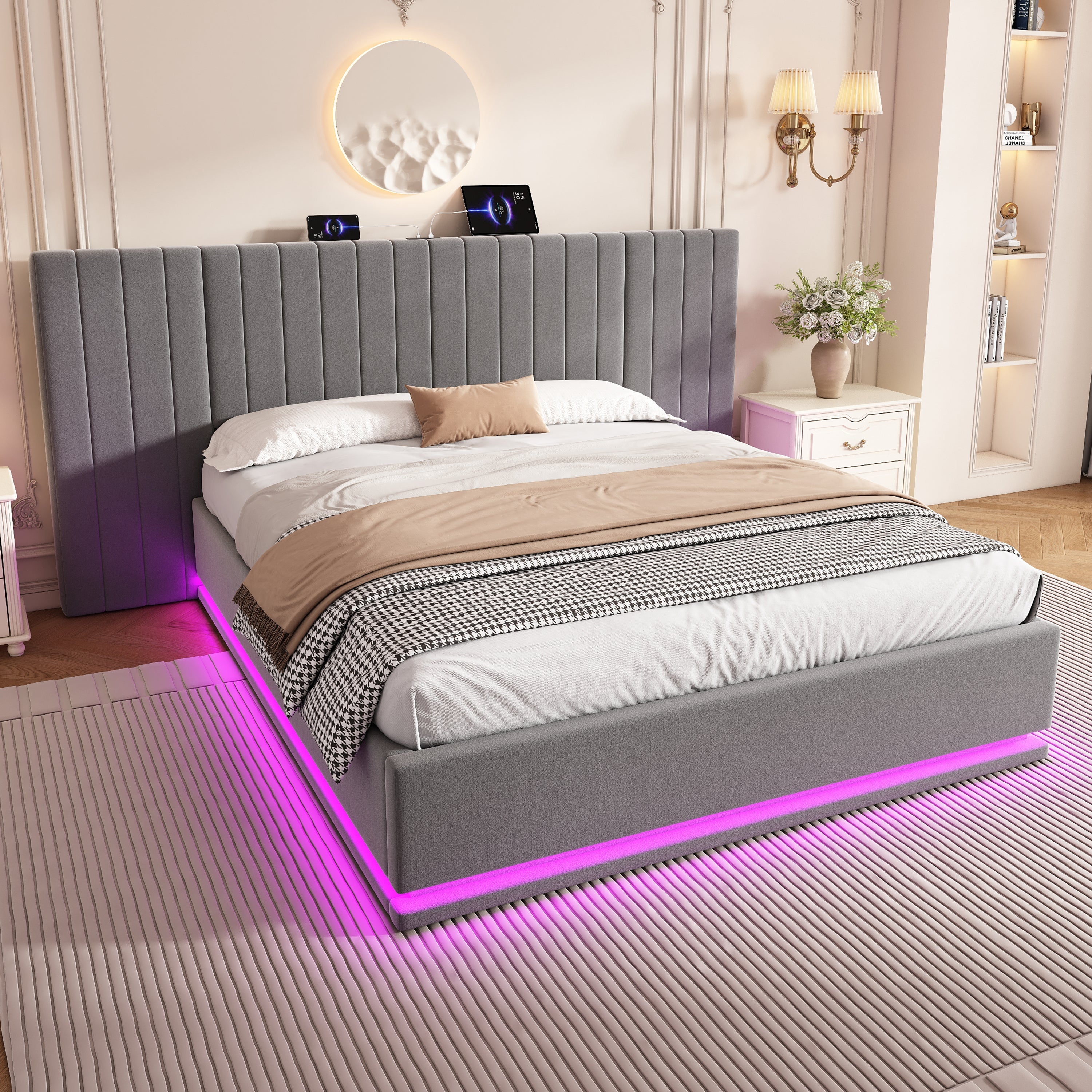 King Ottoman Bed with LED Storage and Charging Station, Velvet Grey