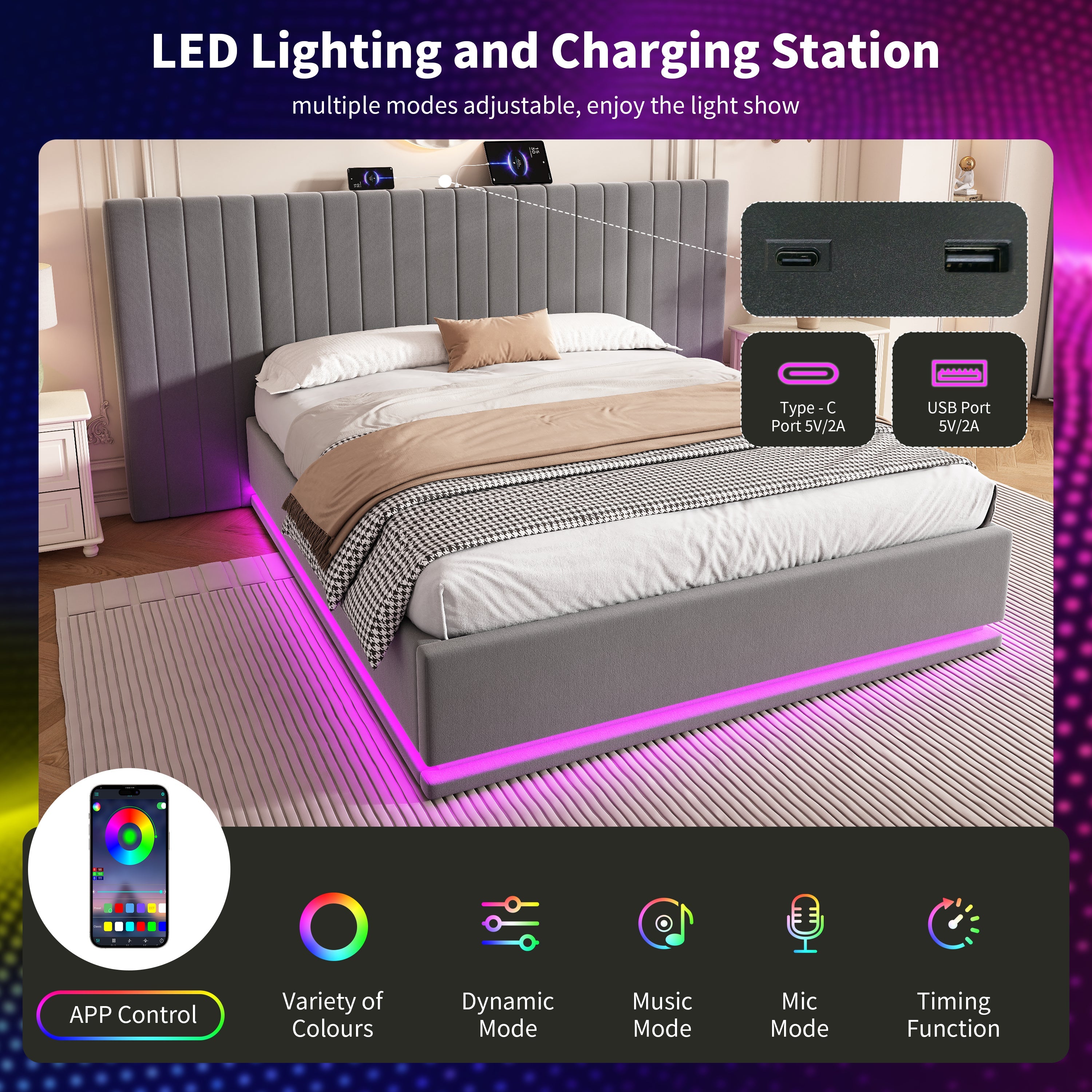 Storage and Charging: The premium hydraulic lift mechanism provides ample storage space under the bed. You can store blankets, pillows, bed linen, or toys in the large storage box beneath the fold-up slatted frame. The wide headboard is equipped with Type-C and USB ports to ensure your devices are always charged and ready to use.
