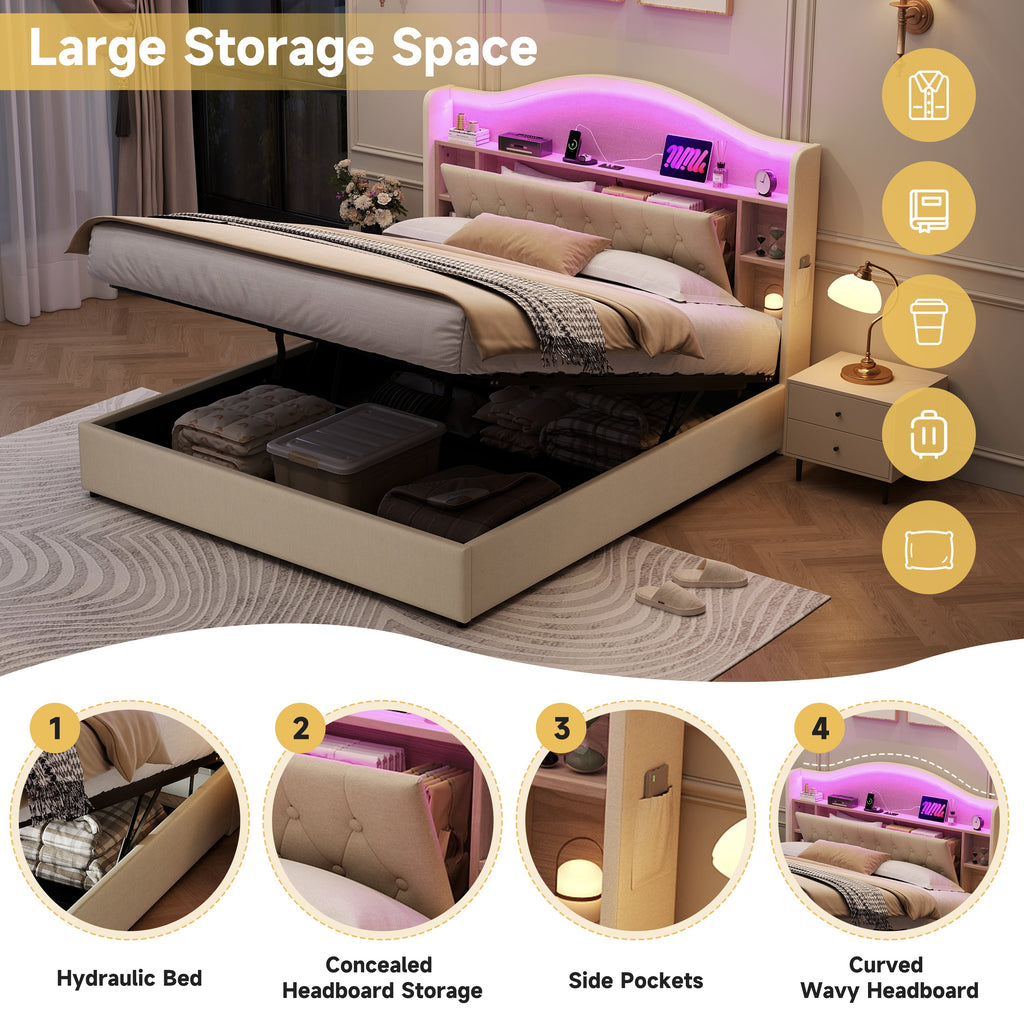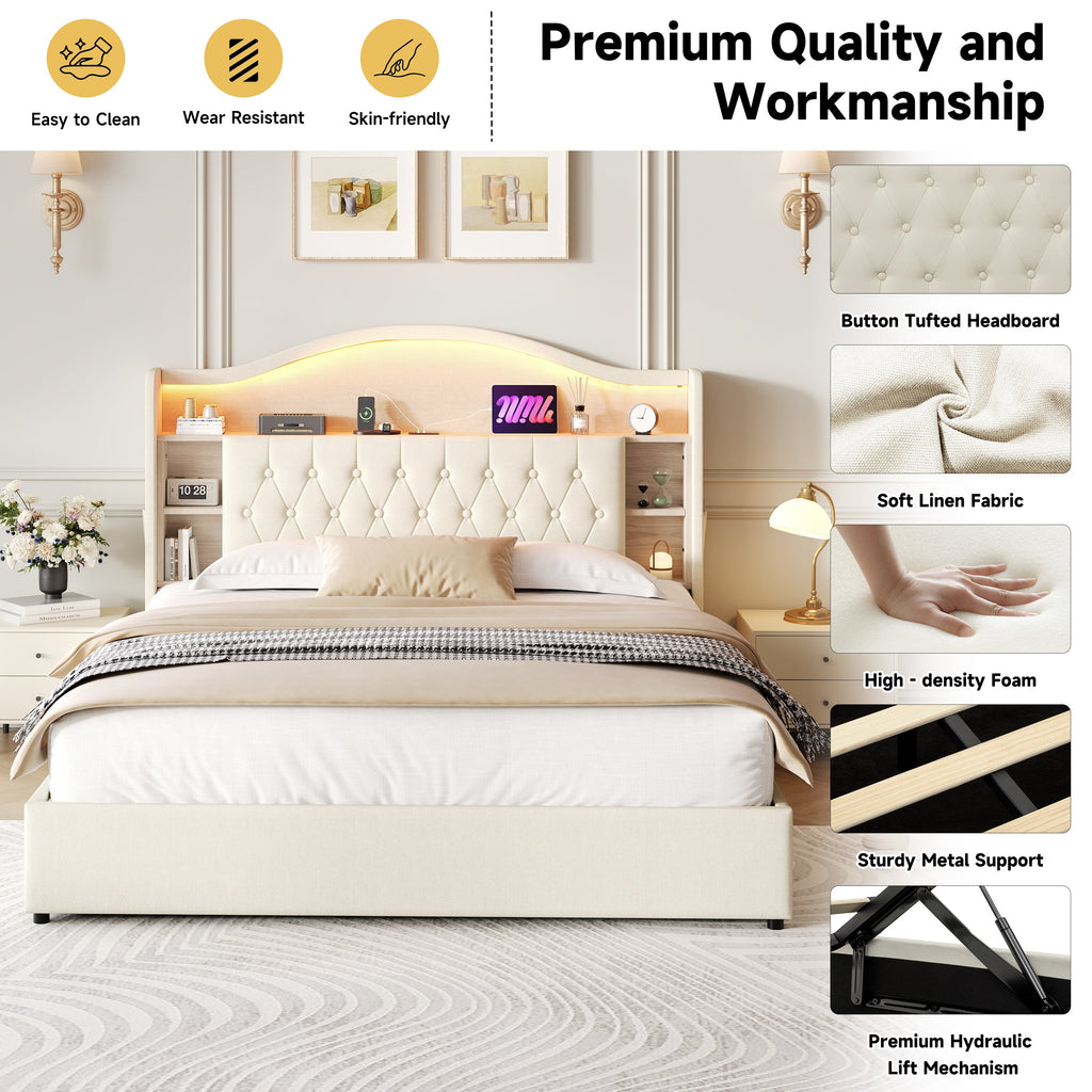 King Upholstered Bed Frame, Hydraulic Storage, LED Button Tufted Headboard w/ Charging Station, Linen Beige