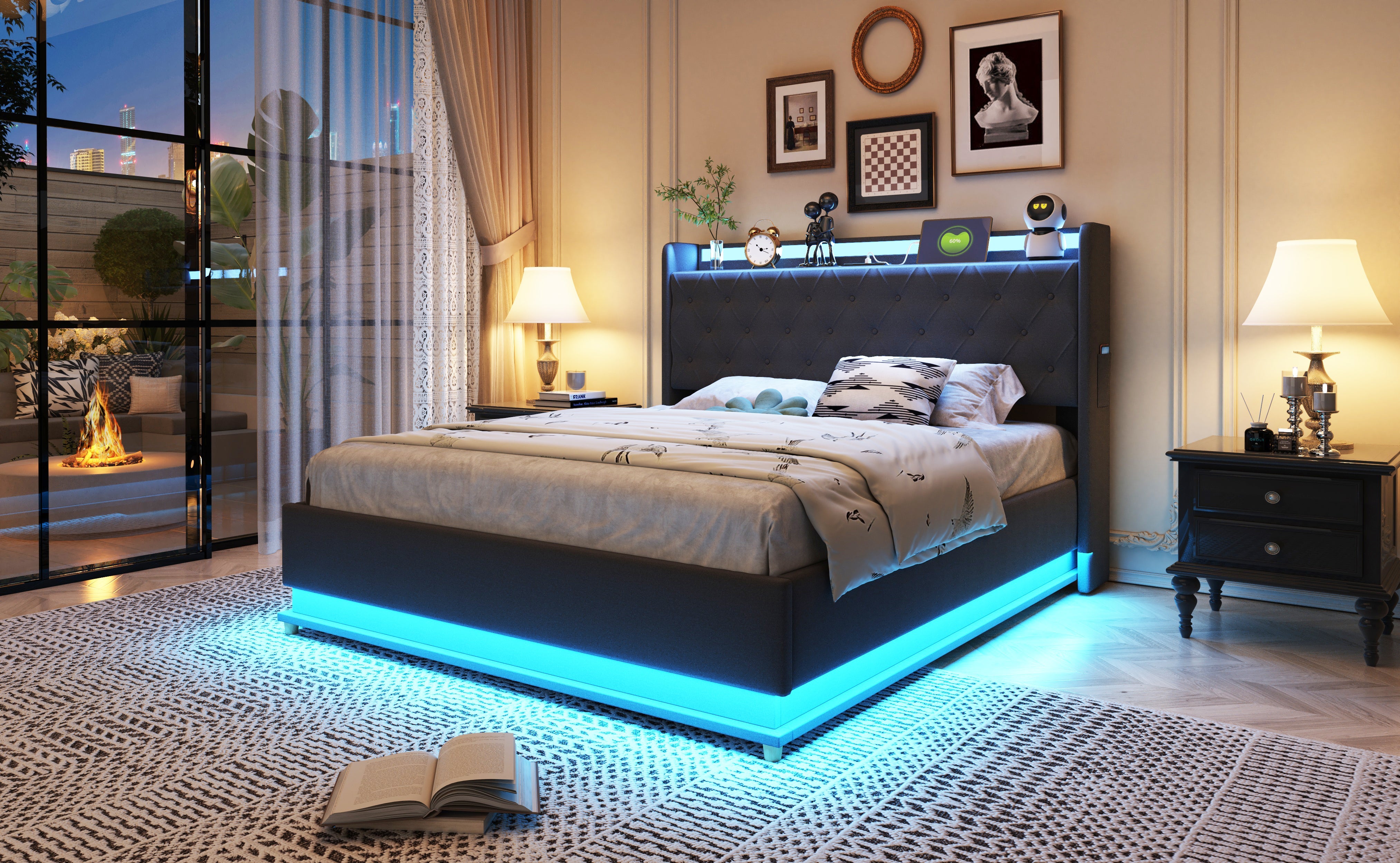 Upgrade your bedroom with our luxurious LED upholstered bed, featuring a built-in USB charging port and convenient hydraulic storage. Crafted from high-quality materials, this bed not only enhances your sleeping experience but also adds a touch of modern elegance to your space.