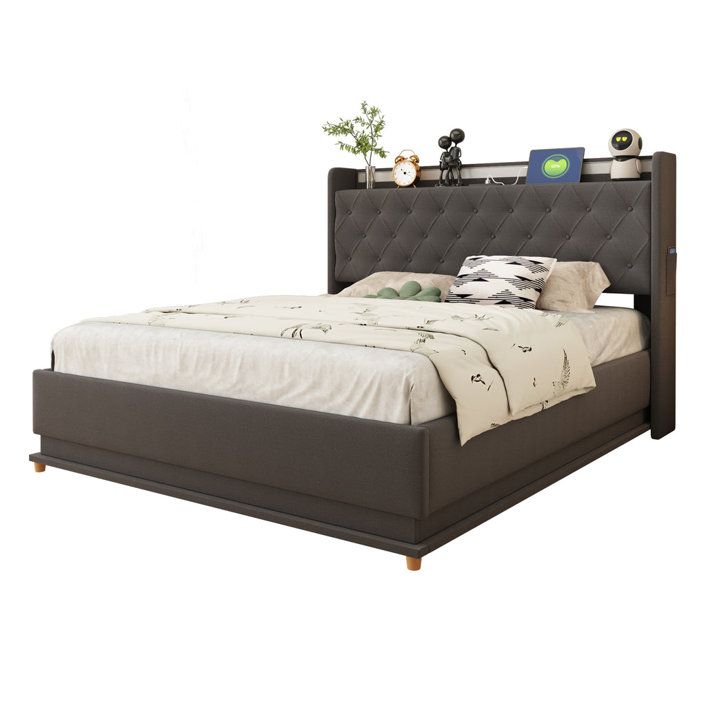 LED Upholstered Bed, USB Charging & Hydraulic Storage, Linen Fabric Gray