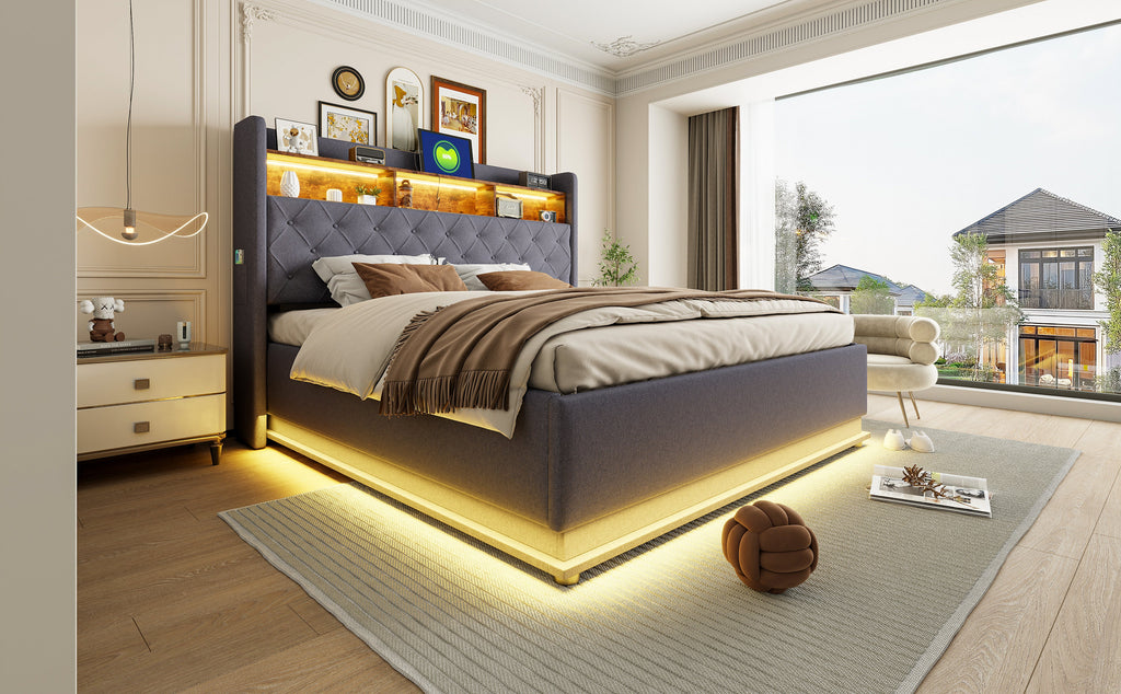 Enhance your bedroom with our luxurious LED upholstered bed, featuring integrated USB charging ports and convenient hydraulic storage. Crafted from high-quality materials, this bed not only elevates your sleeping experience but also adds a touch of modern elegance to your room.