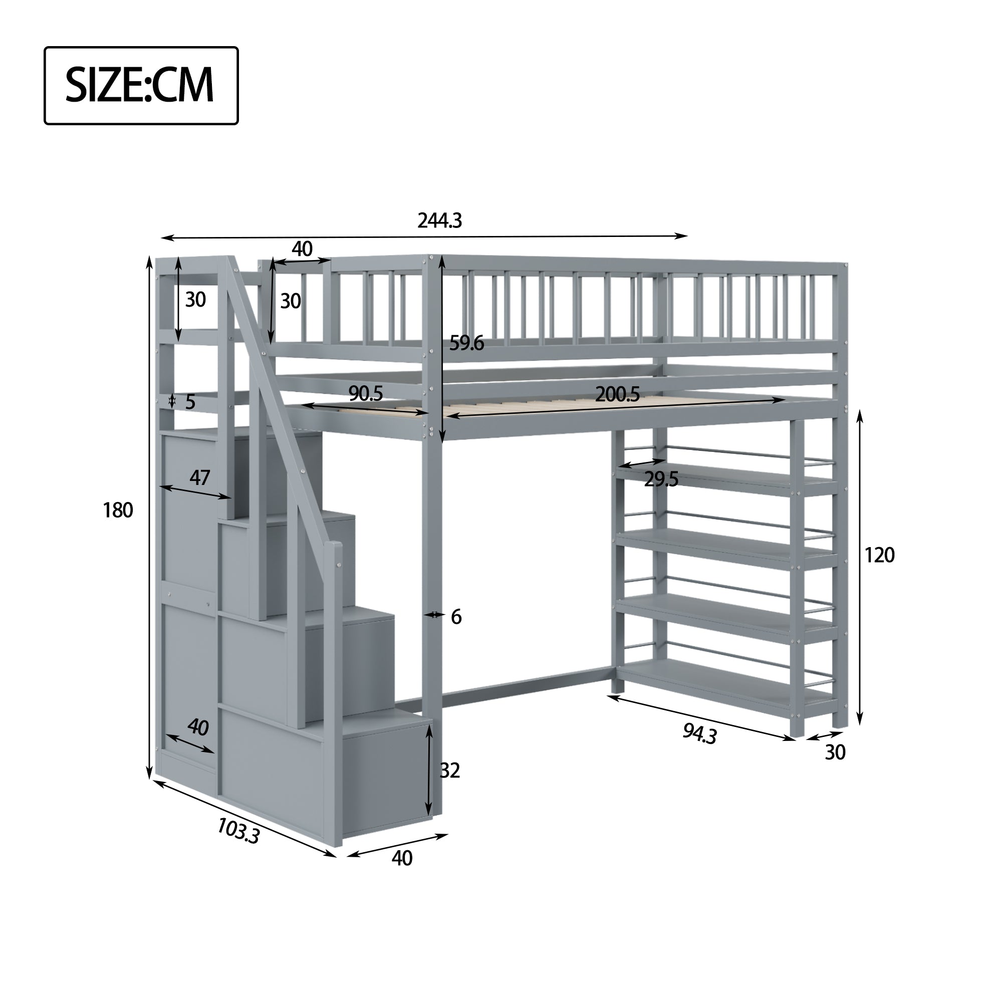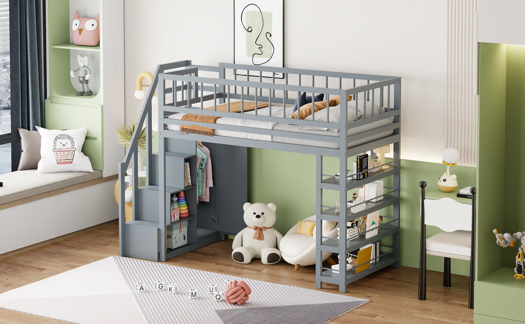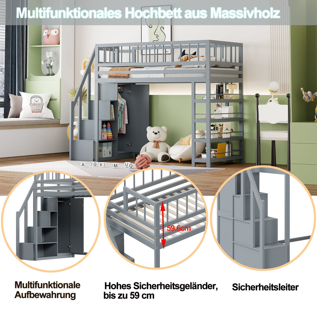 Loft Bed, 90 x 200, Wardrobe, Shelves, Storage, Safety Ladder, Solid Wood, Grey